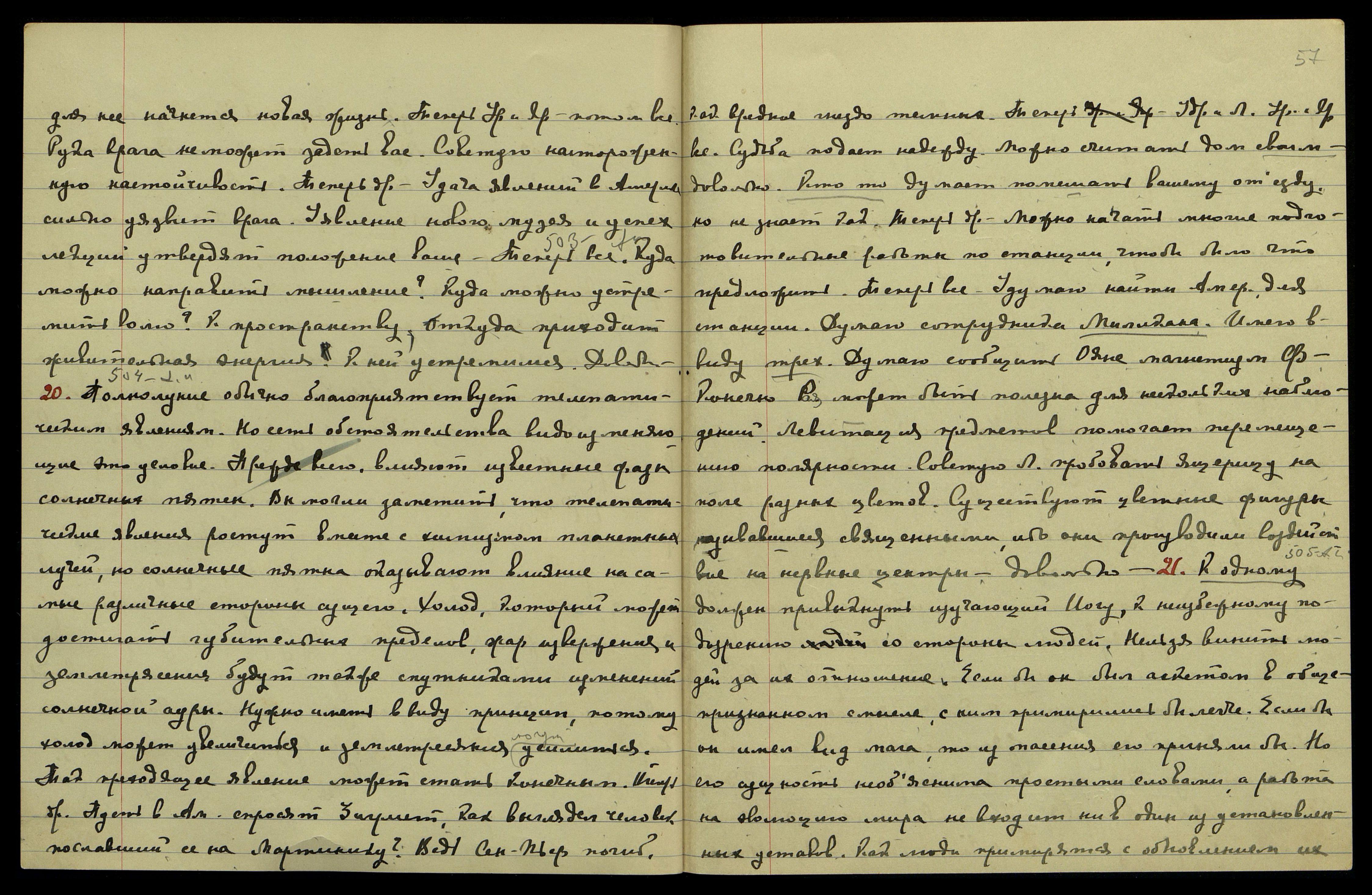 20 [февраля]. А[гни] Й[ога] § 504. Полнолуние обычно благоприятствует телепатическим явлениям. Но есть обстоятельства видоизменяющие это условие. Прежде всего, влияют известные фазы солнечных пятен. Вы могли заметить, что телепатические явления растут вместе с химизмом планетных лучей, но солнечные пятна оказывают влияние на самые различные стороны сущего. Холод, который может достигать губительных пределов, жар извержений и землетрясения будут также спутниками изменений солнечной ауры. Нужно иметь в виду принцип, потому холод может увеличиться и землетрясения могут усилиться. Так преходящее явление может стать конечным. Теперь др[угое]. Пусть в Ам[ерике] спросят Зигрист*, как выглядел человек, пославший ее на Мартинику**? Ведь Сен-Пьер*** погиб, как вредное гнездо темных. Теперь Удр[ая] и Л[юмоу], Урусвати и Яр[уя], все. Судьба подает надежду. Можно считать дом своим. Довольно. Кто-то думает помешать вашему отъезду, но не знает как. Теперь др[угое]. Можно начать многие подготовительные работы по станции, чтобы было, что предложить. Теперь все. Удумаю найти амер[иканца] для станции. Думаю, сотрудника Милликана. Имею в виду трех. Думаю, сообщить Ояне магнетизм Ф[уямы]. Конечно, Рая может быть полезна для нескольких наблюдений. Левитация предметов помогает перемещению полярности. Советую Л[юмоу] пробовать ящерицу на поле разных цветов. Существуют цветные фигуры, называвшиеся священными, ибо они производили воздействие на нервные центры. Довольно.