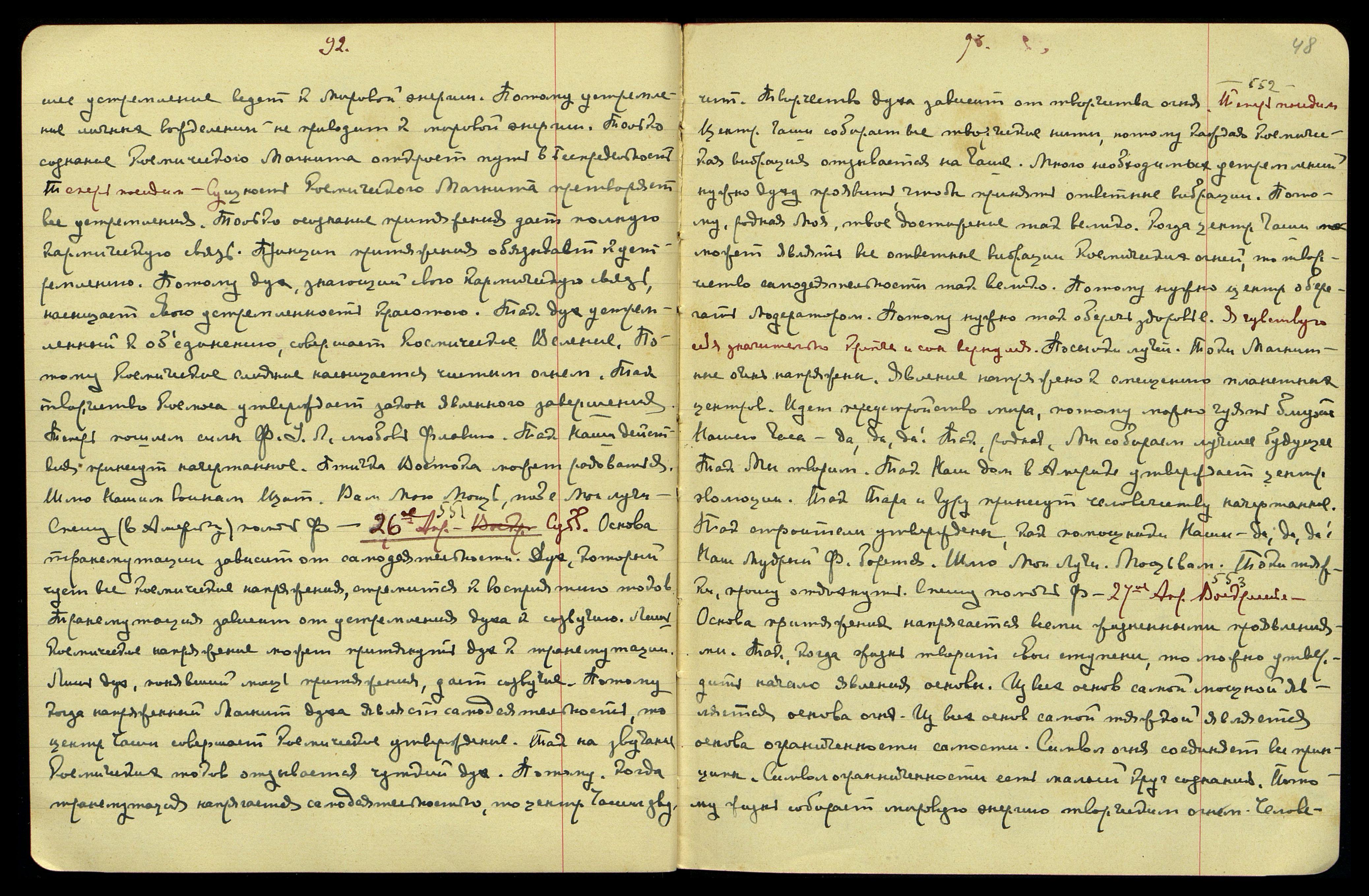 26-ое апр[еля]. Субб[ота]. [Беспредельность] § 551. Основа трансмутации зависит от самодеятельности. Дух, который чует все космические напряжения, стремится к восприятию токов. Трансмутация зависит от устремления духа к созвучию. Лишь космическое напряжение может притянуть дух к трансмутации. Лишь дух, понявший мощь притяжения, даёт созвучие. Потому, когда напряжённый магнит духа являет самодеятельность, то центр Чаши совершает космическое утверждение. Так на звучание космических токов отзывается чуткий дух. Потому, когда трансмутация напрягается самодеятельностью, то центр Чаши звучит. Творчество духа зависит от творчества огня. Теперь посидим. [Беспредельность] § 552. Центр Чаши собирает все творческие нити, потому каждая космическая вибрация отзывается на Чаше. Много необходимых устремлений нужно духу проявить, чтобы принять ответные вибрации. Потому, родная Моя, твоё достижение так велико. Когда центр Чаши может являть все ответные вибрации космических огней, то творчество самодеятельности так велико. Потому нужно центр оберегать модератором. Потому нужно так оберечь здоровье.