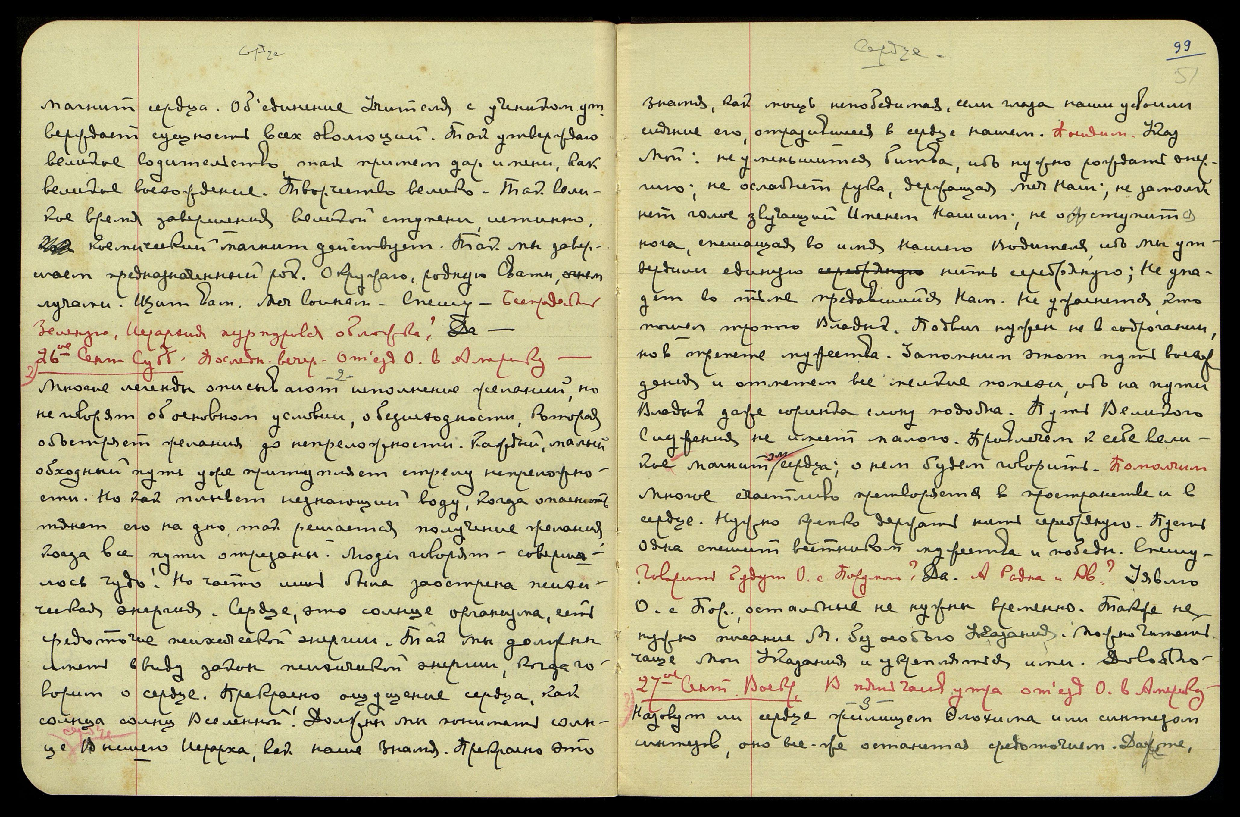 25-ое сент[ября]. Пятн[ица]. Книга "Сердце" § 1. Видеть глазами сердца; слышать гул мира ушами сердца; прозревать будущее пониманием сердца; помнить прошлые накопления сердцем − так нужно стремительно идти путём восхождения. Творчество обнимает огненный потенциал и насыщается сокровенным огнём сердца. Потому на пути к Иерархии, на пути к великому Служению, на пути общения синтез есть единый светлый путь сердца. Как излучать явленные лучи, если нет пламени, утверждённого в сердце? Именно, свойство магнита заложено в сердце. Творчество высшее насыщается этим великим законом. Так каждое завершение, каждое объединение, каждое великое космическое единение совершается пламенем сердца. Чем можем заложить основание великих ступеней? Истинно, лишь сердцем. Так дуги сознания сливаются в пламени сердца. Посидим. Так мы запомним о прекрасном притяжении магнита сердца, который соединяет все явления. Истинно, серебряная нить соединения Учителя с учеником есть великий