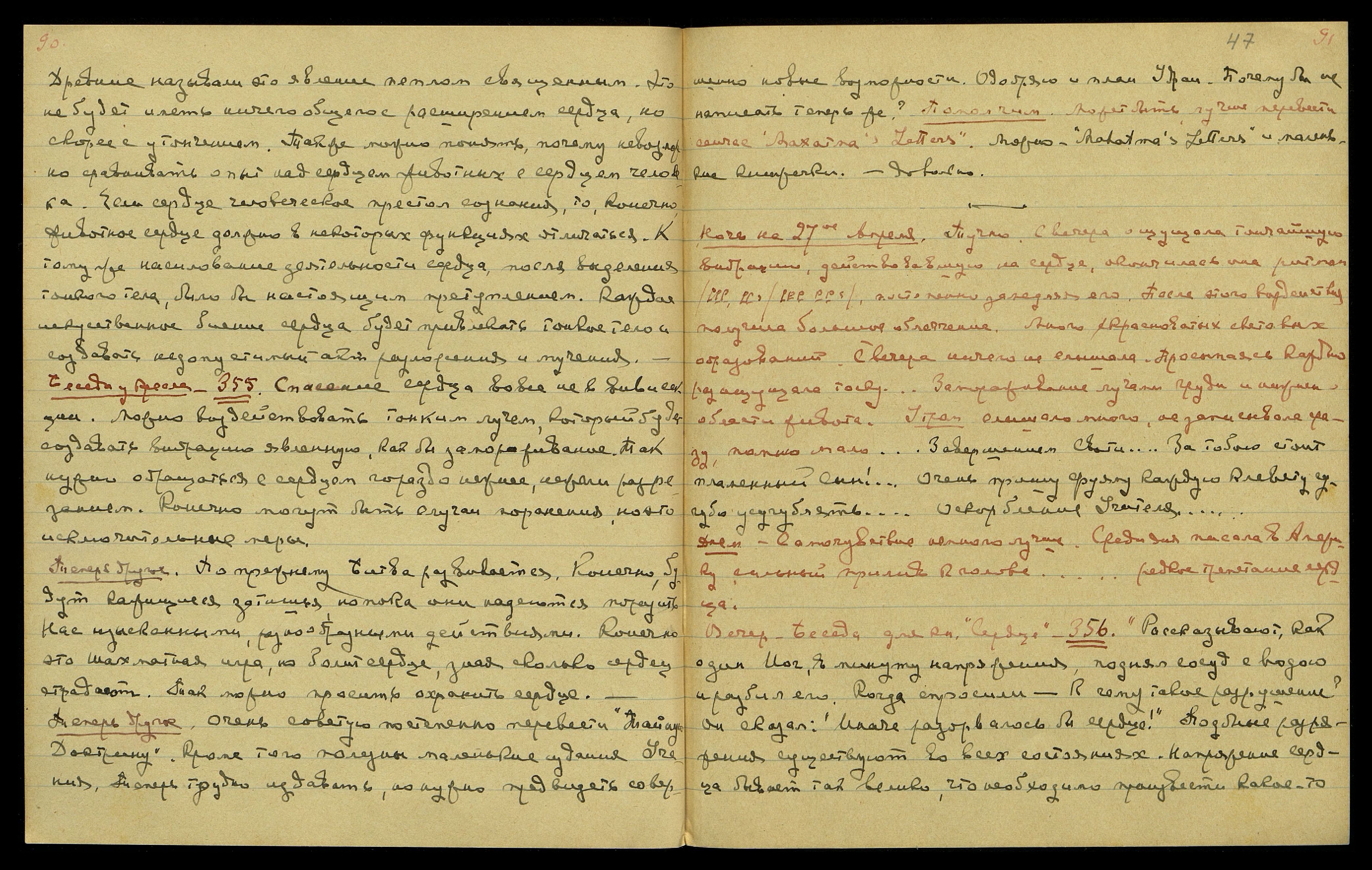 Ночь на 27-ое апреля. Тучно. С вечера ощущала тончайшую вибрацию, действующую на сердце, окончилась она ритмом [нотная запись], постепенно замедляя его. После этого воздействия получила большое облегчение. Много красноватых, световых образований. С вечера ничего не слышала. Просыпаясь, каждый раз ощущала тоску... Замораживание лучами груди и нижней области живота. Утром слышала много, не записывала сразу, помню мало. "Завершением Свати... За тобою стоит пламенный сын!... Очень прошу Фуяму каждую клевету сугубо усугублять... Оскорбление Учителя..."