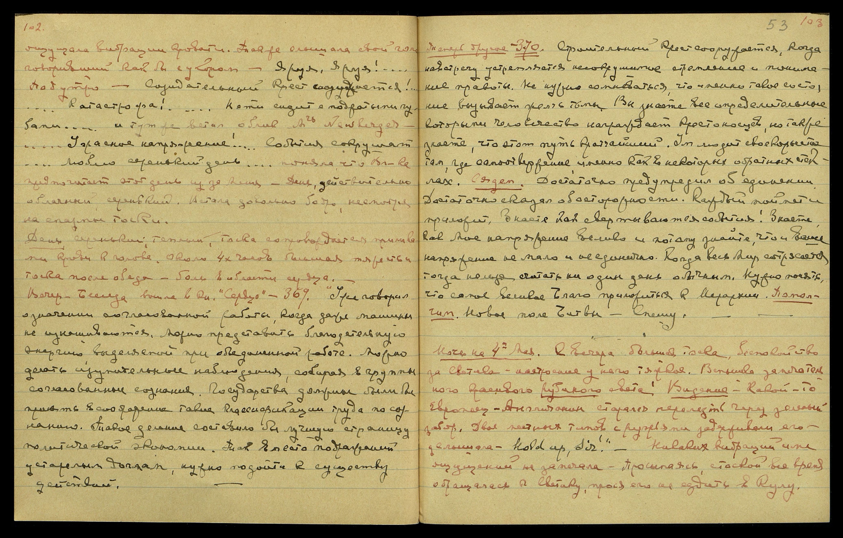 Под утро: "Созидательный крест сооружается!... Катастрофа!... Нети сидит с поджатыми губами..." И тут же встал облик Mrs. Newberger... "Ужасное напряжение!... События сокрушат... Люблю серенький день..." Поняла, что Вл[ады]ка предпочитает этот день из-за меня. День, действительно, облачный, серенький. Встала довольно бодро, несмотря на спазмы тоски.