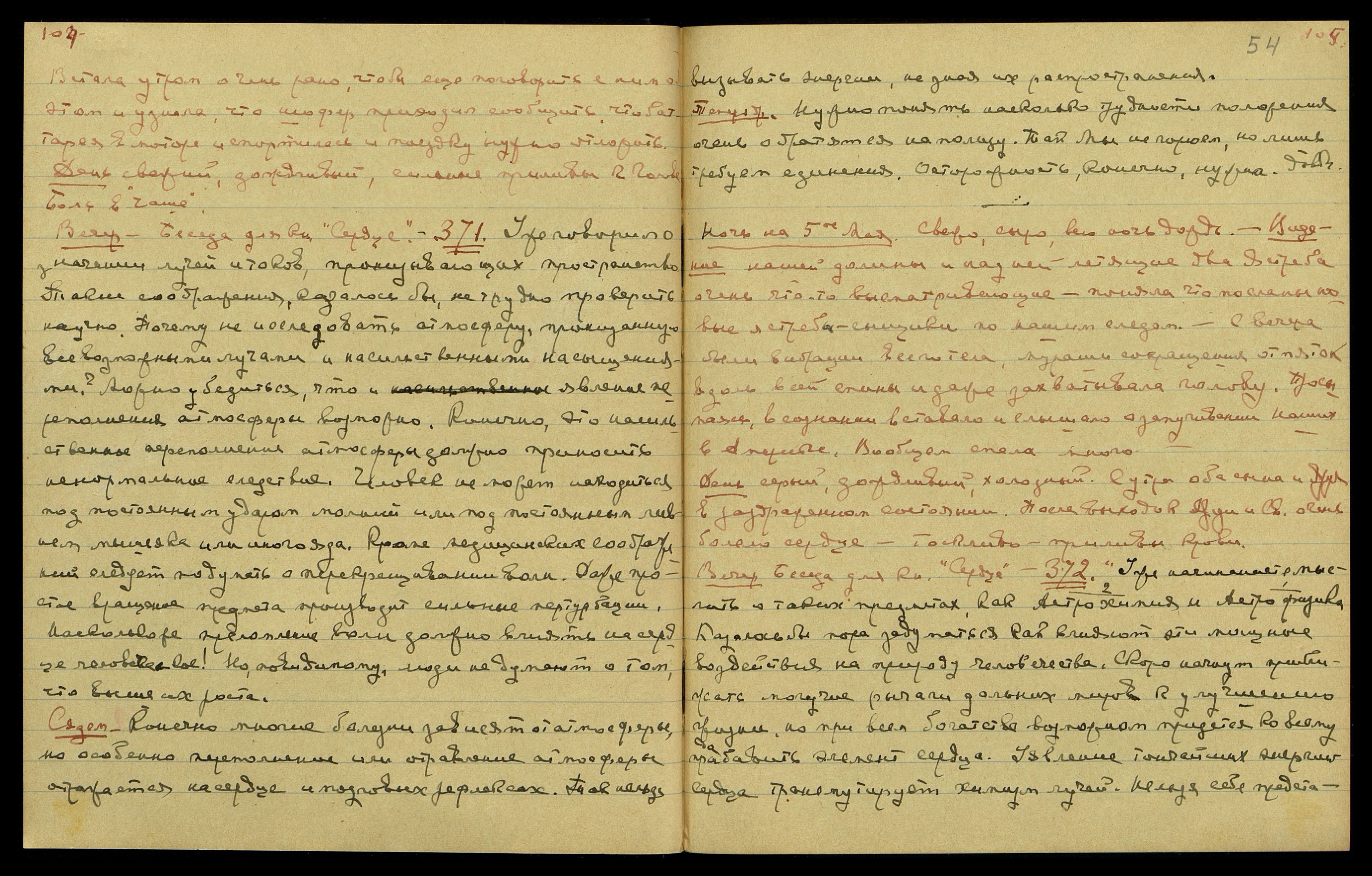 Вечер. Беседа для кн[иги] "Сердце" § 371. Уже говорил о значении лучей и токов, пронизывающих пространство. Такие соображения, казалось бы, нетрудно проверить научно. Почему не исследовать атмосферу, пронизанную всевозможными лучами и насильственными насыщениями? Можно убедиться, что и явление переполнения атмосферы возможно. Конечно, это насильственное переполнение атмосферы должно приносить ненормальные следствия. Человек не может находиться под постоянным ударом молний или под постоянным ливнем мышьяка или иного яда. Кроме медицинских соображений, следует подумать о перекрещивании волн. Даже простое вращение предмета производит сильные пертурбации. Насколько же преломление воли должно влиять на сердце человеческое! Но по-видимому, люди не думают о том, что выше их роста.