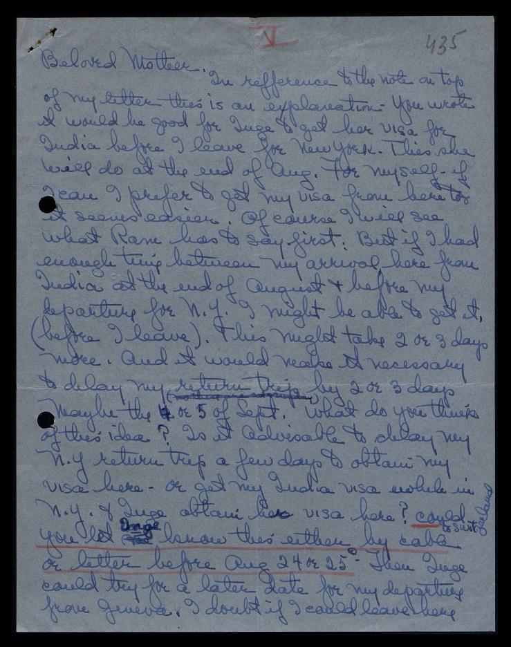In reference to the note on top of my letter this is an explanation. You wrote it would be good for Inge to get her visa for India before I leave for N[ew] [ York]. This she will do at the end of August. For myself, if I can I prefer to get my visa from here too it seems easier. Of course, I will see what Ram has to say first. But if I had enough time between my arrival here from India at the end of August and before my departure for N[ew] Y[ork] I might be able to get it (before I leave). This might take two or three days more. And it would make it necessary to delay my return trip by two or three days, maybe the fourth or fifth of September. What do you think of this idea? Is it advisable to delay my N[ew] [York] return trip a few days to obtain my visa here or get my India visa while in N[ew Y[ork] and Inge obtain her visa here? Could you let Inge know this either by cable or letter before August 24 or 25. Then Inge could try for a later date for my departure for Geneva. I doubt if I could leave here