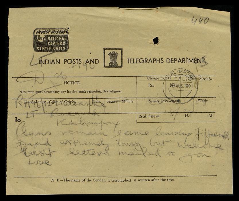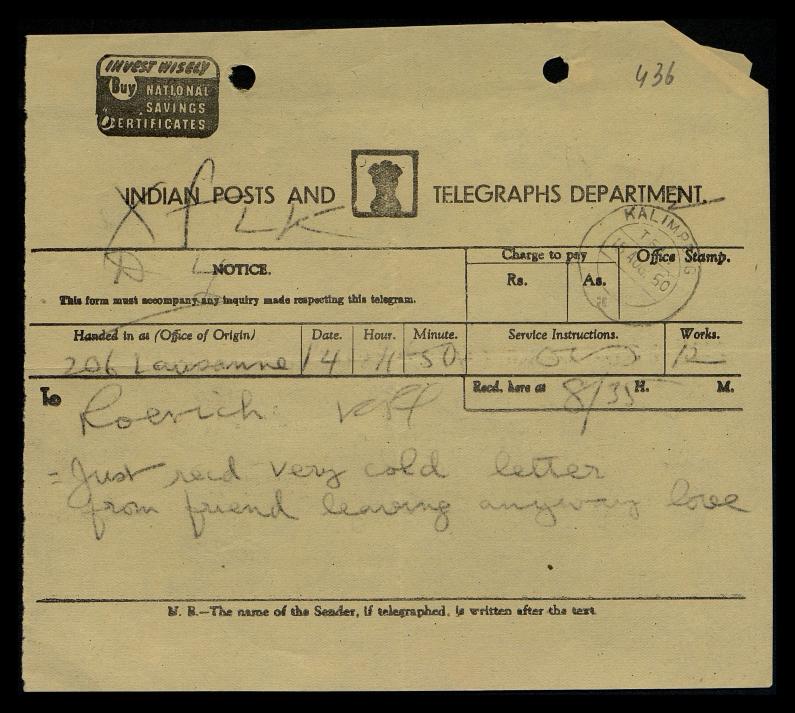 [англ.: Ограничения ещё не вступили в силу, и, пожалуйста, не говорите об этом никому, пока это не появится в газете. Я полагаю, это было написано мне по секрету. Я не уверена, но думаю, что впереди ещё много изменений. Как своевременны советы В[еликого] Вл[адыки]. Я чувствовала себя такой одинокой, не в духе или сердце. Пока не знала, как связаться с ним. Думая, что он в Калькутте, я сначала позвонила туда, а потом позвонила ему домой сегодня, и он был там и прислал мне письмо, которое я получила несколько часов назад.