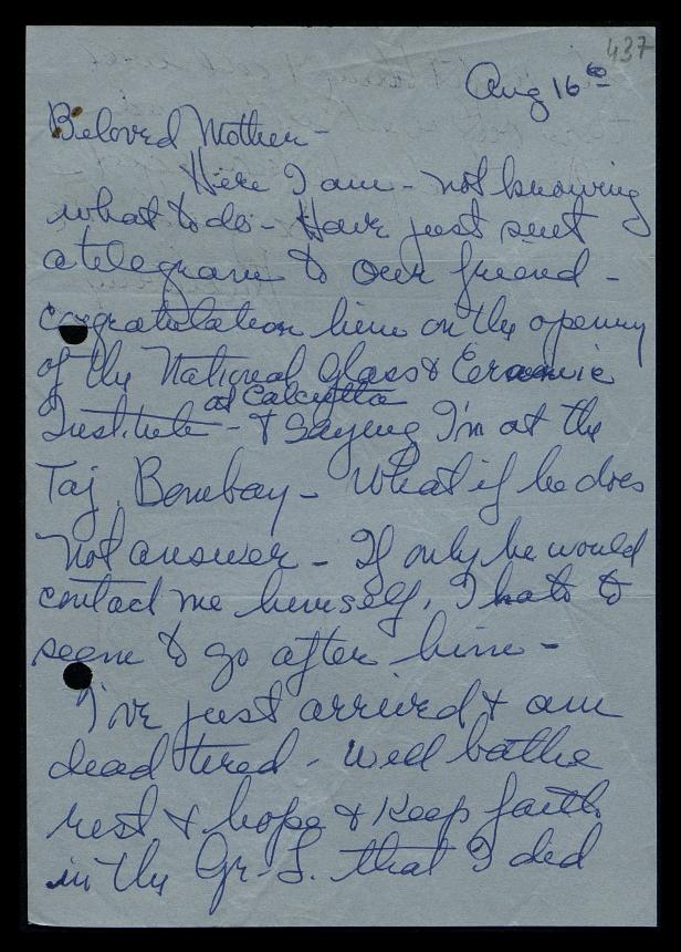 Here I am not knowing what to do. Have just sent a telegram to our friend congratulating him on the opening of the National Glass and Ceramic Institute of Calcutta and saying I’m at the Taj [Mahal Hotel] in Bombay. What if he does not answer? If only he would contact me himself. I hate to seem to go after him.