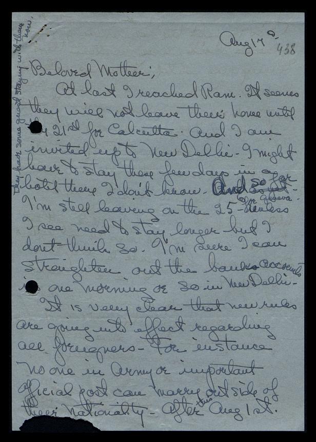 Что касается примечания в верхней части моего письма, то это объяснение. Вы написали, что было бы неплохо, если бы Инге получила визу в Индию до моего отъезда в Нью-Йорк. Она сделает это в конце августа. Что касается меня, то, если смогу, я тоже предпочту получить визу отсюда, это кажется проще. Конечно, сначала посмотрим, что скажет Рам[и]. Но если бы у меня было достаточно времени между моим приездом сюда из Индии в конце августа и моим отъездом в Н[ью]-Й[орк], я, возможно, смогла бы получить её (до того, как уеду). Это может занять ещё два-три дня. Для этого пришлось бы отложить мою обратную поездку на два-три дня, может быть, на четвертое или пятое сентября. Что Вы думаете об этой идее? Целесообразно ли отложить мою поездку в Н[ью]-Й[орк] на несколько дней, чтобы получить визу здесь, или получить её в Н[ью]-Й[орке], а Инге получить визу здесь? Не могли бы Вы сообщить об этом Инге телеграммой или письмом до 24 или 25 августа. Тогда Инге могла бы попробовать организовать более позднюю дату моего отъезда в Женеву. Сомневаюсь, что я смогу уехать отсюда]