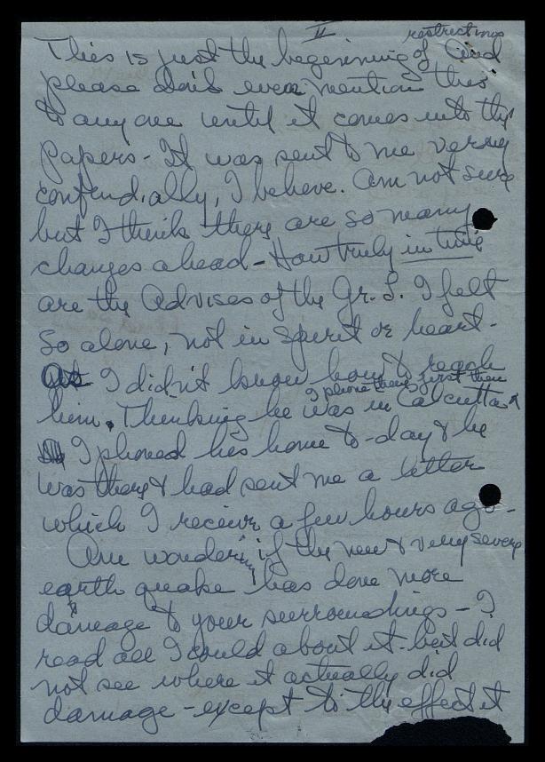 This is just the beginning of restrictions, and please don’t even mention this to anyone until it comes into the paper. It was sent to me very confidentially, I believe. I am not sure but I think there are so many changes ahead. How truly in time are the advices of the Gr[eat] L[ord]. I felt so alone, not in spirit or heart. As I didn’t know how to reach him. Thinking he was in Calcutta, I phoned there first, and then I phoned his home today, and he was there and had sent me a letter that I received a few hours ago.