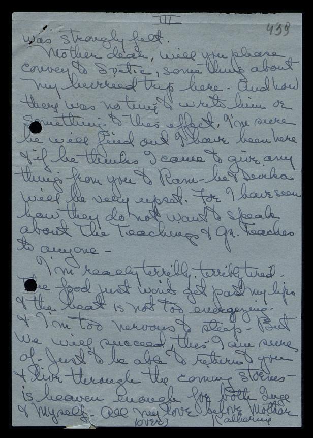 Mother dear, will you please convey to Svetic something about my hurried trip here? And how there was no time to write him or something to this effect. I’m sure he will find out I have been here, and if he thinks I came to give anything from you to Rami, he and Devika will be very upset. For I have seen how they do not want to speak about the Teachings and Gr[eat] Teacher to anyone.