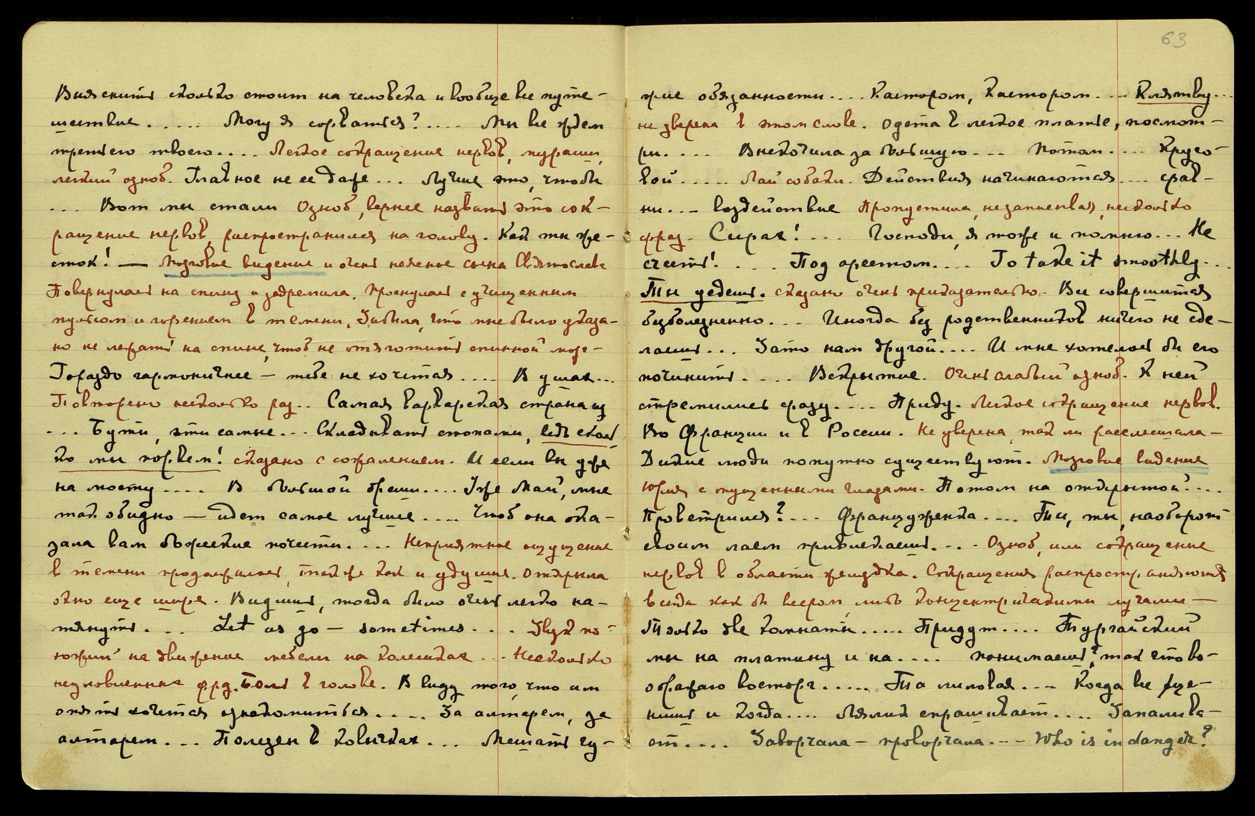 Ночь на 26-ое апреля, суббота. Вечером опять несколько нервных нападок Светика. Гроза, дождь, как град, барабанил под окном, по железной крыше террасы, но всё это слышать не мешало. "Альфа и Омега оставляли у вас... Опять в удел... Конфуциус напишет... I wish to supply it also [англ.: Я также хочу представить его]... Или ты врёшь, или мы все врем!.. Ich habe [нем.: У меня есть]... гармонию... мировому... Не могу обещать... Открыто тебе многое... Обалделый... Тоже в ванну... Фигого, такого цвета... Доверяют... Чувствую,