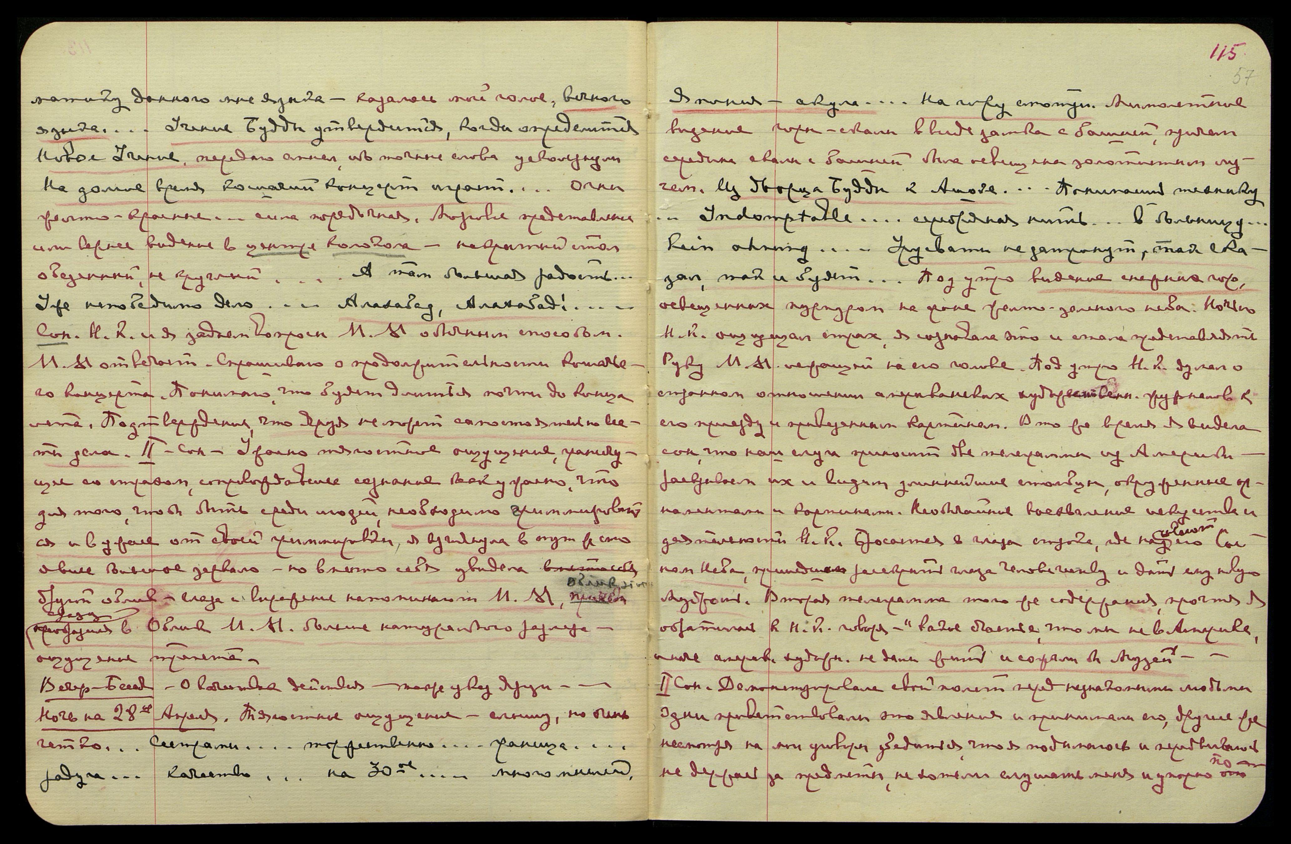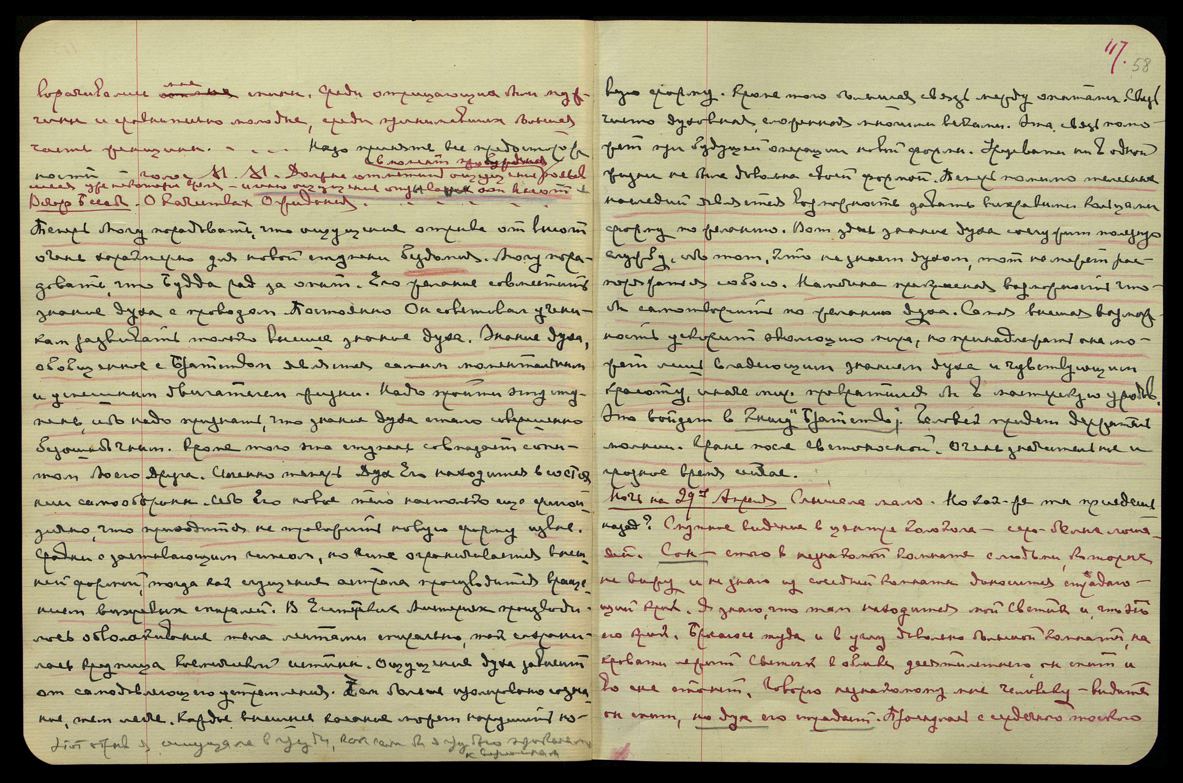 Ночь на 1-ое мая. Очень плохие известия из Америки, взаимное непонимание, отказ Рокф[еллера]... "Чую книги автора привет... У меня нет ребёнка, а у них всё*". Видение скал с постройками. "В России несказанно нарастает... беспощадно". Вспышки огней. Видение: скопление зловещих красных огней, но и ряды сине-серебряных. "Зловещие... он прав. Помни 215-ый..."