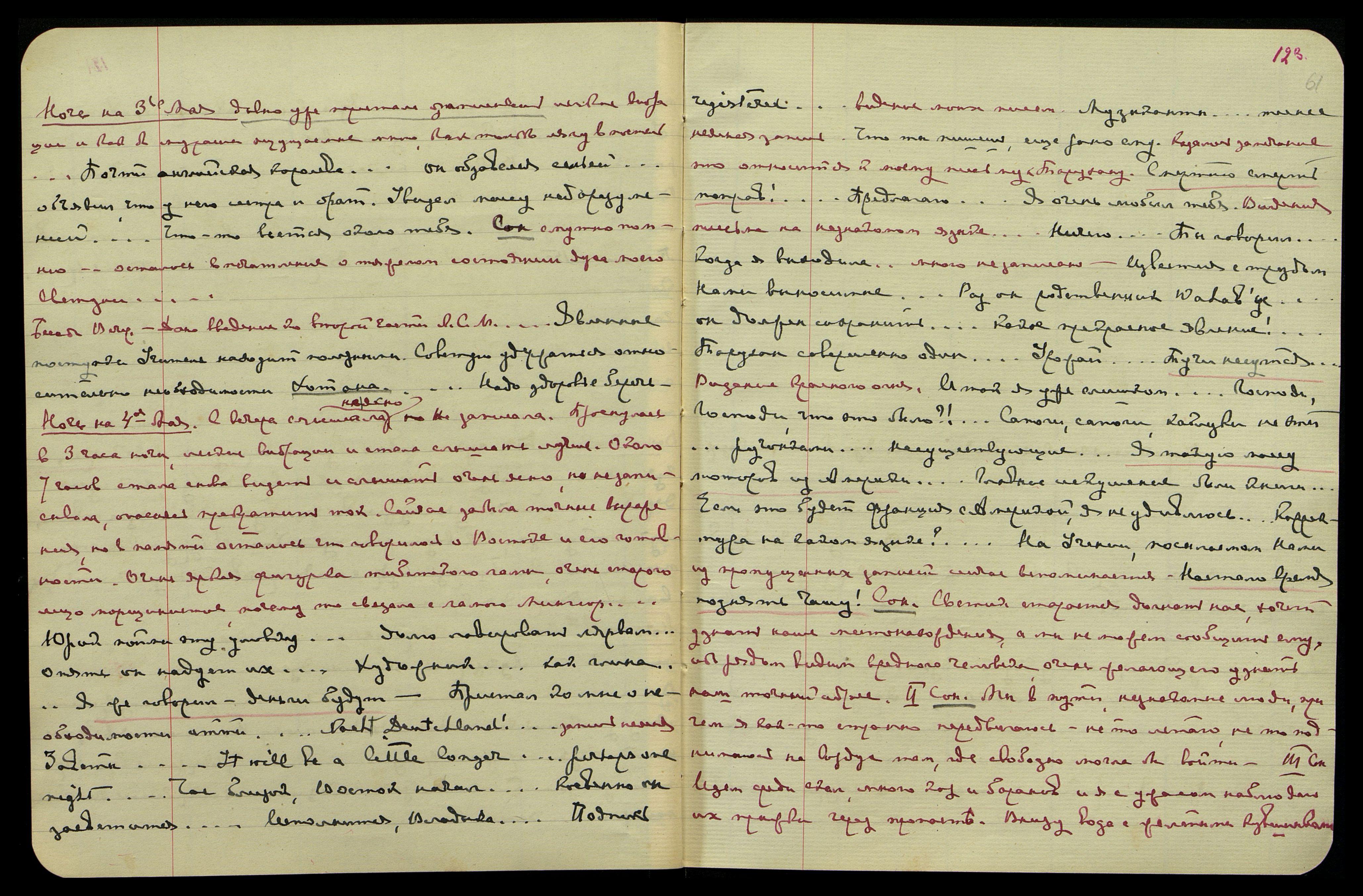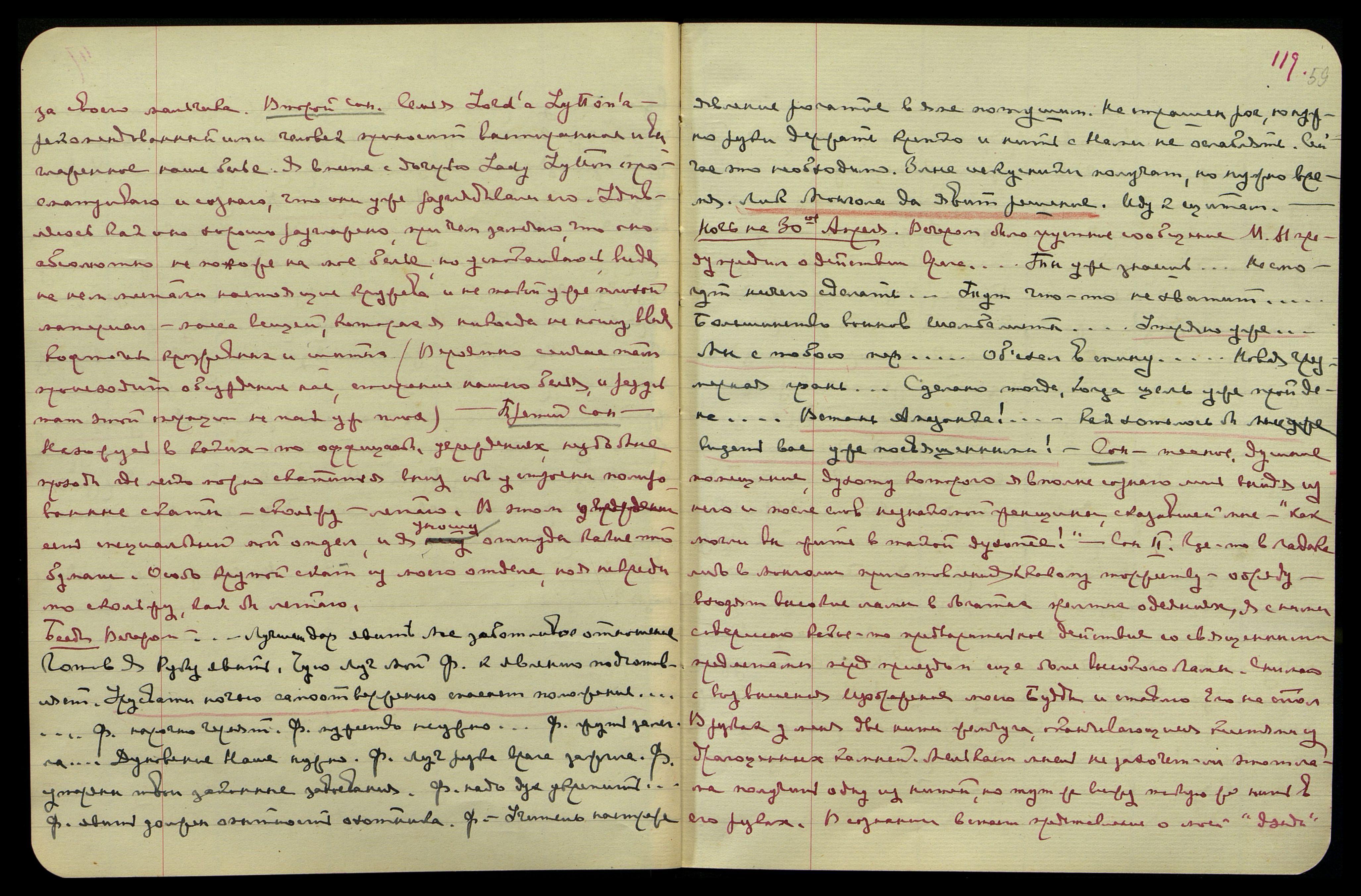 Второй сон: Семья Lord'a Lytton'a. Рекомендованный ими человек приносит выстиранное и выглаженное наше бельё. Я вместе с дочерью Lady Lytton просматриваю и сознаю, что они уже разглядывали его. Удивляюсь, как хорошо оно разглажено, причём, замечаю, что оно абсолютно не похоже на моё бельё, но успокаиваюсь, видя на нём местами настоящие кружева и не такой уже плохой материал; масса вещей, которых я никогда не ношу [одно слово неразборчиво] кофточек кружевных и шитых. (Вероятно, сейчас там происходит обсуждение нас, стирание нашего белья, и результат этой операции не так уж плох). Третий сон: нахожусь в каких-то официальных учреждениях, [два слова неразборчиво], где легко можно скатиться вниз, ибо устроены полированные скаты − скольжу − летаю. В этом учреждении есть специальный мой отдел, и я уношу оттуда какие-то бумаги. Особо крутой скат из моего отдела, но я невредимо скольжу, как бы летаю.