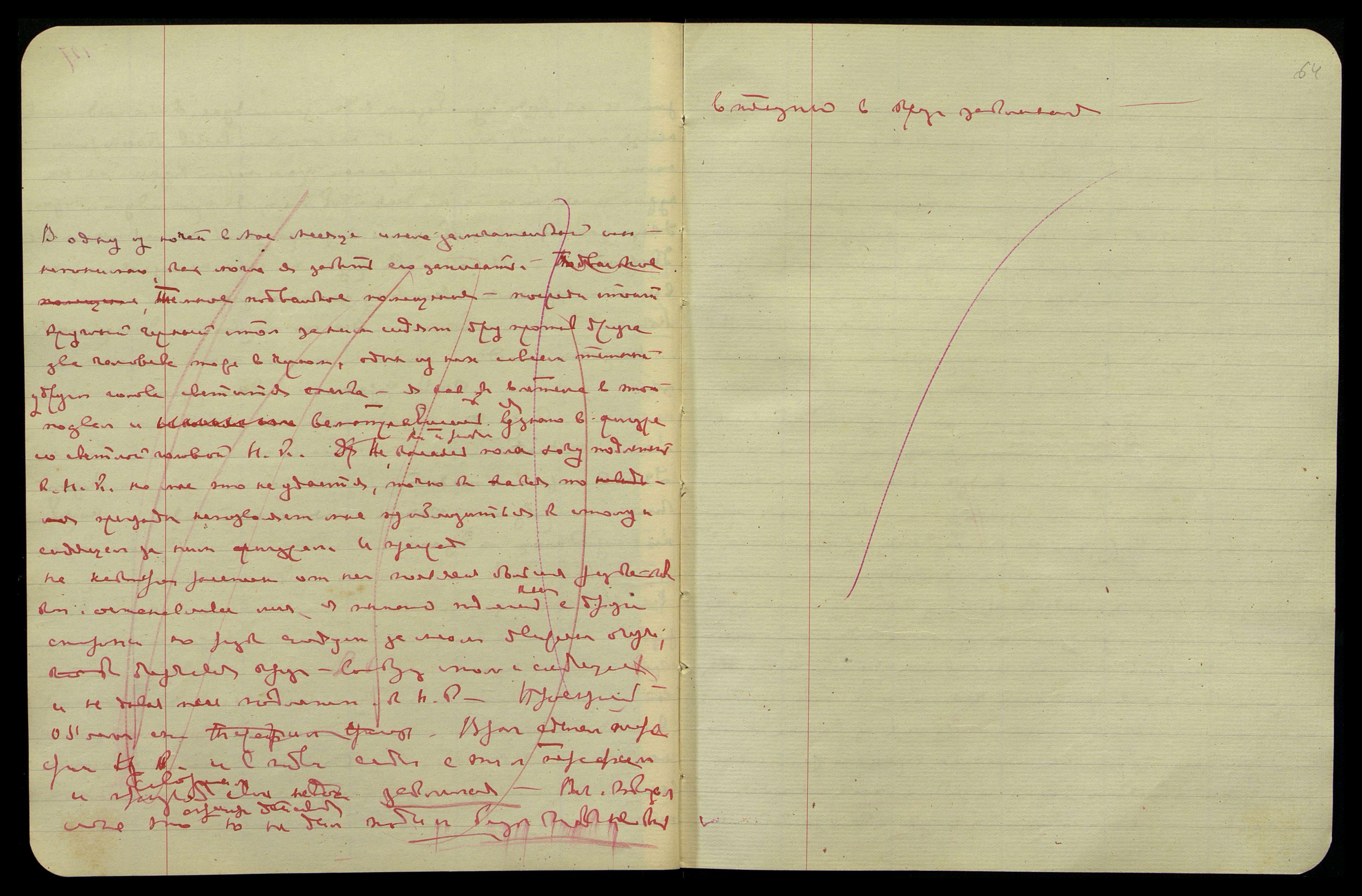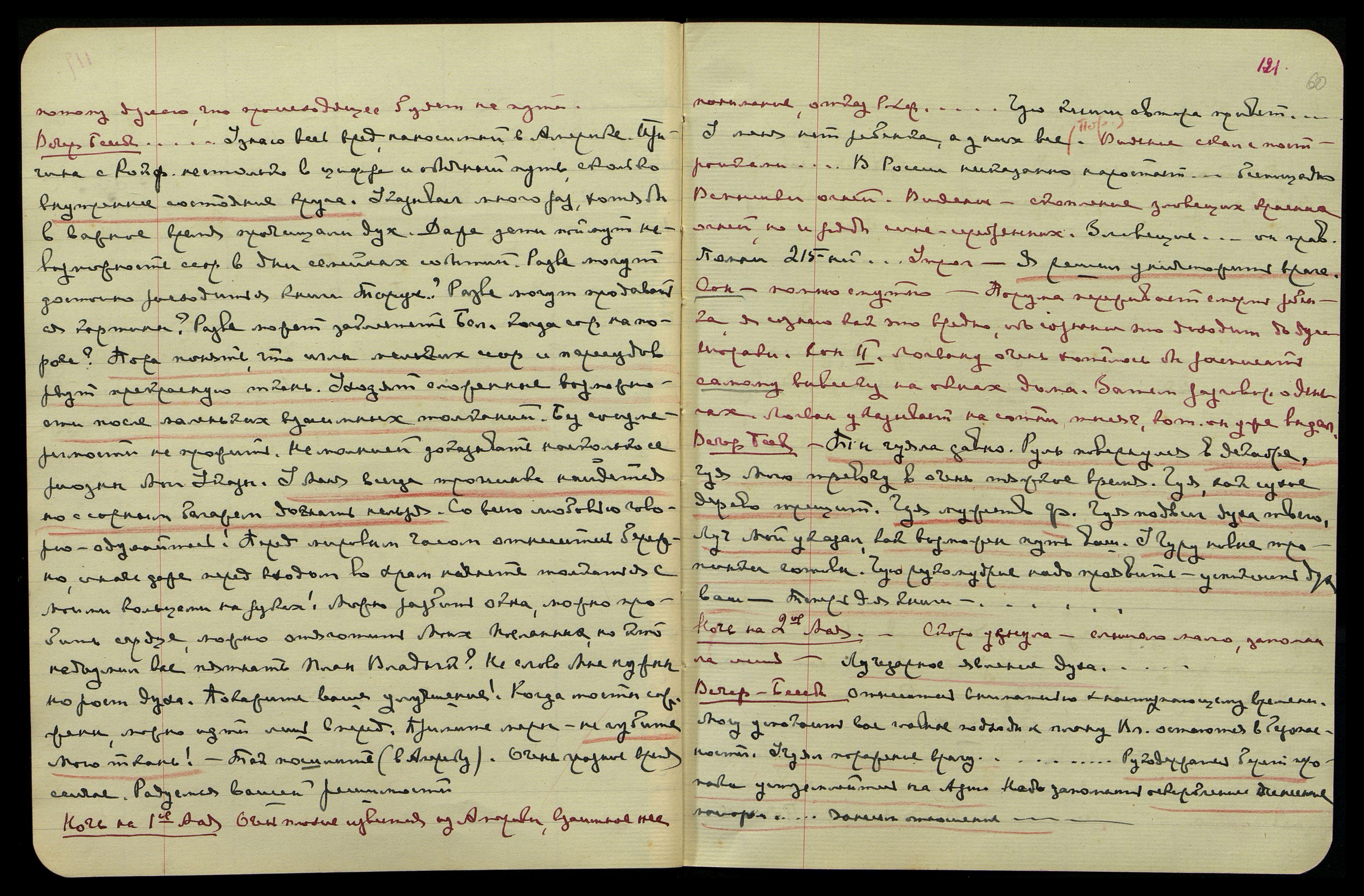 Несмотря на большее расстояние, ощущаю их изумительный аромат. Встреча с какими-то людьми, я очень неохотно знаком[люсь] с ними. Мужчина старый, в европейском пальто и котелке, тип польского еврея, фамилию запомнила плохо, вроде − Равинский. Женщина с ним − высокая, пожилая, вся в чёрном. Видение записи чёрным на пурпуре, запись шла вкось очень мелким и частым шрифтом, казалось, по-немецки, но латинскими буквами, − сейчас же видение лица круглого, с тяжёлым подбородком и маленькими глазами − восточного типа − рассмотреть хорошо не смогла, была разбужена скрипом открывавшейся двери.