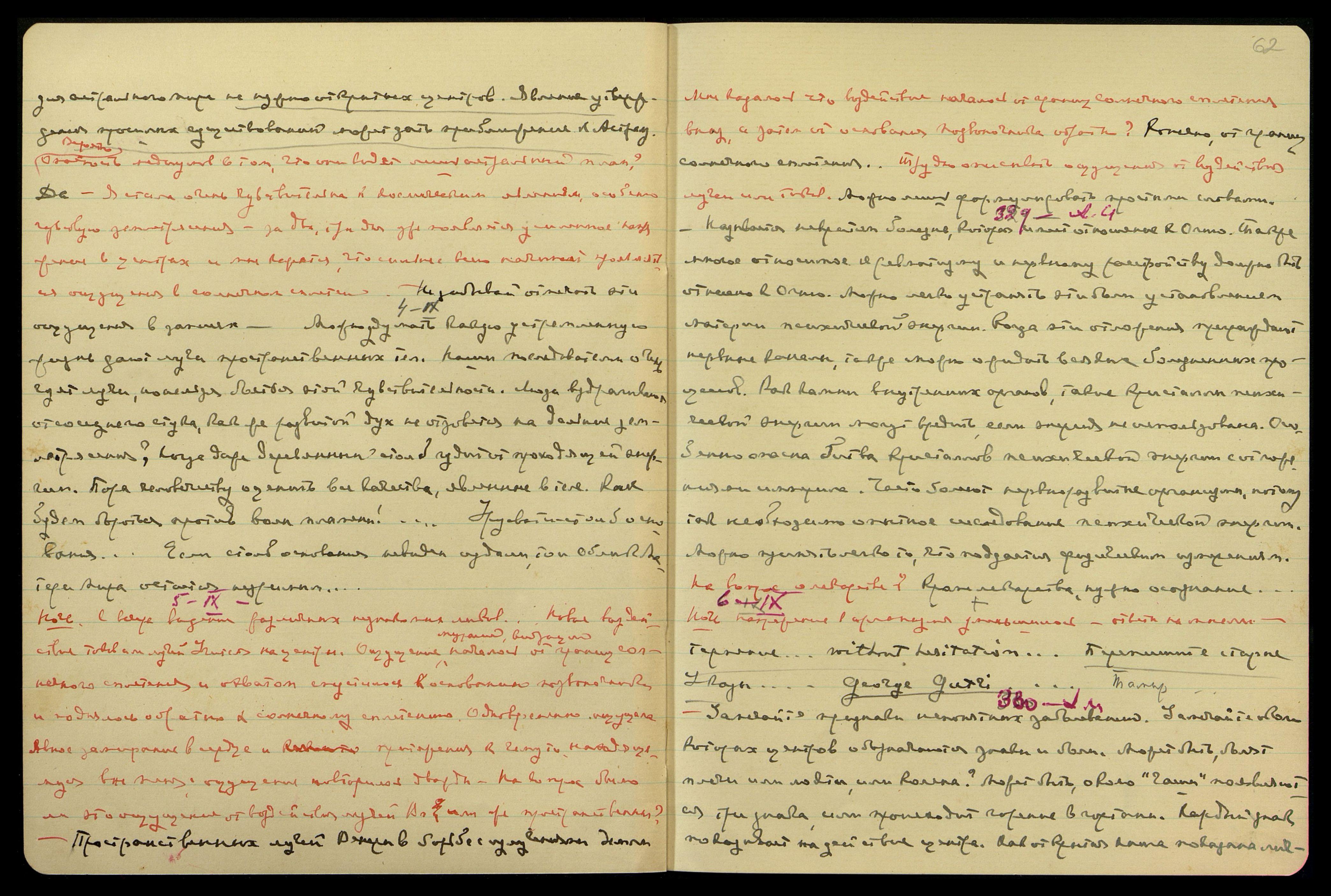 13/14-IX. Ночь. С вечера стала слышать, как только легла в постель. "К отмеченной пламенем сердца (Урусвати)", − не совсем ясно послед[окончание слова неразборчиво]. "Источник за источником... Считавшаяся подругой детства Урусвати..." Серебряный свет, скорее пламя, внутри меня между глазами и гортанью. "Ты невнимательна ко мне", − казалось, сказано Учителем. Тоска сжала сердце... "Оценена... жестоко..." Мимолетное видение официального помещения и двух англичан.