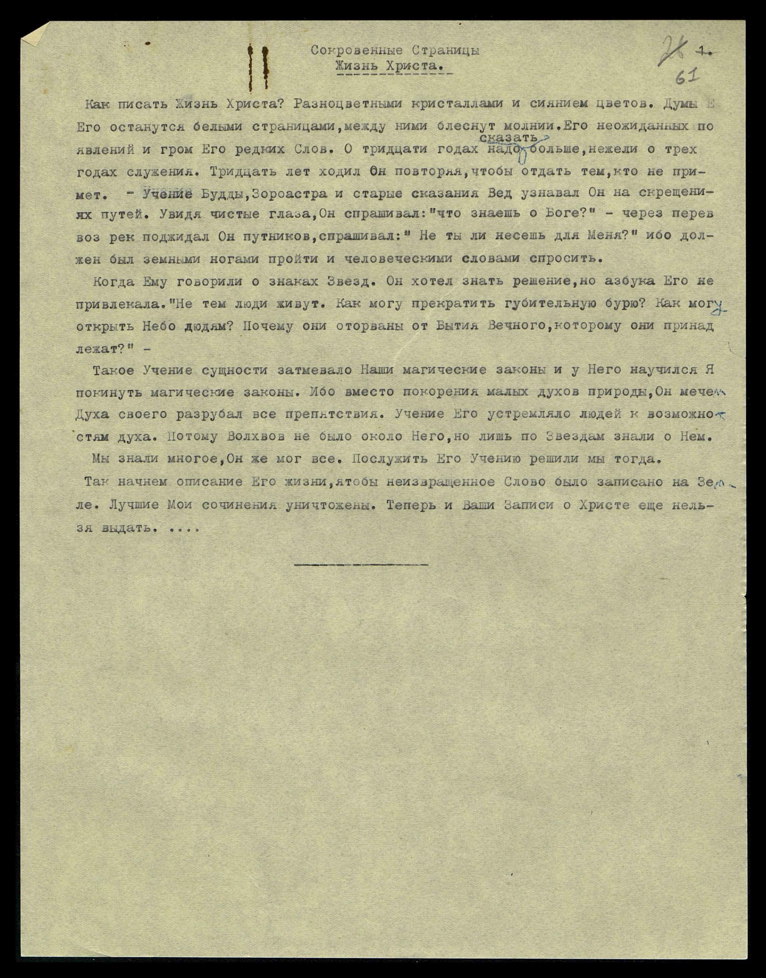 Так начнем описание Его жизни, чтобы не извращенное Слово было записано на Земле. Лучшие Мои сочинения уничтожены. Теперь и Ваши Записи о Христе еще нельзя выдать...