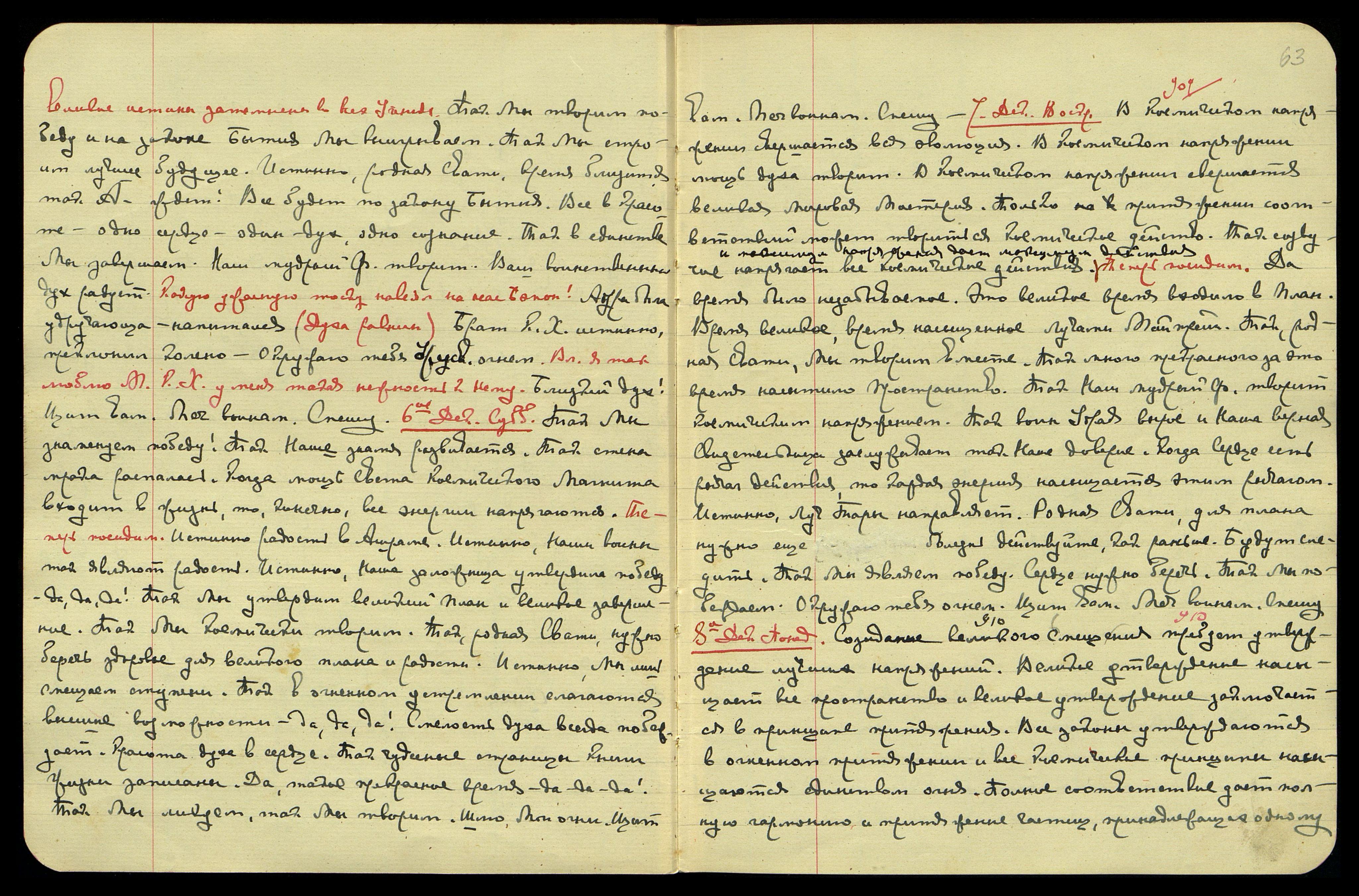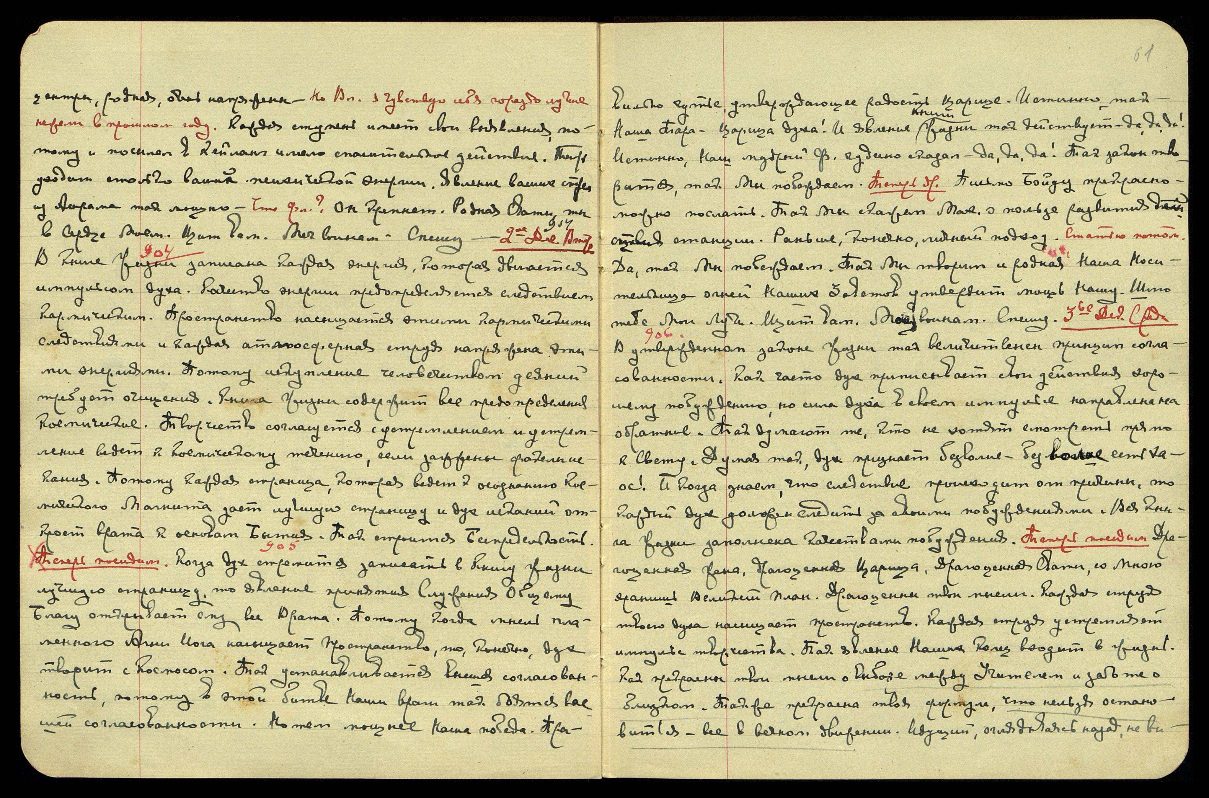 8-ое дек[абря]. Понед[ельник]. [Беспредельность] § 910. Созидание великого смещения требует утверждение лучших напряжений. Великое утверждение насыщает всё пространство, и великое утверждение заключается в принципе притяжения. Все законы утверждаются в огненном притяжении, и все космические принципы насыщаются единством огня. Полное соответствие даёт полную гармонию, и притяжение частиц, принадлежащих одному