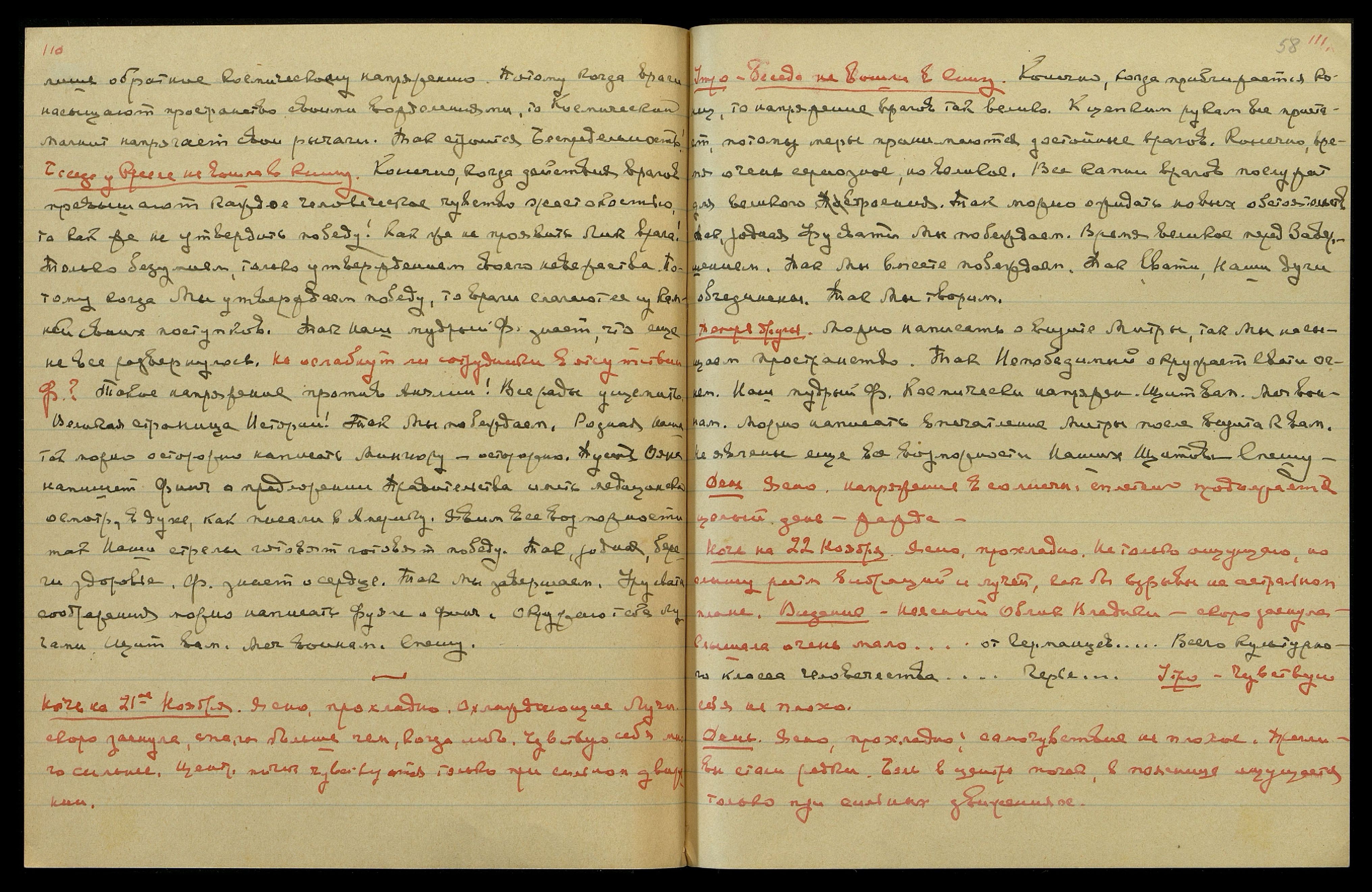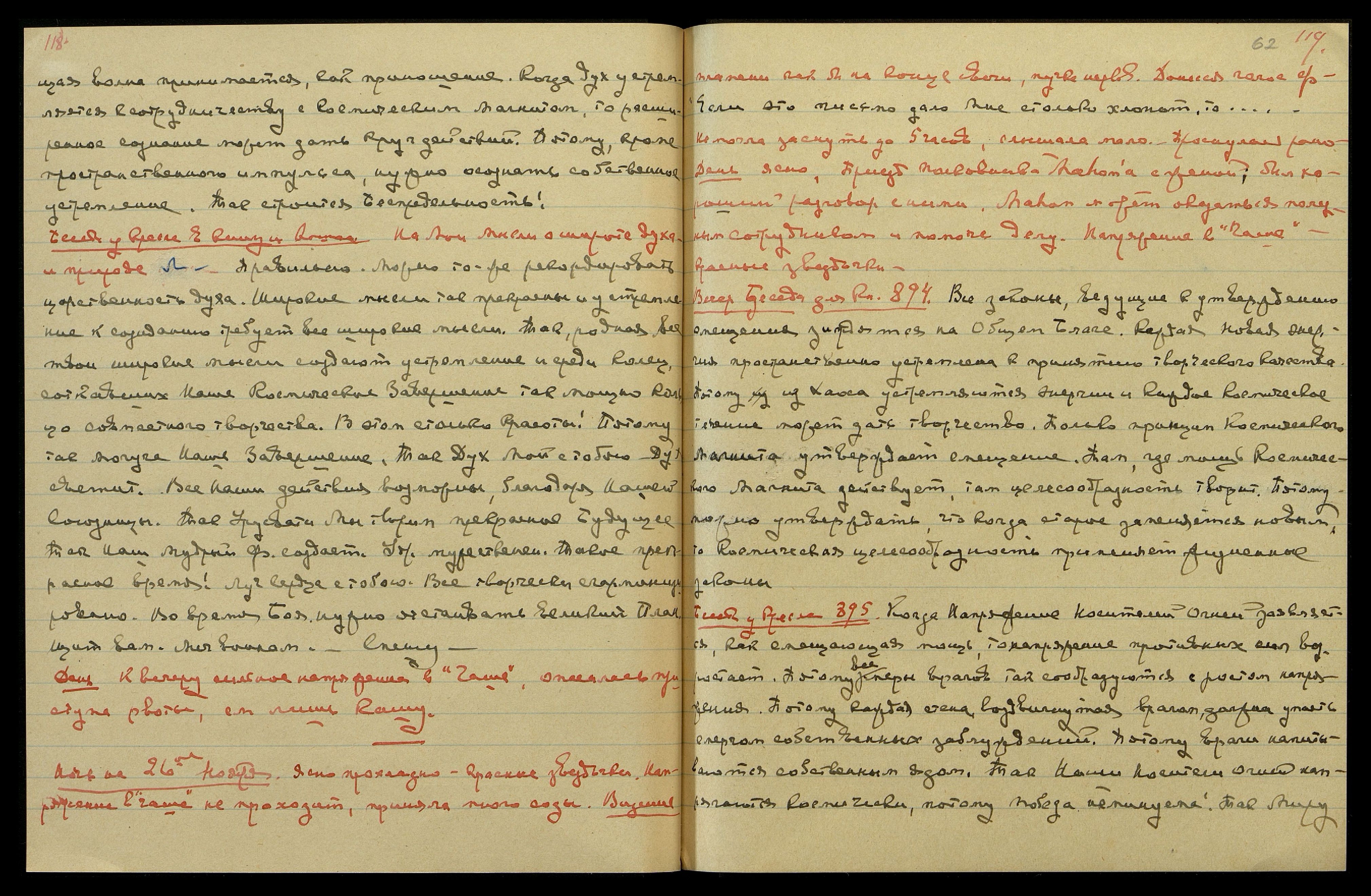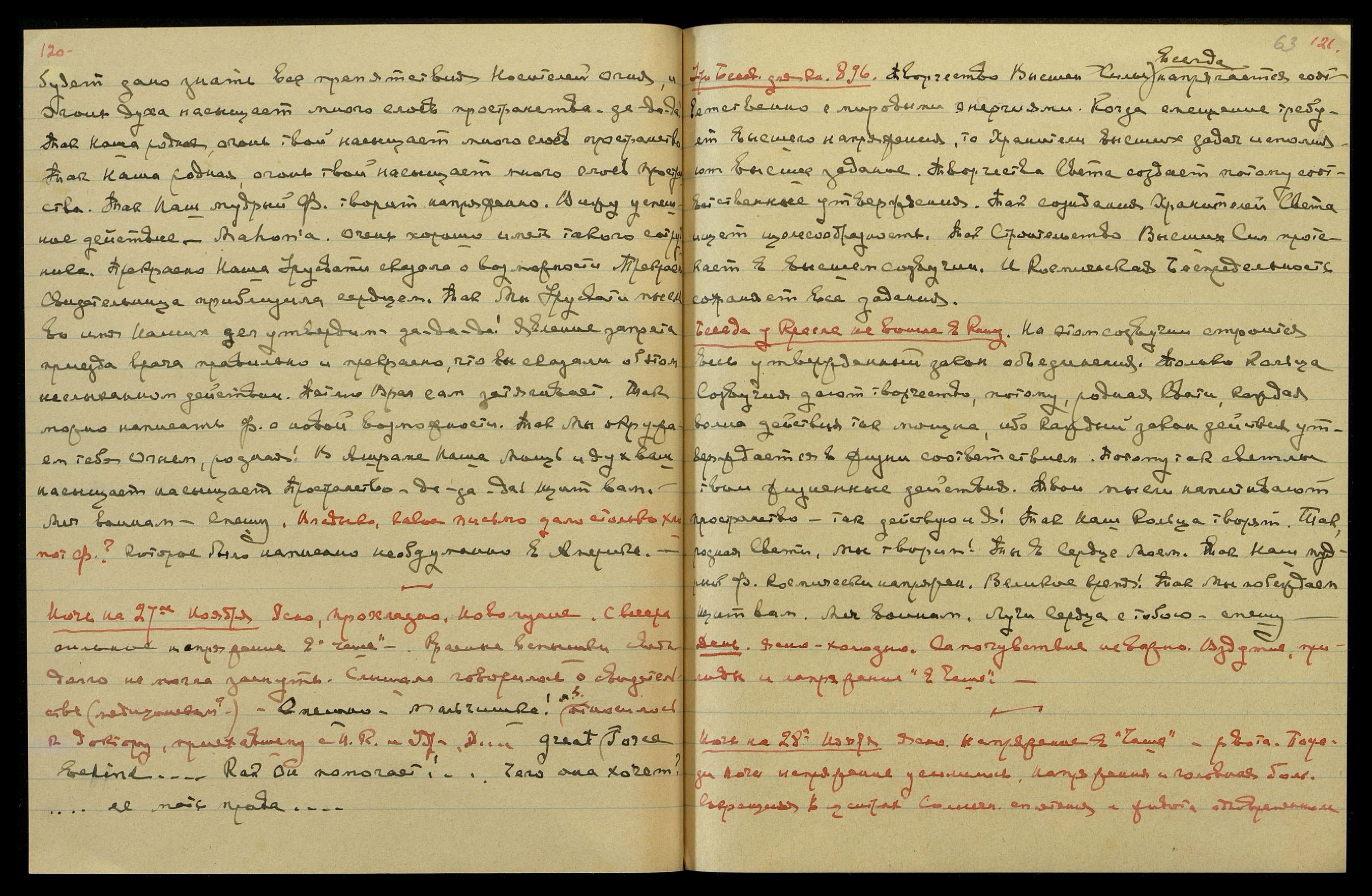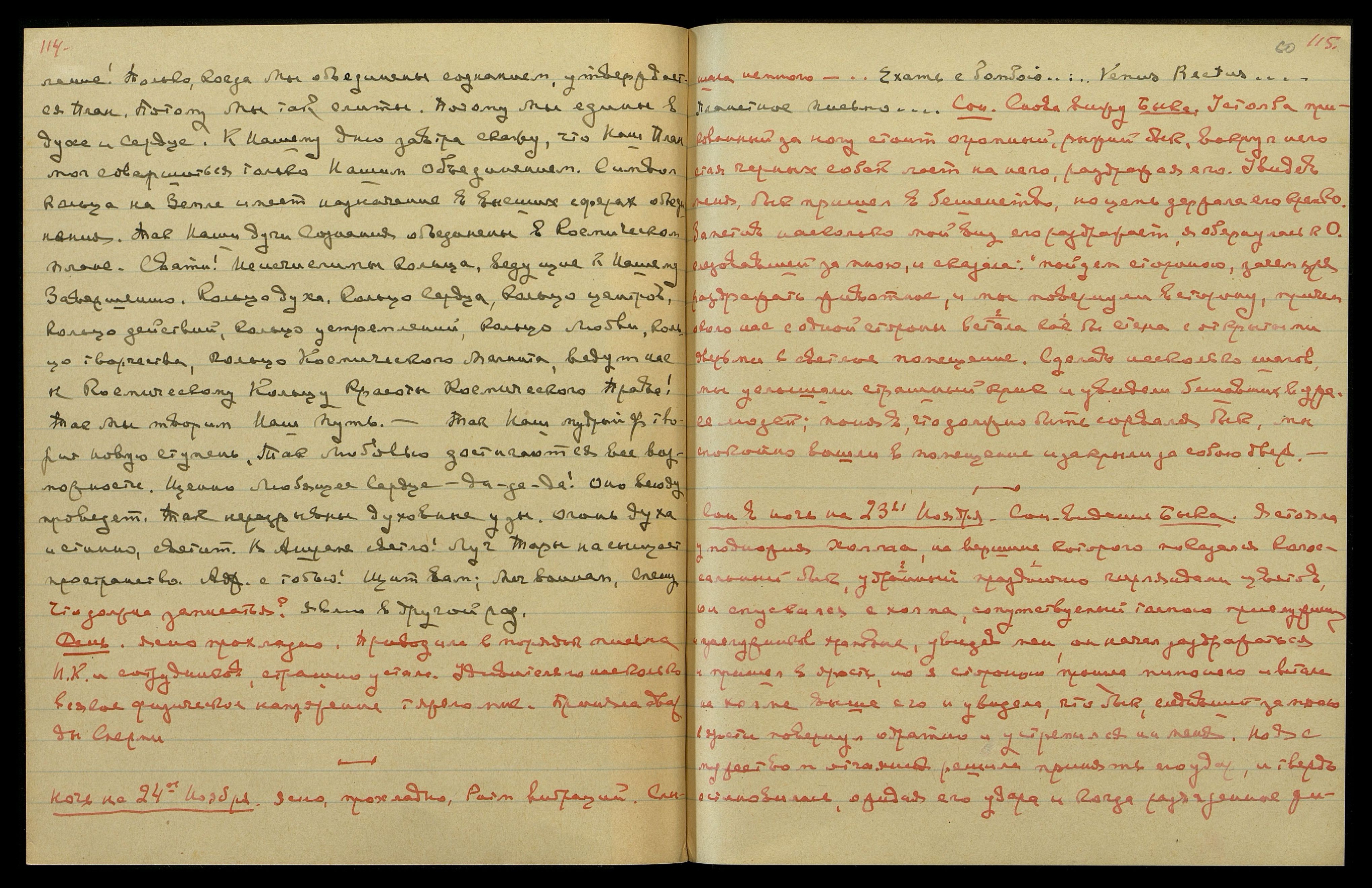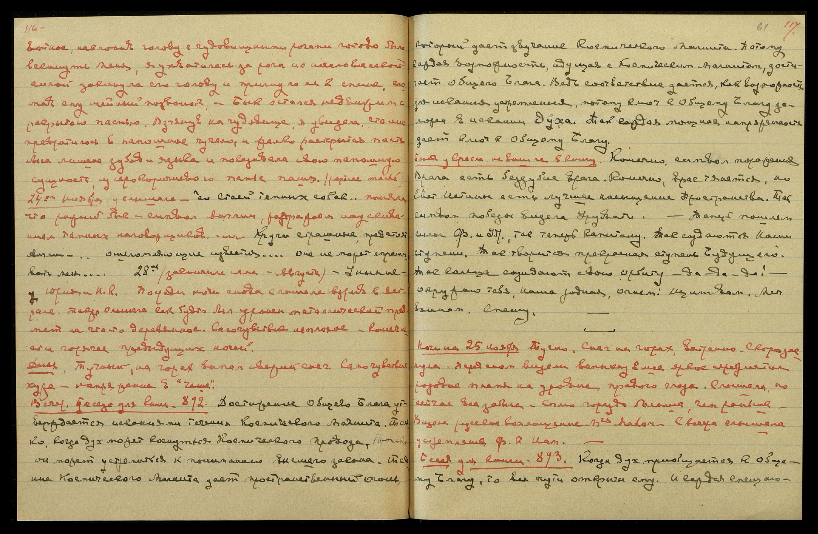 Ночь на 27-ое ноября. Ясно, прохладно. Новолуние. С вечера сильное напряжение в «Чаше». Красные вспышки света. Долго не могла заснуть. Слышала, говорилось о свидетельстве (медицинском?). "Смешно. Мальчишка!", — м[ожет] б[ыть], относилось к доктору, приехавшему с Н[иколаем] К[онстантиновичем] и Удр[аей]. "…great Force behind [англ.: великой силой]… Как он помогает!… Чего она хочет? …ее мать права…".