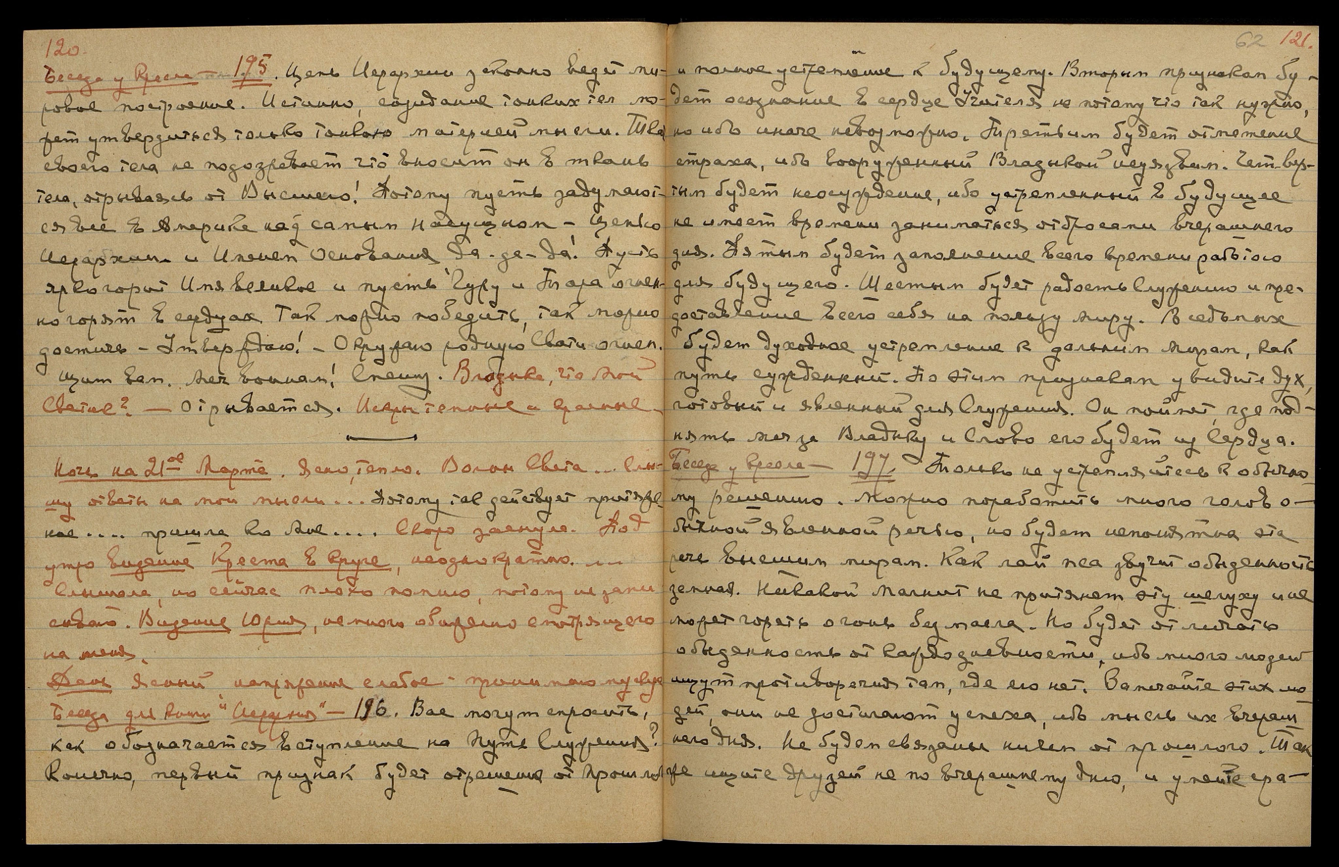 Голоса из Америки: "Это можно сейчас сделать... Не будем торопиться, пошлём со следующей почтою... Нужно всё собрать... Что она сказала по этому поводу?..". Упоминалось моё имя, но не записала сразу, забыла, многое упущено... "Он ехал с потушенными огнями... Как музыка...". Видение Юрия, очень живого, второе видение — астрального, довольно светлого, но с гримасой... "Всё разойдётся...", — содрогнулась от сказанного... неясная запись.