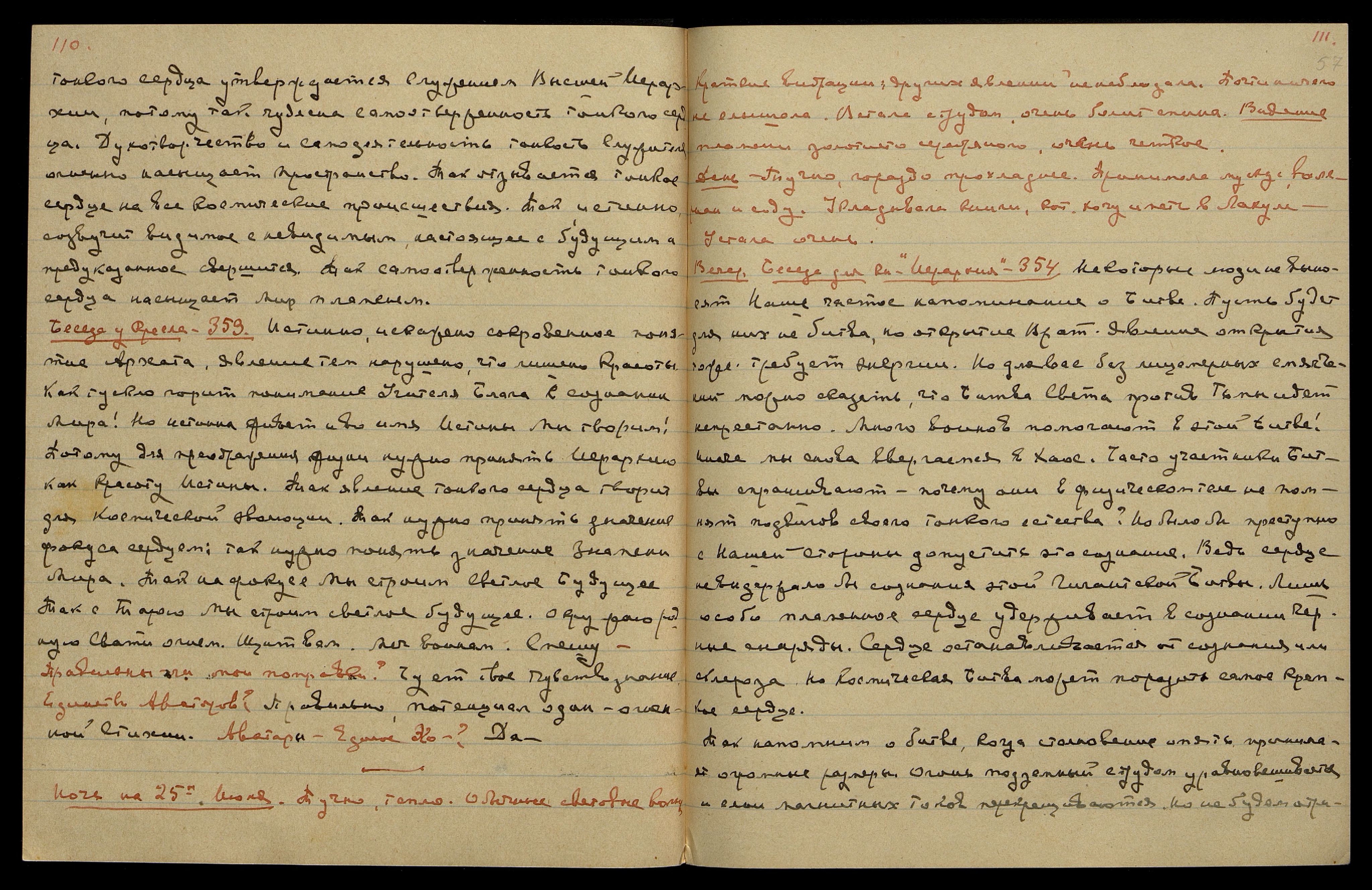 Ночь на 28-ое июня. Луна в последней фазе, ясно, тепло. С вечера волны синего и серебрян[ого] Света. Сильный внутренний жар, много пью, сна нет. Вибрации непродолжительные. Заснула после четырех. Слышала немного. Очень мало что запомнила. Ответ на мои думы —