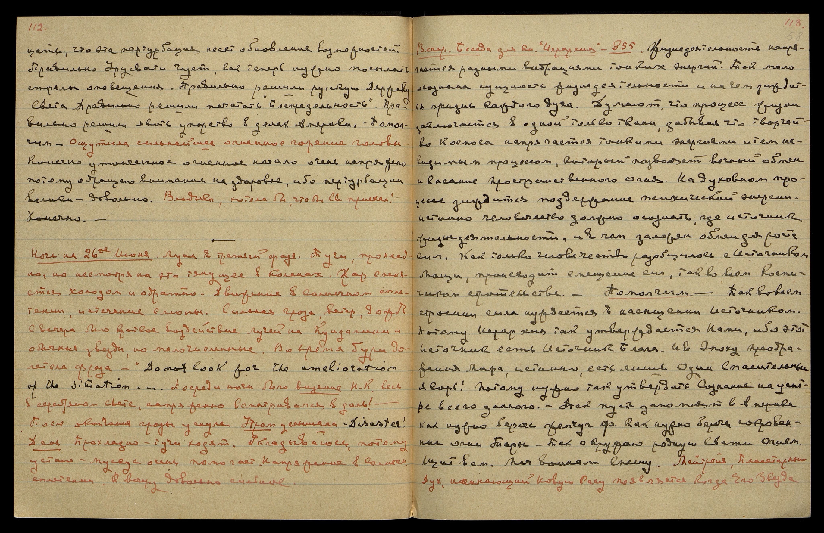Ночь на 26-ое июня. Луна в третей фазе. Тучи, прохладно, но несмотря на это тянущее [ощущение] в коленах. Жар сменяется холодом и обратно. Движение в солнечном сплетении, истечение слюны. Сильная гроза, ветер, дождь. С вечера было краткое воздействие Лучей на Кундалини и обычные звезды, но малочисленные. Во время бури долетела фраза? — "Do not look for the amelioration of the situation... [англ.: Не ждите улучшения ситуации...]". Посреди ночи было видение Н[иколая] К[онстантиновича], весь в серебряном свете, напряженно всматривался в даль!