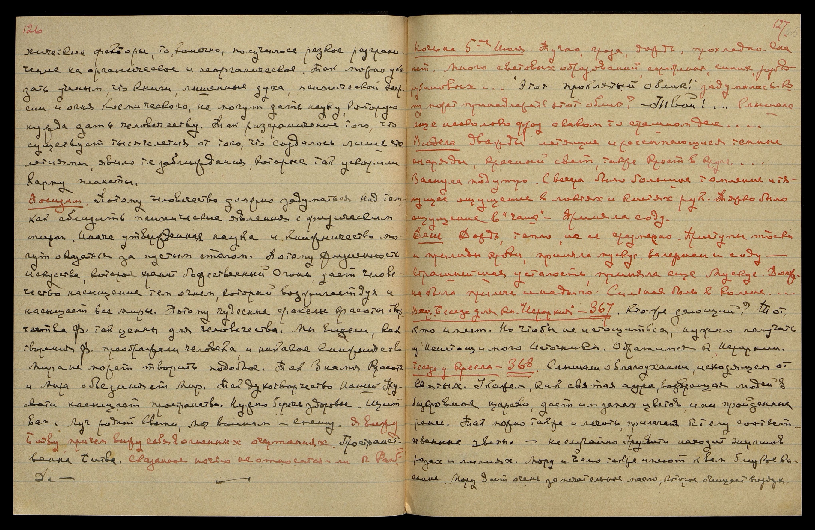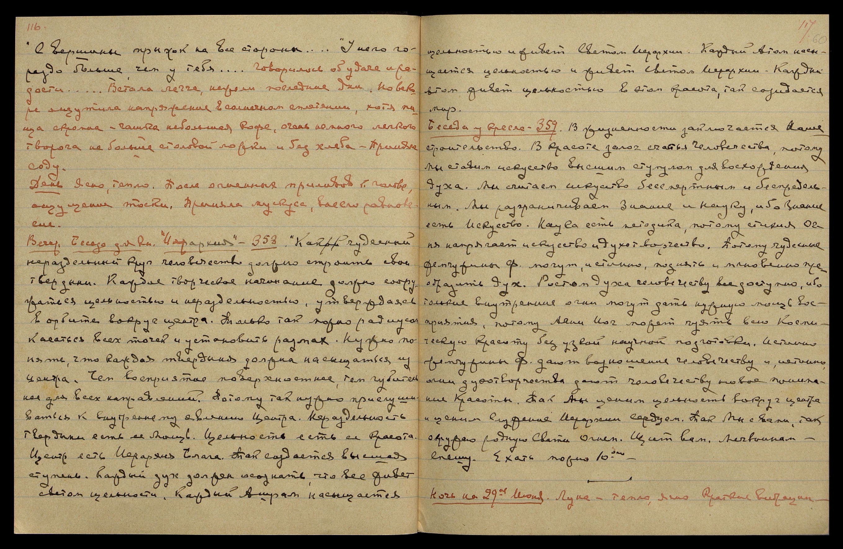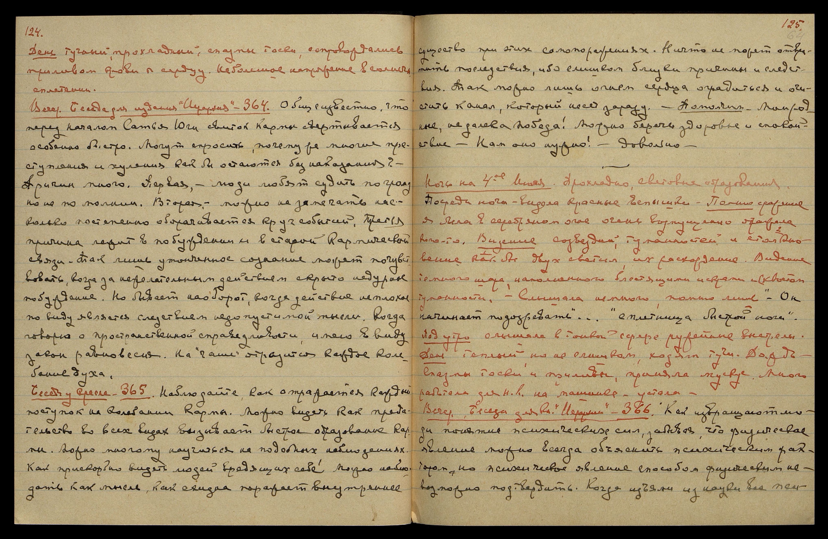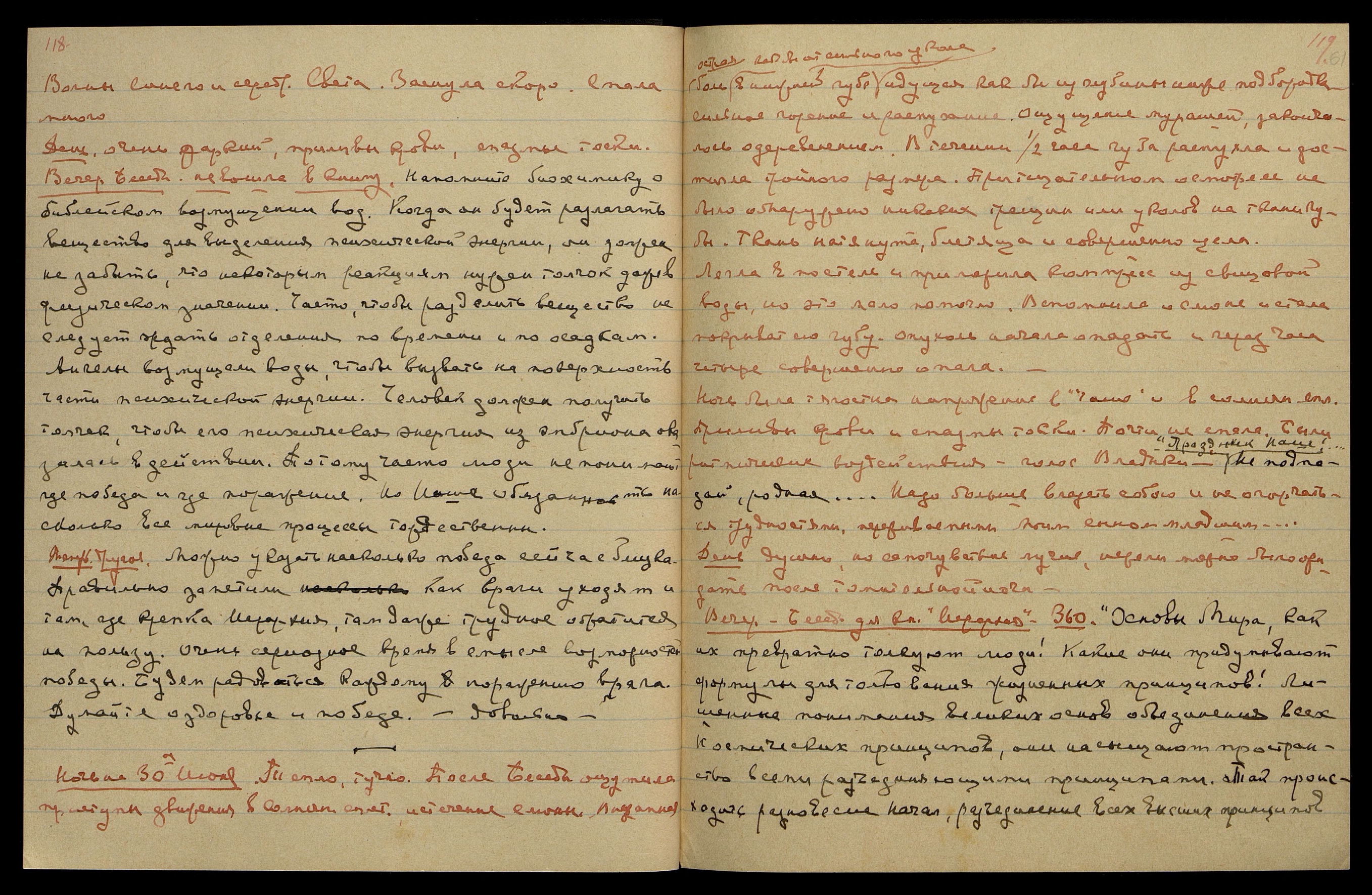 Ночь была тягостна, напряжение в чаше и в солнечн[ом] спл[етении]. Приливы крови и спазмы тоски. Почти не спала. Были ритмические воздействия. Голос Владыки, — "Праздник Наш!.. Не подпадай, родная...". Надо больше владеть собою и не огорчаться трудностями, переживаемыми моим сыном младшим.