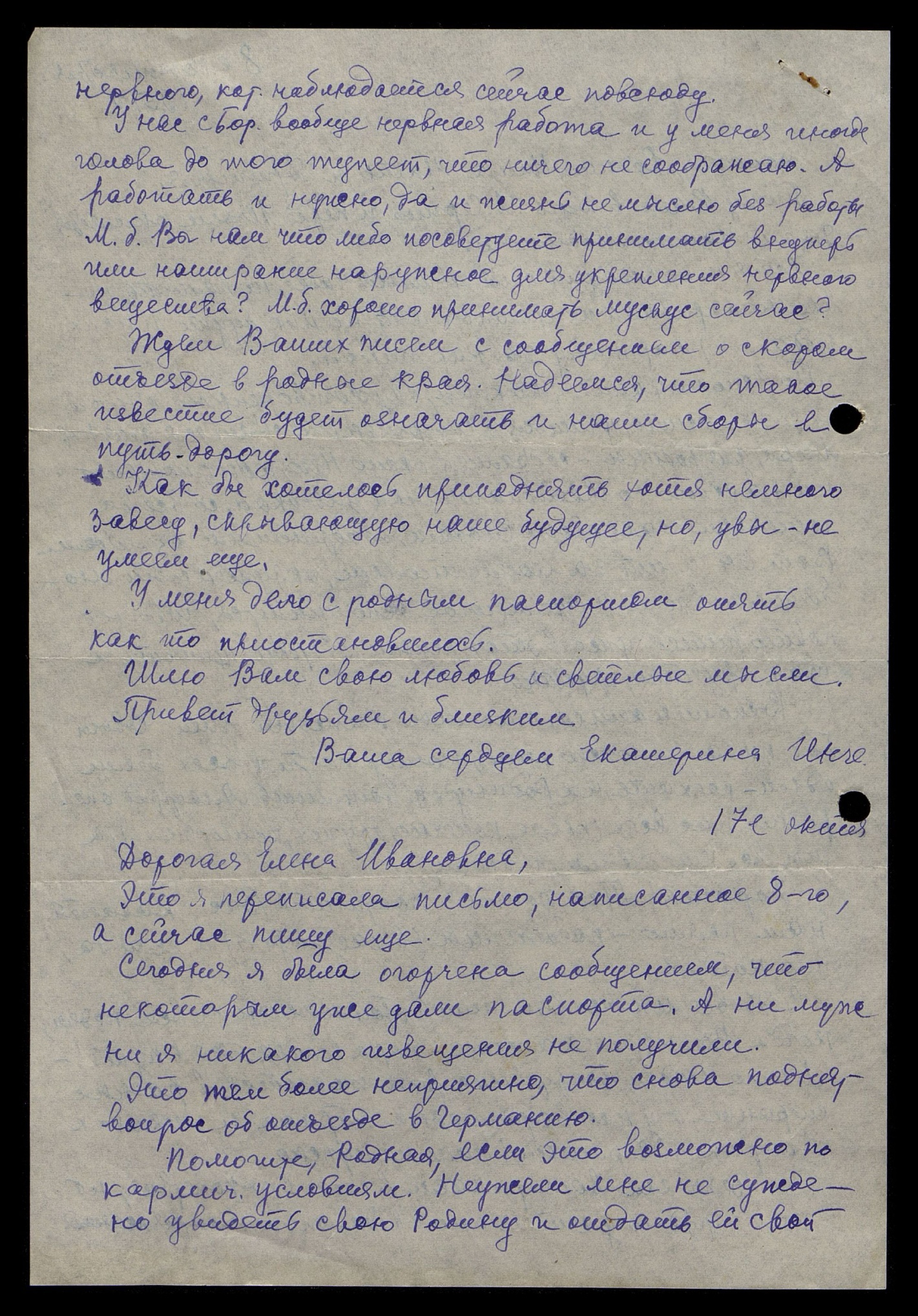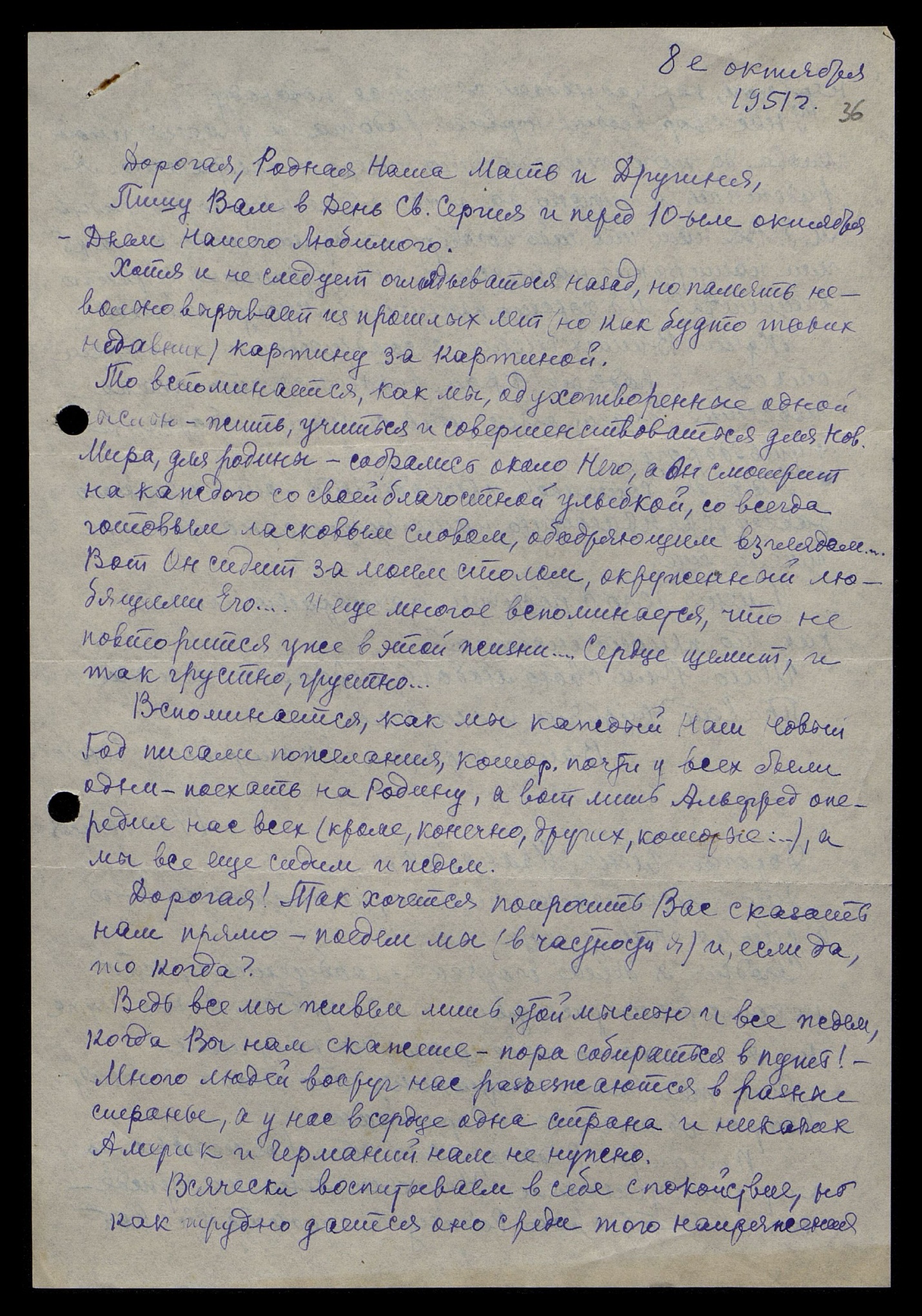 Оба письма были очень суровыми, и я проснулась с мыслью, что мы где-то и в чём-то нехорошо себя вели. Но всё-же письмо было, и это уже радость. В такое тяжкое время не иметь вестей грустно, но мы спокойны, ибо знаем, что мысли Ваши с нами.