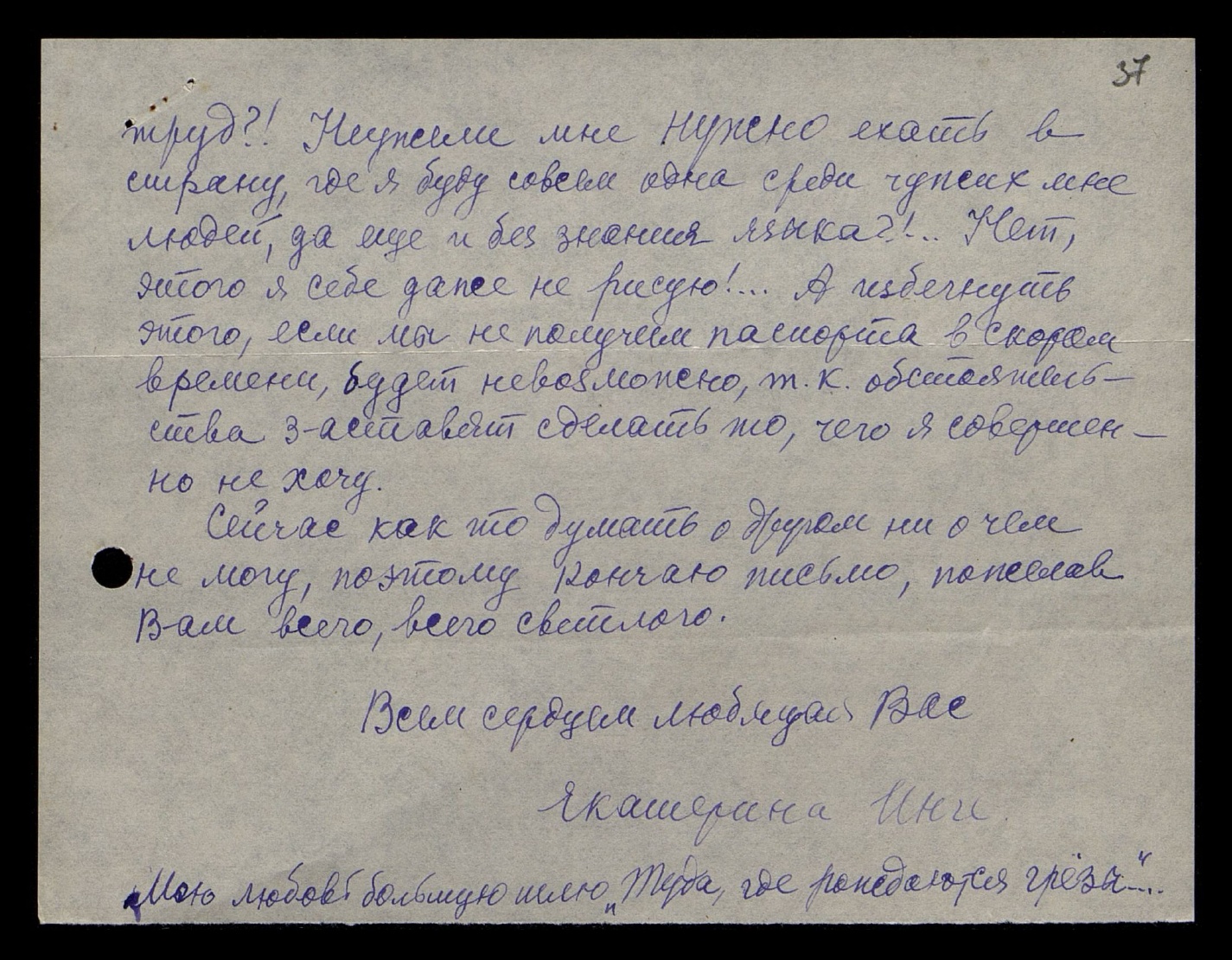 Вот сколько времени не отсылала письма: всё чего-то ждала. За это время муж серьёзно переболел и сейчас силы мои просто на пределе - так измотала и работа, и уход за больным. Мне часто думается, что Вы всё же не очень ясно представляете себе нашу жизнь (Борис тоже такого мнения) и не можете правильно объяснить наши, вырывающиеся иногда, печали. Конечно, нам хотелось бы, например, не так тяжело работать физически. Ведь вот я иногда думаю, что работая "через не могу", я в одно какое-то время свалюсь окончательно, а тогда что? Как? Это не жалоба, не думайте так, пожалуйста, а это желание наше, чтобы Вы знали о наших обстоятельствах.
