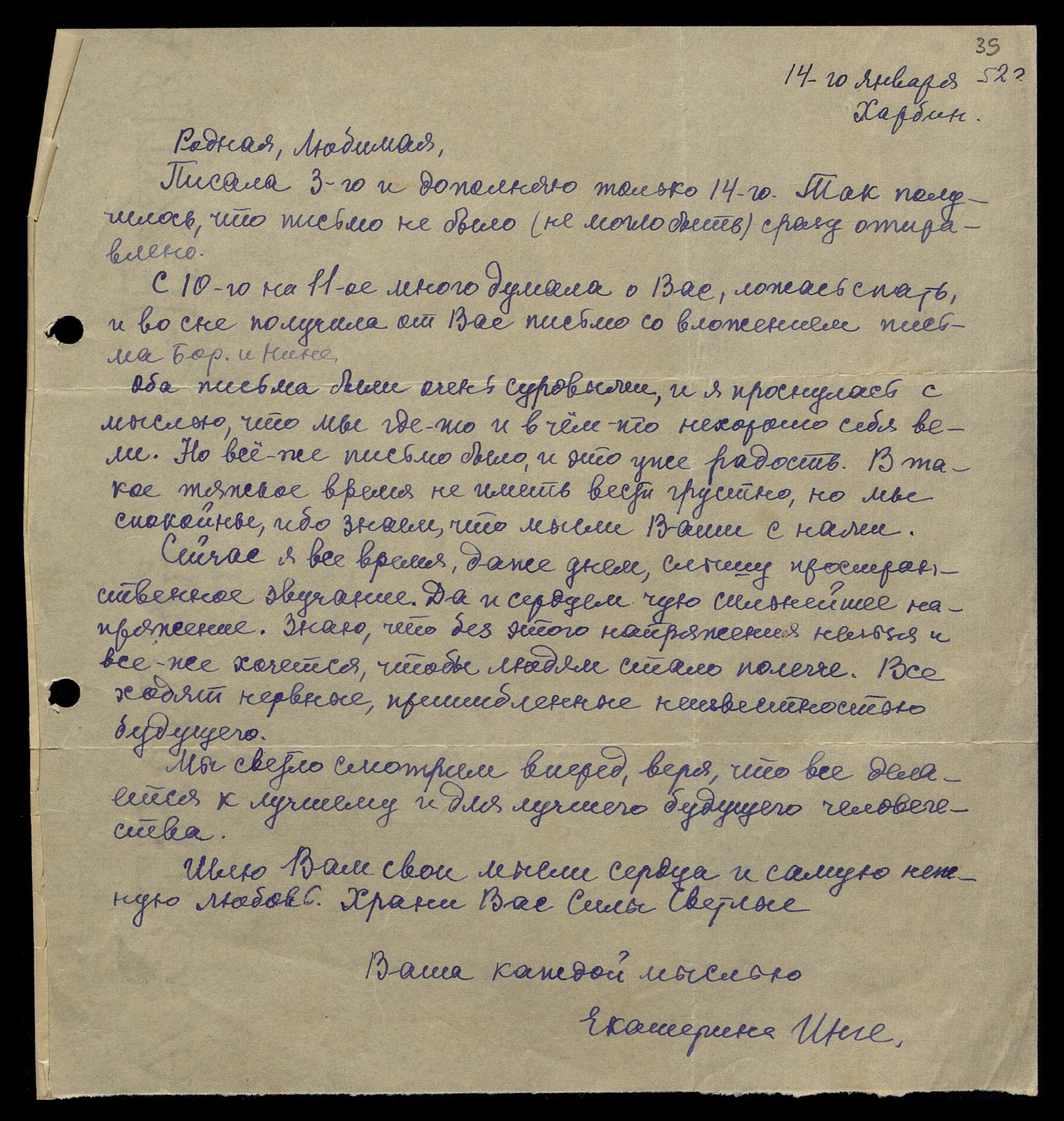 Ну, пока, кончаю. Посылаю Вам, Родной и Любимой свой самый горячий сердечный привет уже в Новом 1953-ем году.