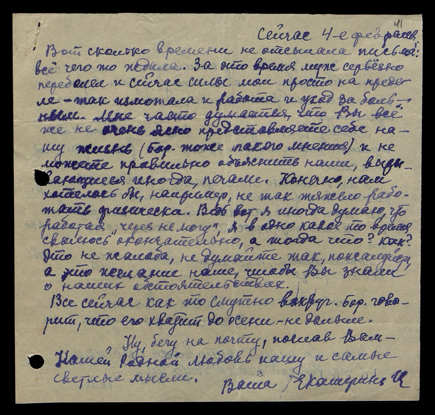 Да, мужество нам сейчас особенно нужно. Без него невозможно было бы ни мне, ни Борису как в быту, так и в работе нашей. Только оно и даёт нам нужные силы − и физические для тасканья угля и стирки, и духовные для спокойного анализа всего и всех вокруг нас и около. Не буду скрывать − тяжело нам. Но мы не плачем и не жалуемся.