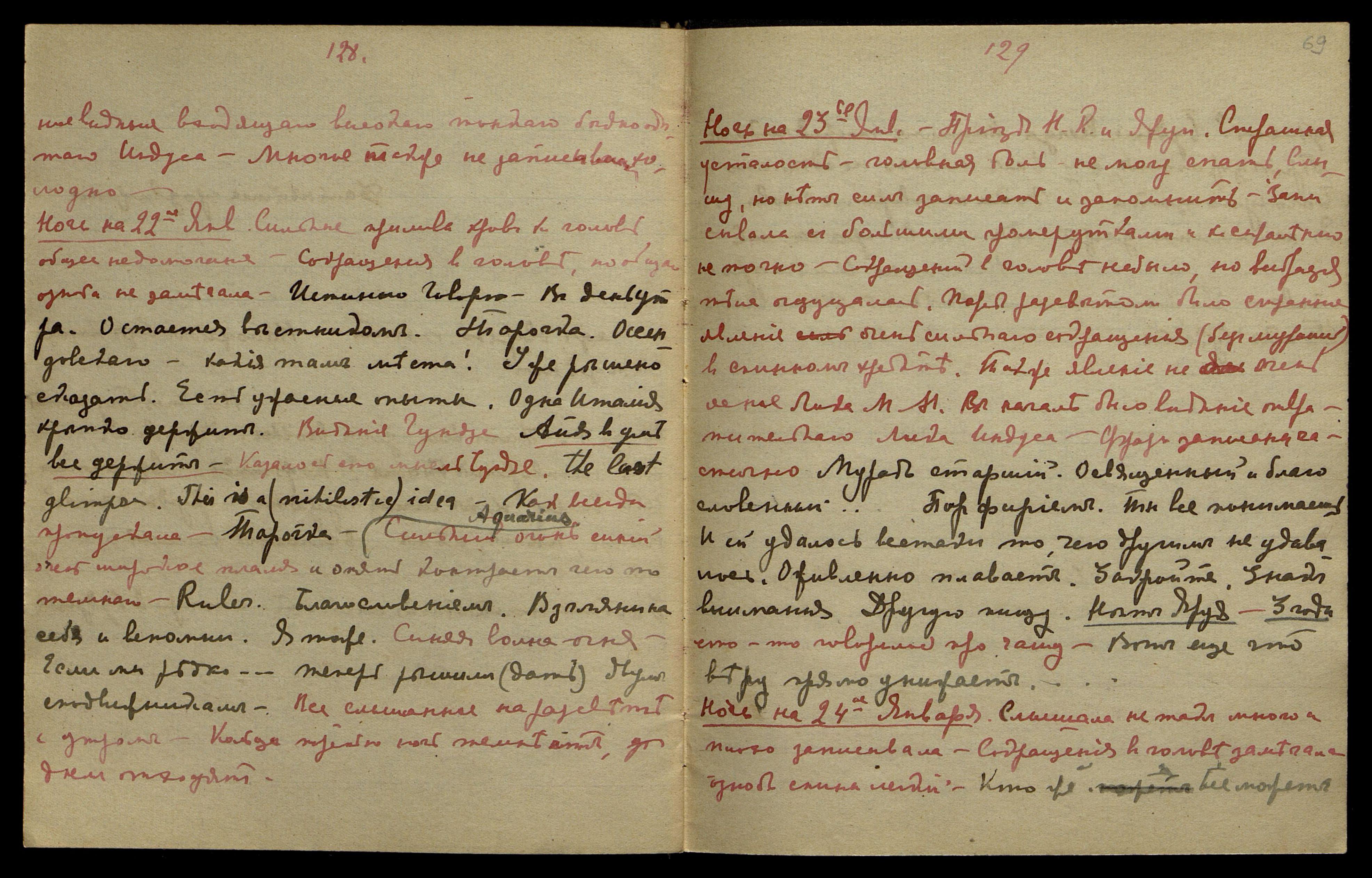 Ночь на 22-ое января. Сильные приливы крови к голове, общее недомогание. Сокращения в голове, но общего озноба не замечала. "Истинно говорю − в день утра. Остается вестником. Тарочка. Оссендовского − какие там места! Уже решено сказать. Есть ужасные опыты. Одна Италия крепко держит". Видение Чундзе. "Айя в уме всё держит", − казалось, это мысль Чундзе. "...the last glimps. This is a (nihilistic) idea [англ.: последние проблески. Это (нигилистическая) идея]". Как всегда пропускала. "Тарочка − Aquarius [лат.: Водолей]". Сильный огонь синий, очень широкое пламя и опять контрасты чего-то тёмного". "Ruler [англ.: Правитель]. Благословением. Взгляни на себя и вспомни. Я тоже". Синяя волна огня. "Если мы редко... теперь решили (дать) двум сподвижникам". Всё − слышанное на рассвете и утром. Кольцо третью ночь темнеет, днём отходит.