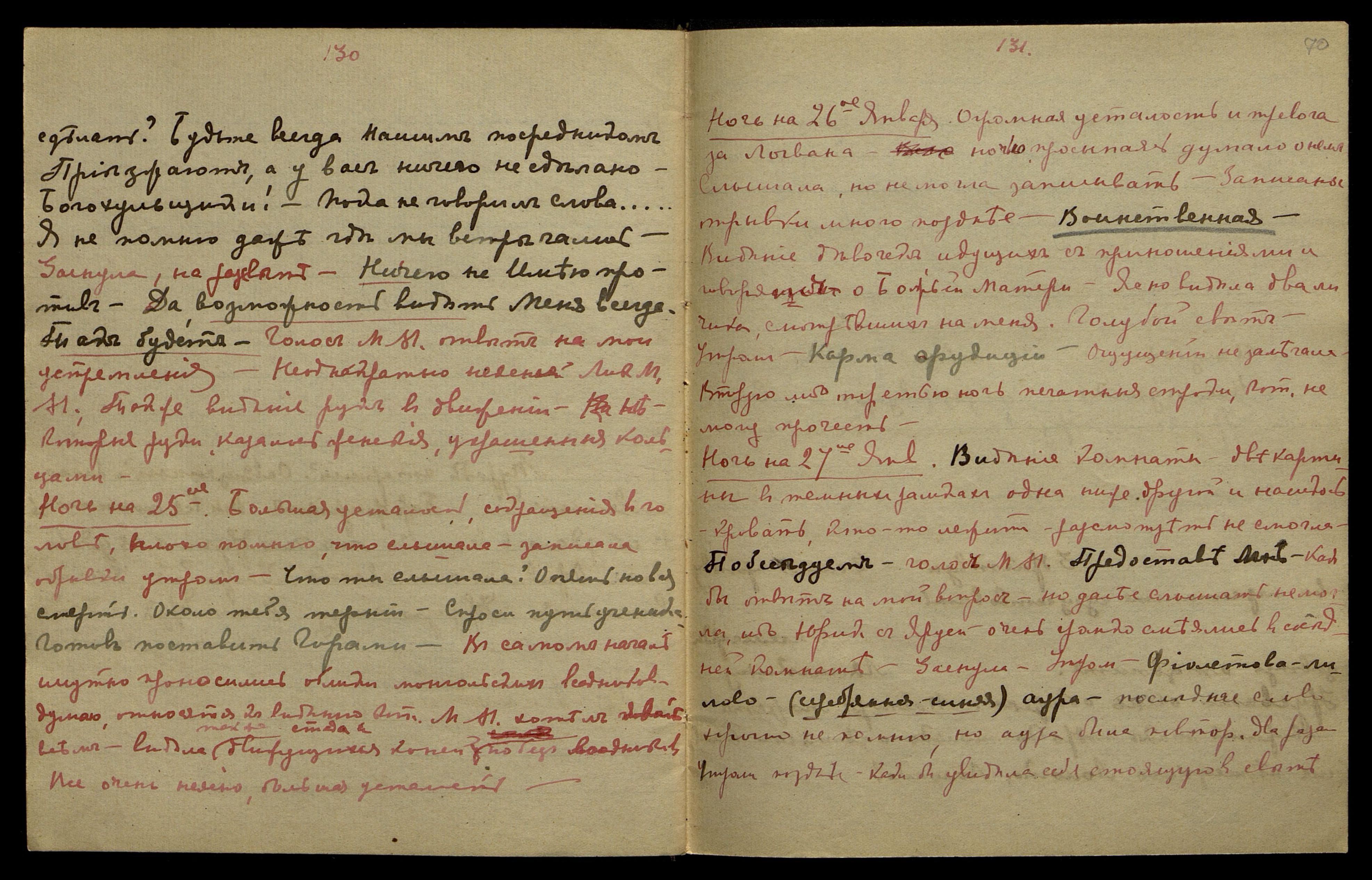 Ночь на 26-ое января. Огромная усталость и тревога за Логвана. Ночью, просыпаясь, думала о нём. Слышала, но не могла записывать. Записаны отрывки много позднее. "Воинственная". Видение девочек, идущих с приношениями и говорящих о Божьей Матери. Ясно видела два личика, смотревших на меня. Голубой свет утром. "Карма эрудиций". Ощущений не замечала. Вторую либо третью ночь − печатные строки, кот[орые] не могу прочесть.