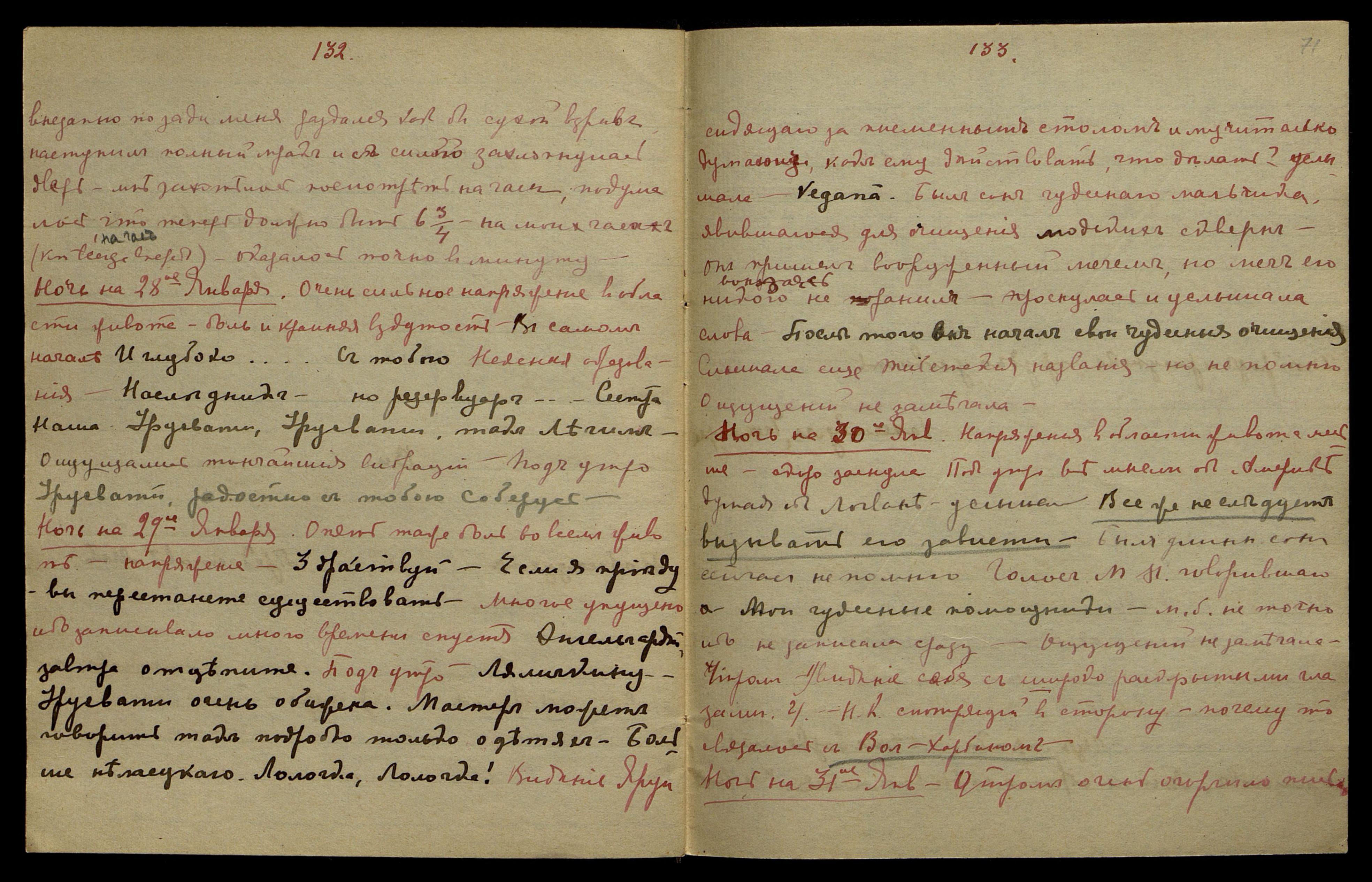 "Когда он упал, что с ним сделалось? Ужас! Великаном не быть. Мордовцева** читайте. Маленькая своя..." Видение женской руки, серебряное кольцо сложного рисунка и маленькой бирюзой. Очень громко произнесенное слово, принятое мною каким-то центром в носоглотке, само слово не смогла разобрать. "Он уехал − ведь все прон..." − неясная запись, помню, что слышала фразу о том, что Н[иколаю] К[онстантиновичу] придётся ещё раз приехать, но не записала её. "Положение ваше очень упрочилось". Наблюдала вибрации, лёгкие сокращения в голове. Несколько дней замечаю движение в сердце, как бы скачки. Франц[узы] называют это явление "Le coeur sanglone [фр.: Сердце рыдает]". Был сон длинн[ый], помню лишь конец. Н[иколай] К[онстантинович] и я прощаемся с нашими сотрудниками и слугами (все незнакомые), оставляем им запас сахару. Идём в горах и ви-