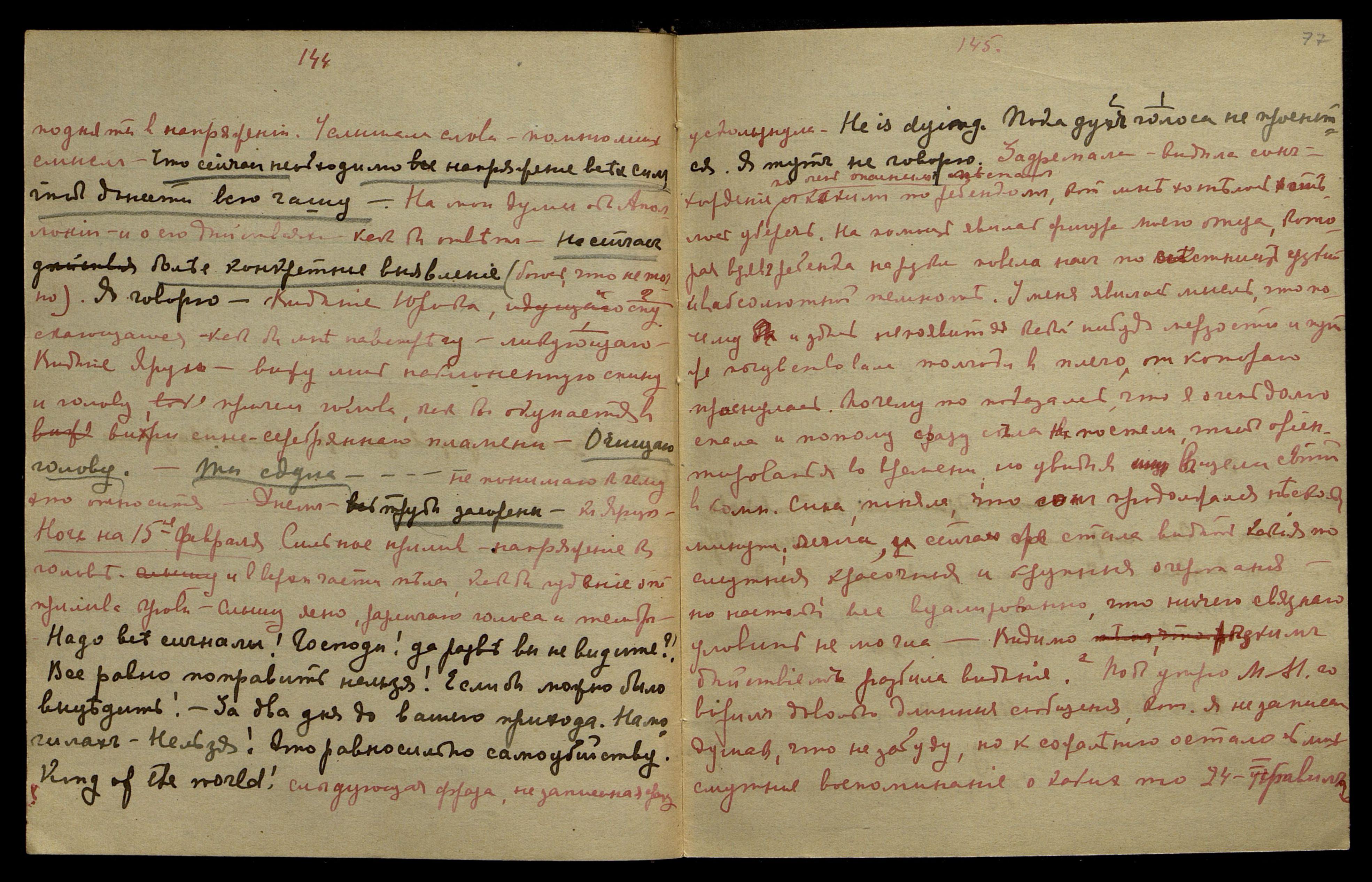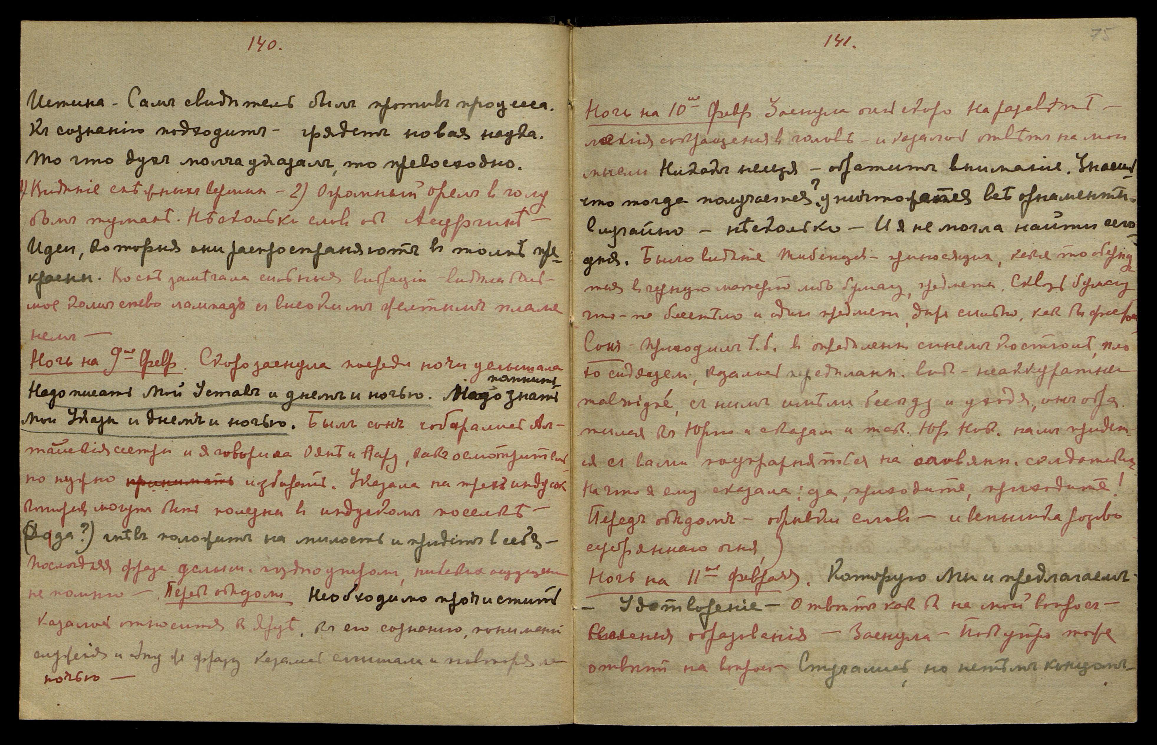 Ночь на 14-ое февраля. Как только легла, начала слышать. "Сценки и рассказы из "Исциквадами" − retenu [фр. сдержанный]", − произнесено очень некрасиво и как русское "ю". Следующая запись неразборчива, помню лишь, что были сказаны несколько слов не известного мне языка. Видение местности, ухва[тила] лишь большое дерево − шапкою на фоне лилово-розового облака, причём на облаке светотенью были какие-то начертания. Около пяти часов − много слышала, но ничего не записала, помню обрывки, также был[о] 4 видения. Дважды видела Н[иколая] К[онстантиновича] с очень напряженным ликом и взглядом, и во втором [видении] даже руки были
