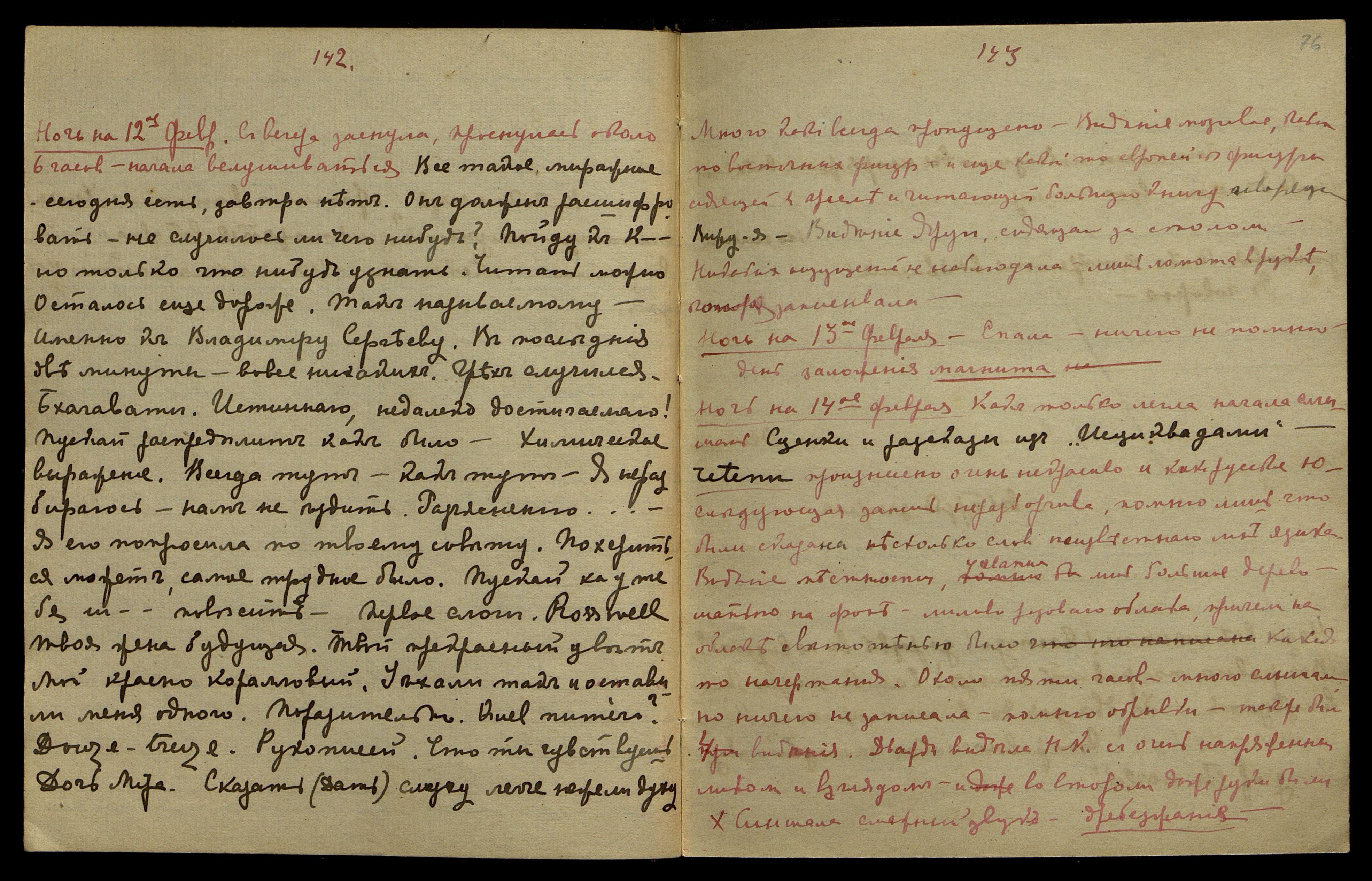 Ночь на 12-ое февраля. С вечера заснула, проснулась около 6 часов, начала вслушиваться. "Всё такое миражное, сегодня есть, завтра нет. Он должен расшифровать − не случилось ли чего-нибудь? Пойду к К..., но только что-нибудь узнать. Читать можно. Осталось ещё дороже. Так называемому, именно к Владимиру Сергееву. В последние две минуты − вовсе никаких. Грех случился. Бхагавати. Истинного, недалеко достигаемого! Пускай распределит, как было. Химическое выражение. Всегда тут как тут. Я не разбираюсь − нам не ездить. Разъяснению... Я его попросил по твоему совету. Похериться может, самое трудное было. Пускай-ка у тебя ли... повысить. Первое слоги. Rosswell. Твоя жена будущая. Твой прекрасный цвет. Мой красно-коралловый. Уехали, так и оставили меня одного. Поразительно. Quel Numero [франц.: Какой номер]? Douze-Treize [франц.: Двенадцать − Тринадцать]. Рукописей. Что ты чувствуешь? Дочь Мира. Сказать (Дать) слуху легче, нежели духу". Много, как всегда, пропущено. Видение мозговое каких-то восточных фигур и ещё какой-то европейской фигуры, сидящей в кресле и читающей большую книгу, говорящей: "Вижу я". Видение Яруи, сидящего за столом. Никаких ощущений не наблюдала, лишь ломота в руке, которая записывала.