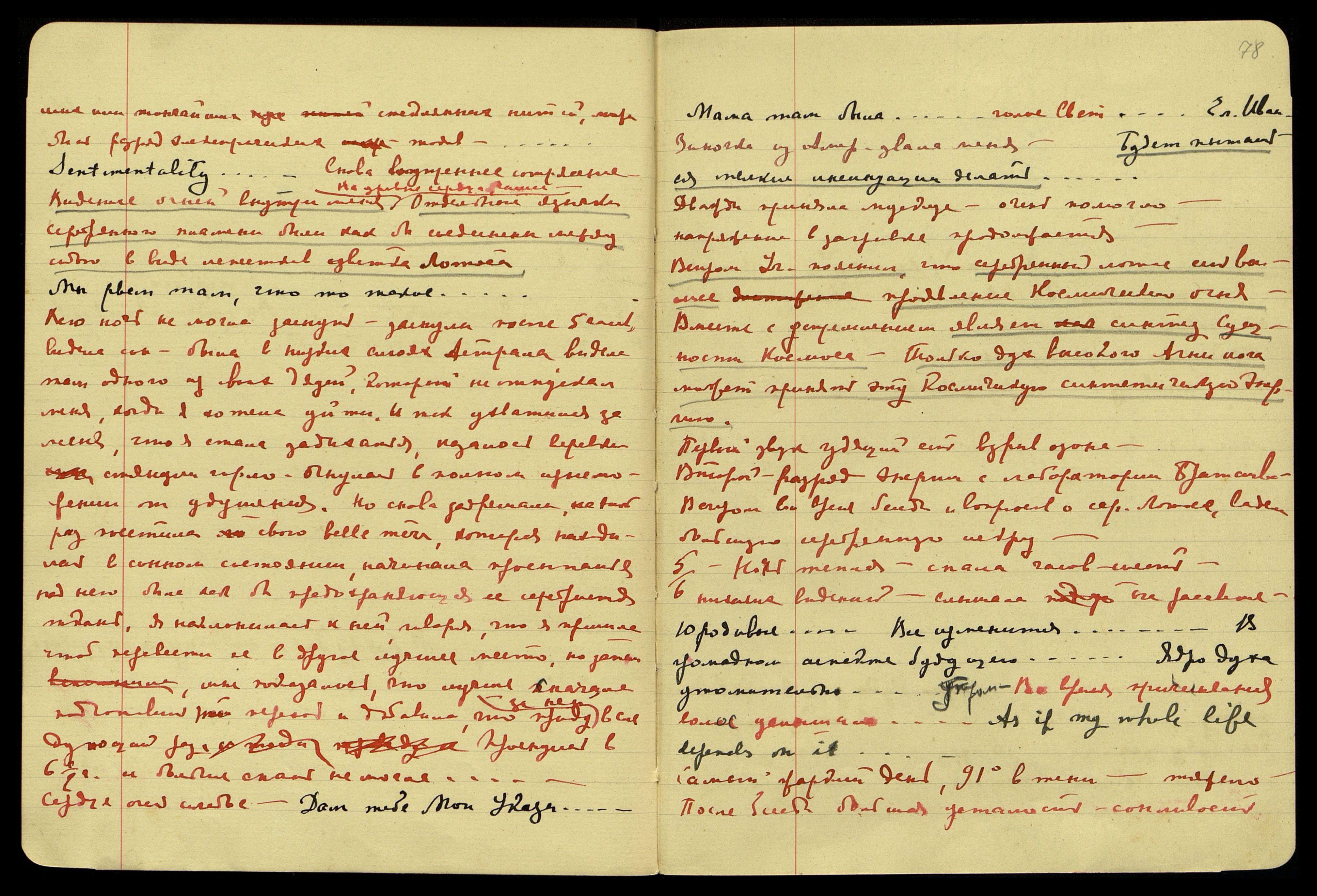 5/6.[06.1929]. Ночь тёплая, спала часов шесть, никаких видений, слышала на рассвете: "Юродивые... Всё изменится... В громадном аспекте будущего... Ядро духа утомительно..." Утром, во время причёсывания волос, услышала: "As if my whole life depends on it [англ.: Как будто от этого зависит вся моя жизнь]".