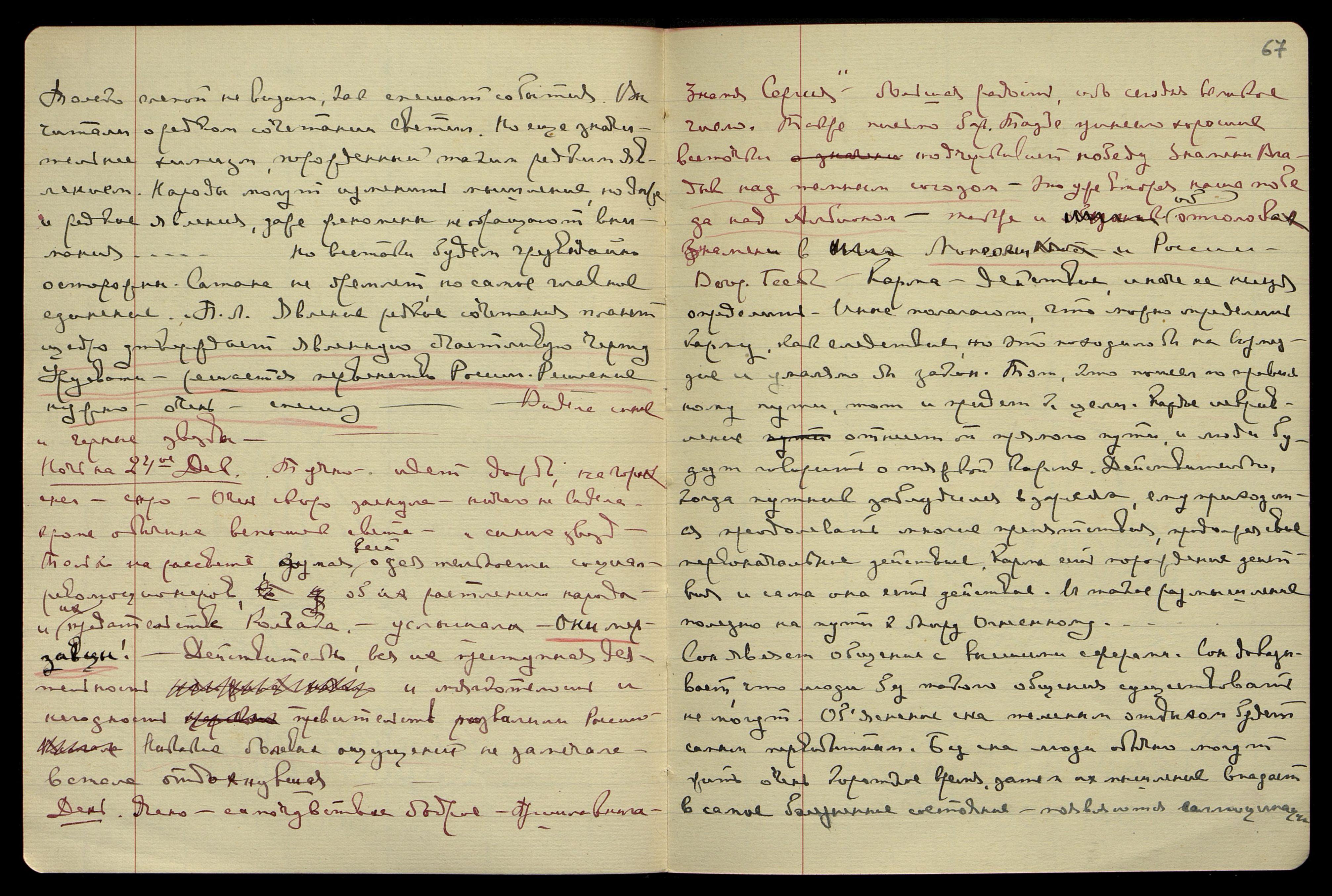 Ночь на 25-е дек[абря]. Ясно. Свежо. С вечера довольно скоро заснула в радостном подъеме. Под утро слышала: "Статистов много, но большевики растерзали страну", − поняла, что это относится к Америке. Затем слышала о новом соглашении Турции с Англией, также, что "нельзя явить план, нельзя явить даже намек на возможность возрождения России…, ибо врагов и акул, жаждущих разорвать Россию на части, не мало".
