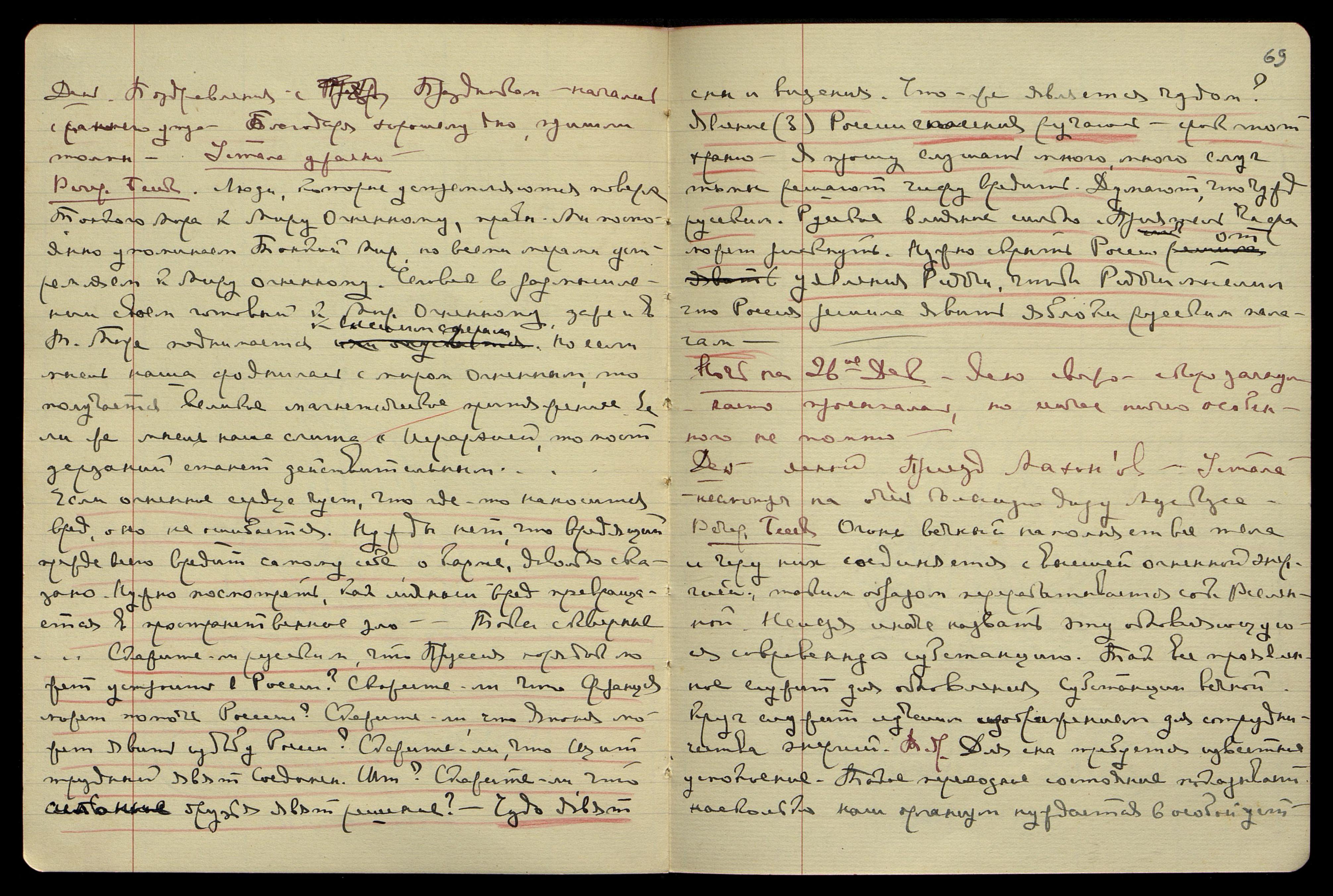 Р[узвельт] чует, что Ф[уяма] может русск[ое] дело тоже устроить. Свати руку Р[узвельту] протянула. Я чую, Р[узвельт] учуял чудесную помощь Урусвати. Чую явление (3) грозное. Нужно ручным р[усским] указать на чудо с Чашей. Нужно (3) мудро русск[им] сказать − явите среди помыслов уничтожения сознание чистое о родине. Только подвиг чистый спасет чтущих Сергия…