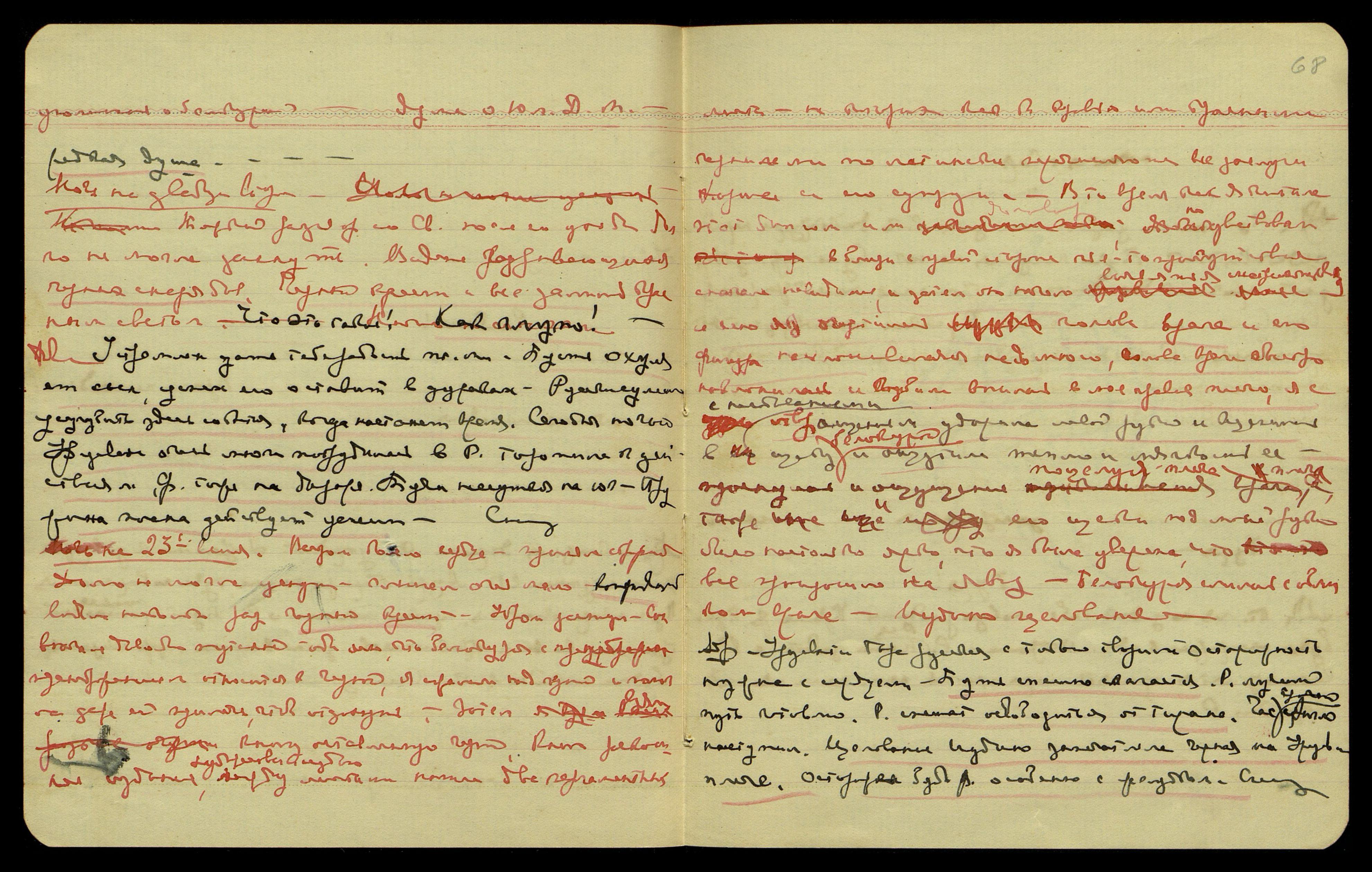 Ночь на 23-ье июня. Вечером болело сердце, приняла строфант. Долго не могла уснуть, слышала очень мало."[Одно слово неразборчиво]". Видела несколько раз чёрный крест. Утром заснула. Сон вначале довольно путаный, одно ясно, что белокурая с пренебрежением относится к чёрной. Я сжалилась над чёрной и помогла даже ей прилечь, чтобы отдохнуть. Затем я взяла книгу, оставленную чёрной. Книга — роскошное издание, художественно издано, между листами нашла два пергаментных листа, на которых как бы кровью или красными чернилами по-латински перечисляются все заслуги Хорша и его супруги. В то время, как я читала этот диплом или договор, почувствовала вблизи, с правой стороны, чье-то присутствие — сначала невидимое, а затем оно начало выявляться, материализоваться и ясно очертилась голова врага и его фигура, наклонившаяся надо мною. Голова врага быстро наклонилась и губами впилась в мое правое плечо. Я с негодованием и отвращением ударила левой рукой и вцепилась в щёку белокурой и ощутила тепло и мягкость её, — проснулась и ощущение поцелуя плеча врагом, также и его щеки под моей рукой, было настолько ярко, что я была уверена, что всё произошло наяву. Белокурая слилась с обликом врага. Иудино целование.