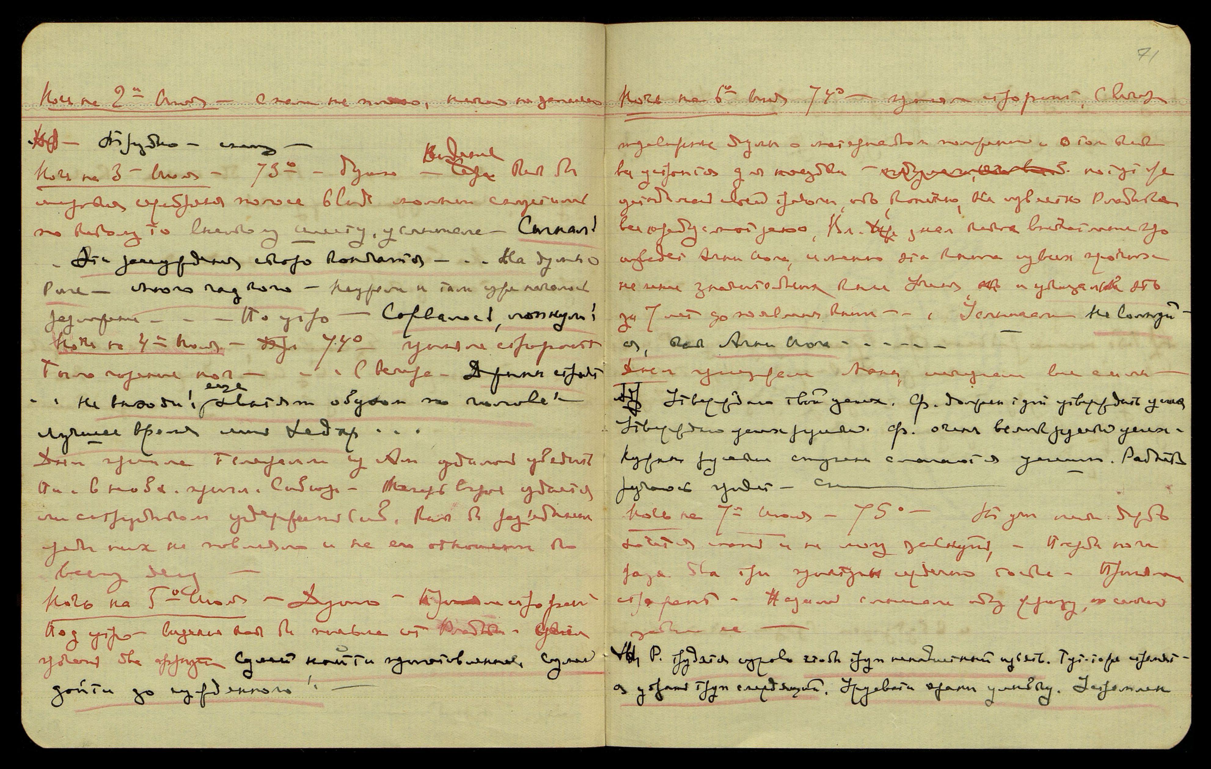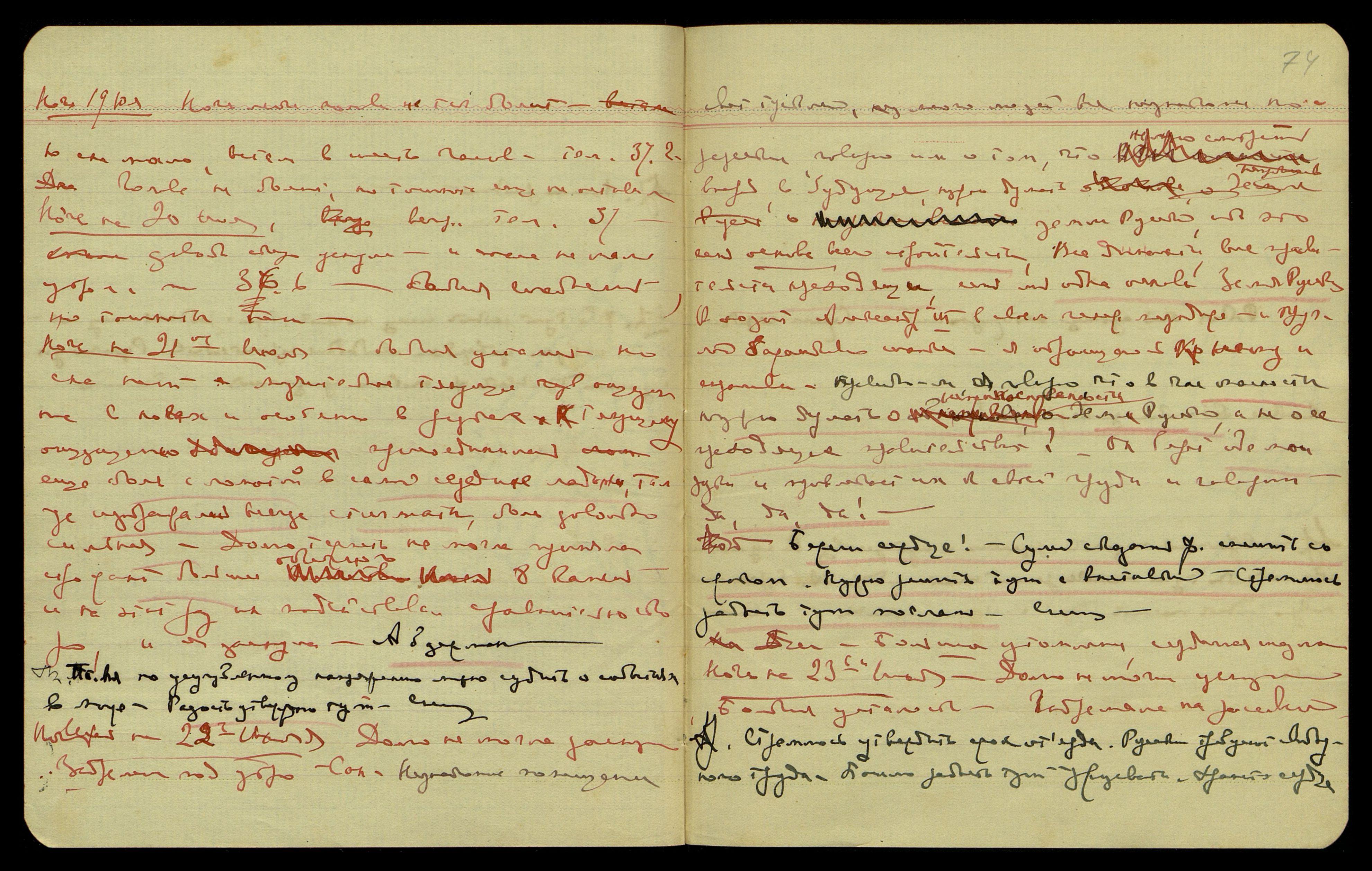 Ночь на 1-ое июля. Сна нет, несмотря на то, что температура 70°. Слышала перечисление крупных сумм: "4 биллиона — 14 — две тысячи — Какие жулики, какие ужасные жулики!.." — слышала ещё несколько фраз, которые сразу не записала, и они ускользнули. "На балканах... эпидемия... Страшно стало жить!" — снова пропущено, вспыхнул внутри головы яркий золотистый свет, осветил всё перед глазами. "Единственная, которой хотелось сказать... Блюхер!.. Без всякого вопроса. — Нет никакого сомнения в кровавом поту — с излюбленной..." Многое ускользнуло. Тяжело, сна нет. Ясное сознание злобы чёрной и белокурой предательницы. Интересно отметить, что Свят[ослав] в эту же ночь видел сон, что я лежала на постели, и в комнату пытались войти чёрная с белокурой, он почувствовал всю их злобную ярость и бросился, чтобы помешать им войти. Ключ в двери был старый и с трудом поворачивался в замке, но, всё же, ему удалось с большим трудом её запереть.