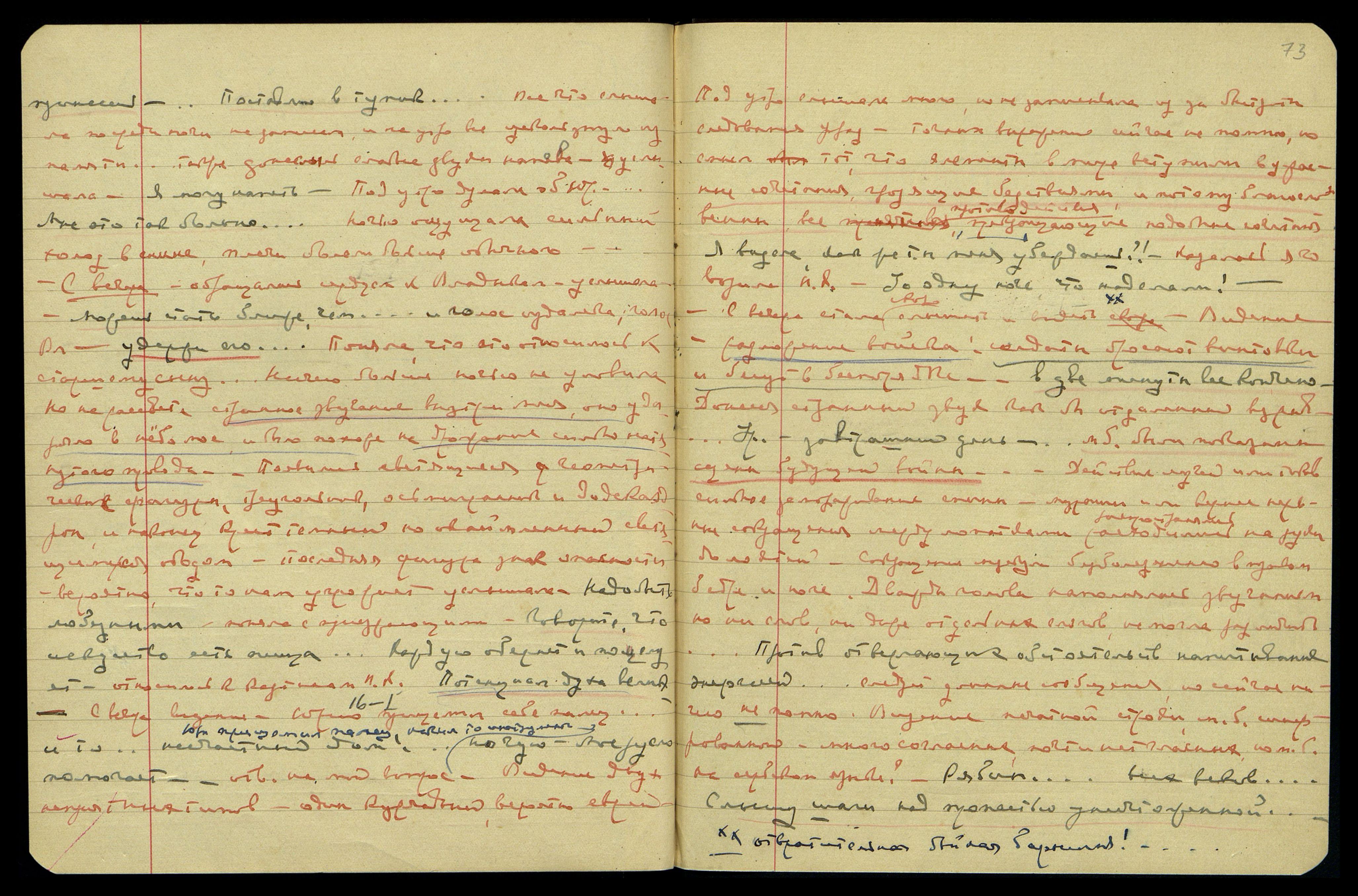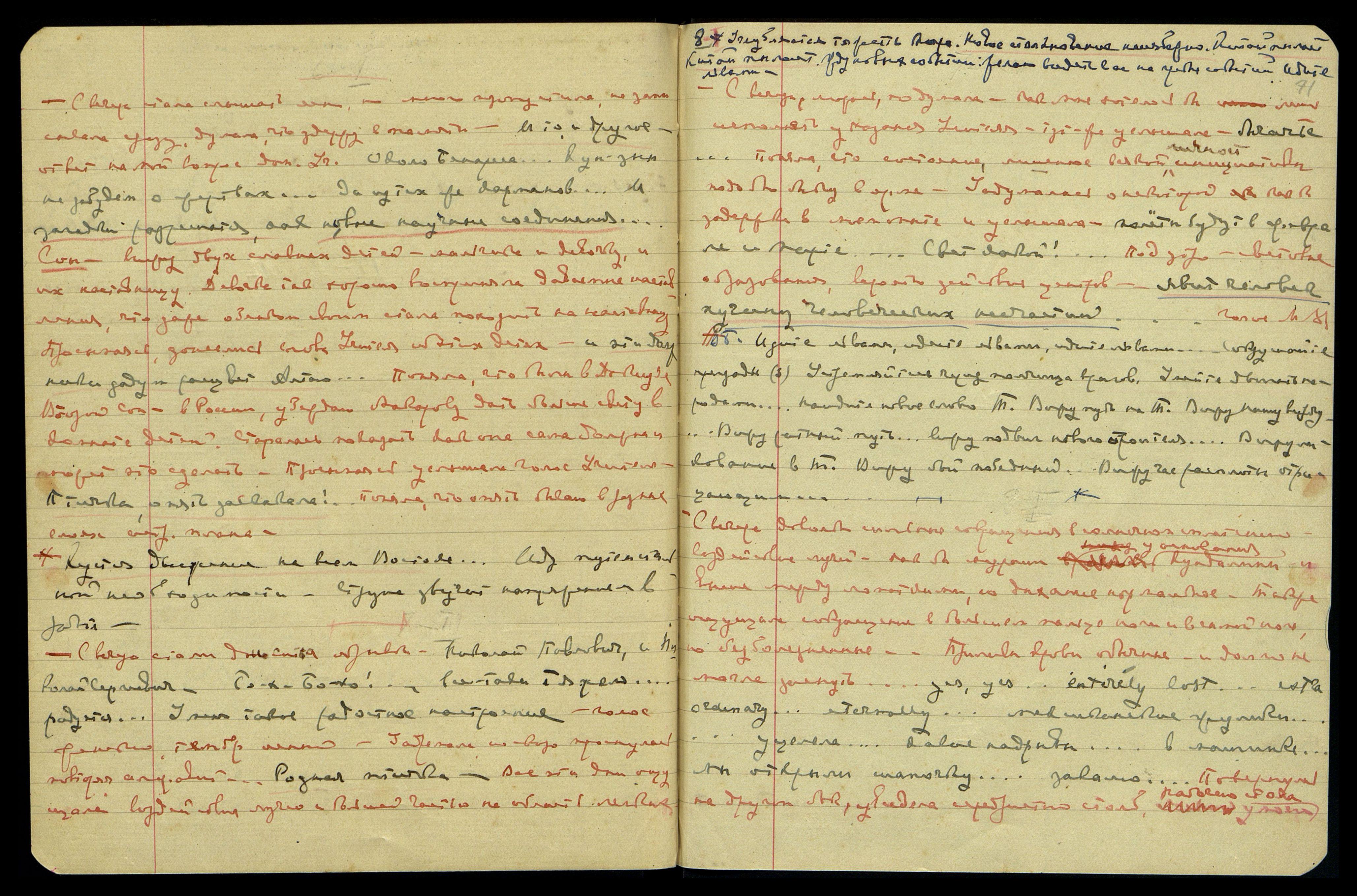 "Пока что толкаются... Шикарное отделение... Я без себя не отдал... Чёрт знает, что такое!.. Не пускай никого... Чёрт возьми, когда я сюда приехал..." Видение: телеграфн[ая] лента лежит в аппарате. "А голубь?..." Видение отвратительной старухи с длинными зубами... "Аронсон считает своего представителя... В Тибете около Монголии... в 10 часов с монгольской почтой... Пускай Людмила пьёт молоко... Он хочет приблизиться к нам... Центральные катушки... Музей — два месяца... Восток — Американское дело..." Видение Юрия в карикатуре... "Ты теперь нас не понимаешь... У дерева Италии... Как здорово пройдёт всё, что у нас есть... Чую, чую не попадается навстречу... Опасная вещь в ... Диета position... Тягостное соединение это пугает её... в четверг нужно будет уехать... он пользуется тем, что он немец..." Утром: "Идите львами. Ты светом освещаешь", — голос М[ахатмы] М[ории]. Битва велика.