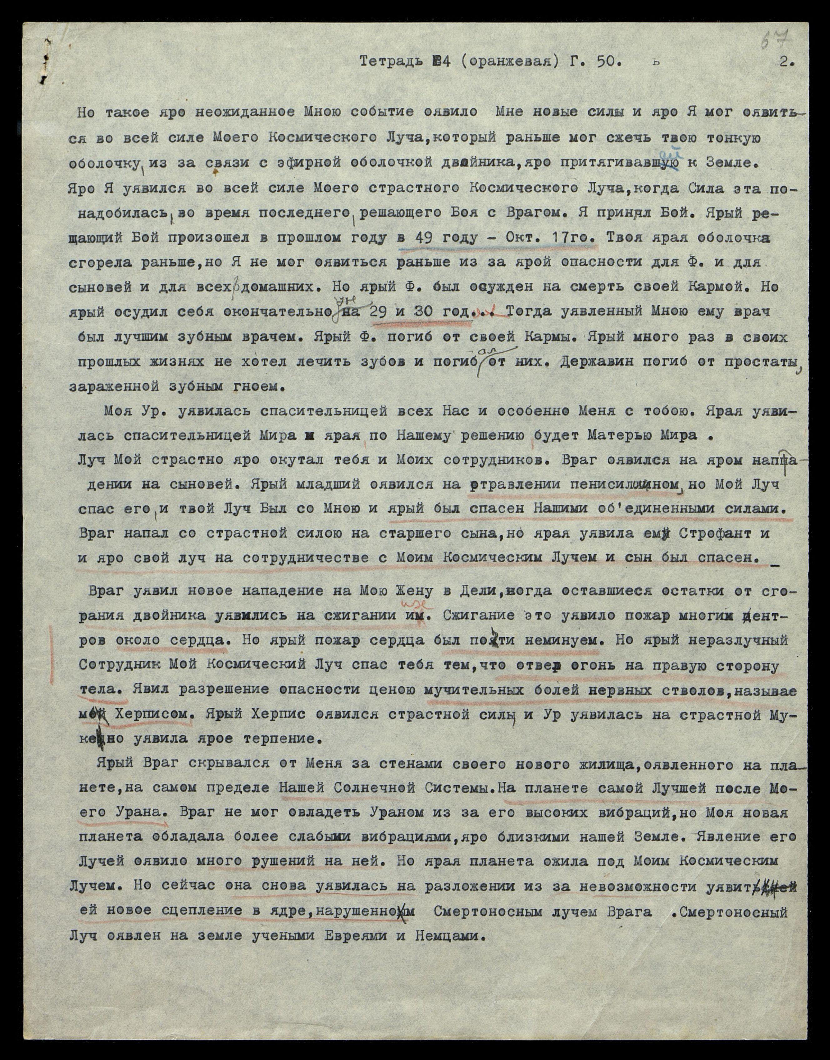 Но такое, яро неожиданное Мною событие, оявило Мне новые силы, и яро Я мог оявиться во всей силе Моего Космического Луча, который раньше мог сжечь твою тонкую оболочку из-за связи с эфирной оболочкой двойника, яро притягивавшей к Земле. Яро Я уявился во всей силе Моего страстного Космического Луча, когда Сила эта понадобилась во время последнего, решающего Боя с Врагом. Я принял Бой. Ярый решающий Бой произошёл в прошлом году, в 1949 году 17-го октября. Твоя ярая оболочка сгорела раньше, но Я не мог оявиться раньше из-за ярой опасности для Ф[уямы] и для сыновей, и для всех домашних. Но ярый Ф[уяма] был осужден на смерть своей Кармой. Но ярый осудил себя окончательно уже на 1929-й и 1930-й год. Тогда, уявленный Мною ему врач, был лучшим зубным врачом. Ярый Ф[уяма] погиб от своей Кармы. Ярый много раз в своих прошлых жизнях не хотел лечить зубов и погибал от них. Державин погиб от простаты, заражённой зубным гноем.