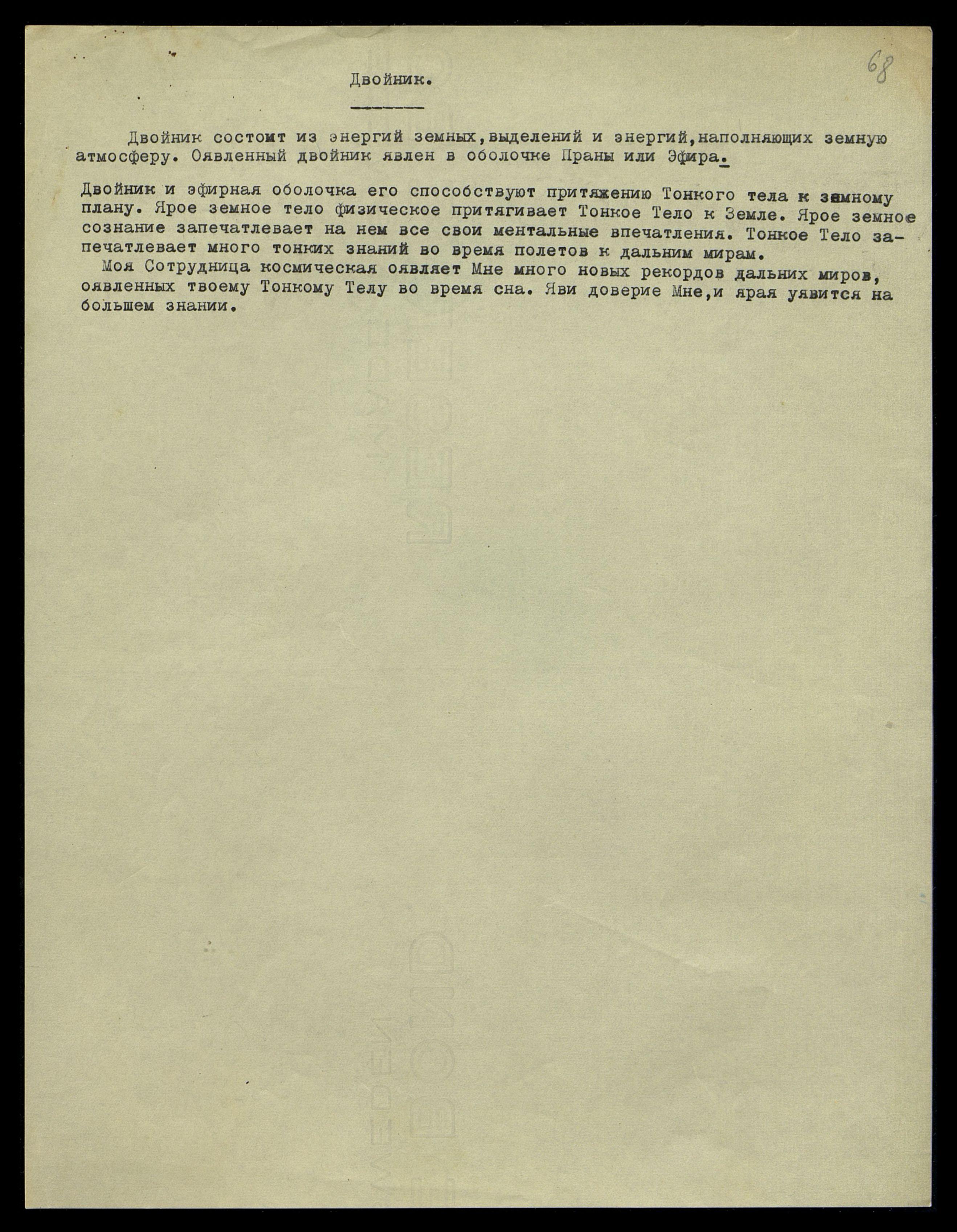Двойник состоит из энергий земных, выделений и энергий, наполняющих земную атмосферу. Оявленный двойник явлен в оболочке Праны, или Эфира.