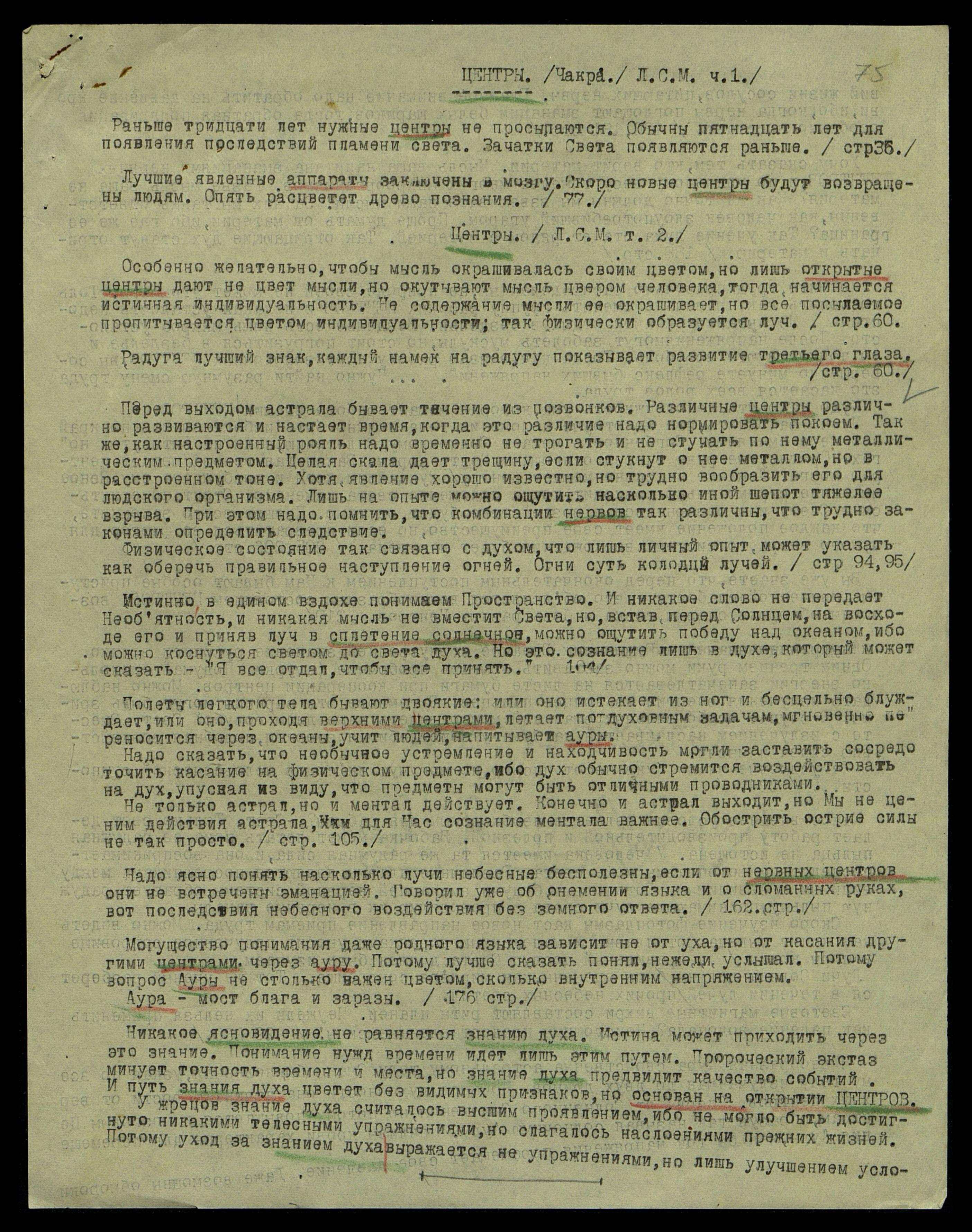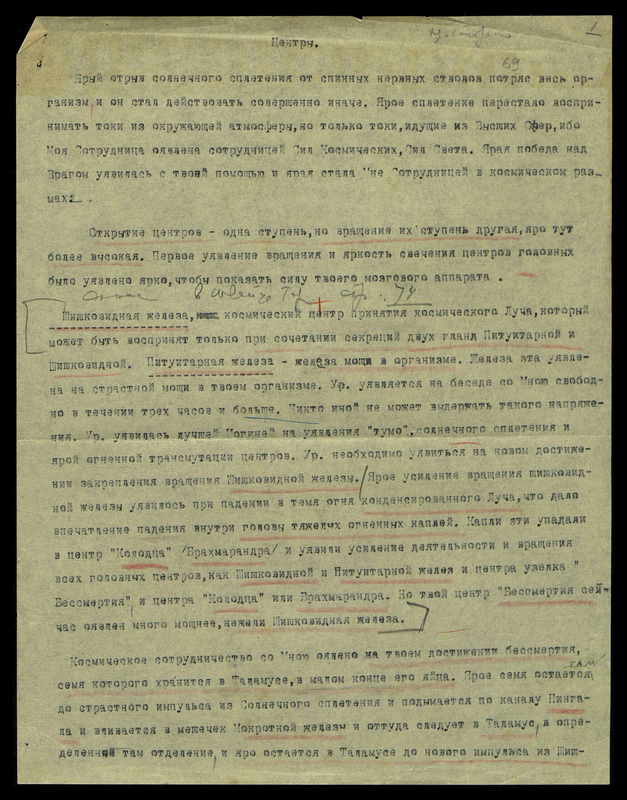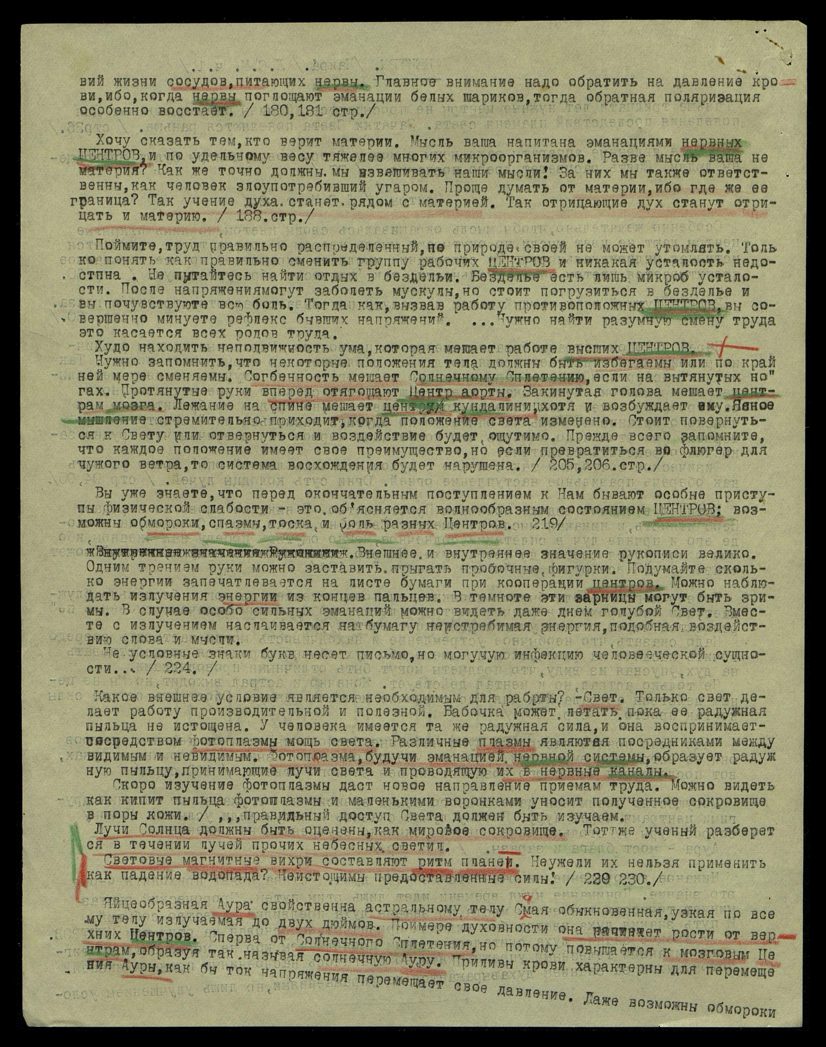 Внешнее и внутреннее значение рукописи велико. Одним трением руки можно заставить прыгать пробочные фигурки. Подумайте, сколько энергии запечатлевается на листе бумаги при кооперации центров. Можно наблюдать излучения энергии из концов пальцев. В темноте эти зарницы могут быть зримы. В случае особо сильных эманаций можно видеть даже днём голубой Свет. Вместе с излучением наслаивается на бумагу неистребимая энергия, подобная воздействию слова и мысли. Не условные знаки букв несёт письмо, но могучую инфекцию человеческой сущности (стр. 224).