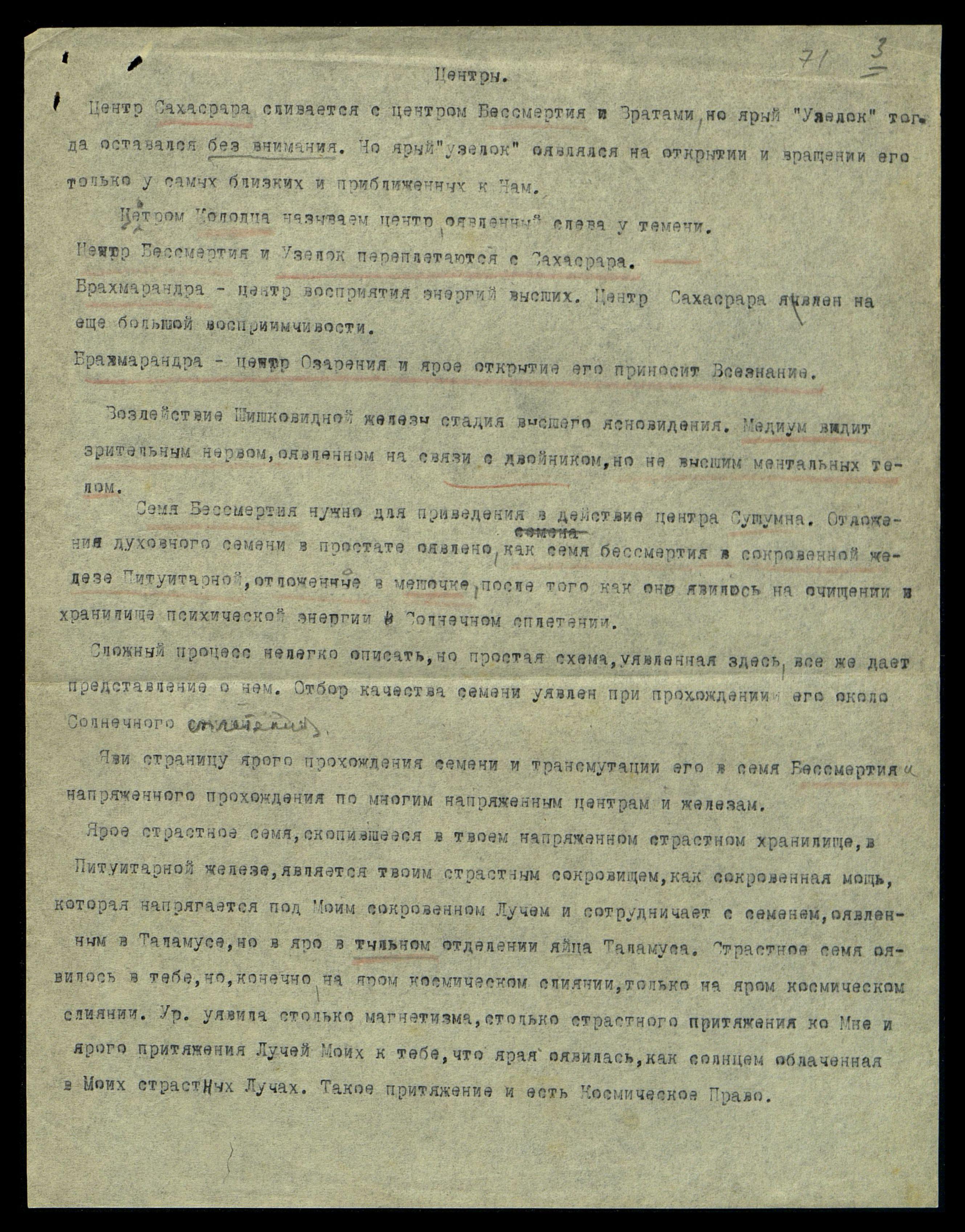Но ярое Сокровенное Семя, уявленное в ПЕРЕДНЕЙ части яйца Таламуса, оявляется снова на излиянии по каналу ИДА в страстную гланду простату* и яро подымается по каналу ПИНГАЛА в Средний Мозг, в Мокротную железу и её мешочек для нового отложения в ПЕРЕДНЕЙ части Яйца Тал[амуса] и затем снова по каналу ИДА оявляется в Средний Мозг, в Мокротной железе и на яром отложении в ЗАДНЕЙ части Яйца, и оттуда по нервной нити Вагуса оявляется в Солнечн[ом] Спл[етении], и яро оттуда по каналу Сушумна в Средн[ий] Мозг, но в Мокротную жел[езу], и для отложения семени в передней части Яйца для страстного там хранения его как страстной драгоценности.