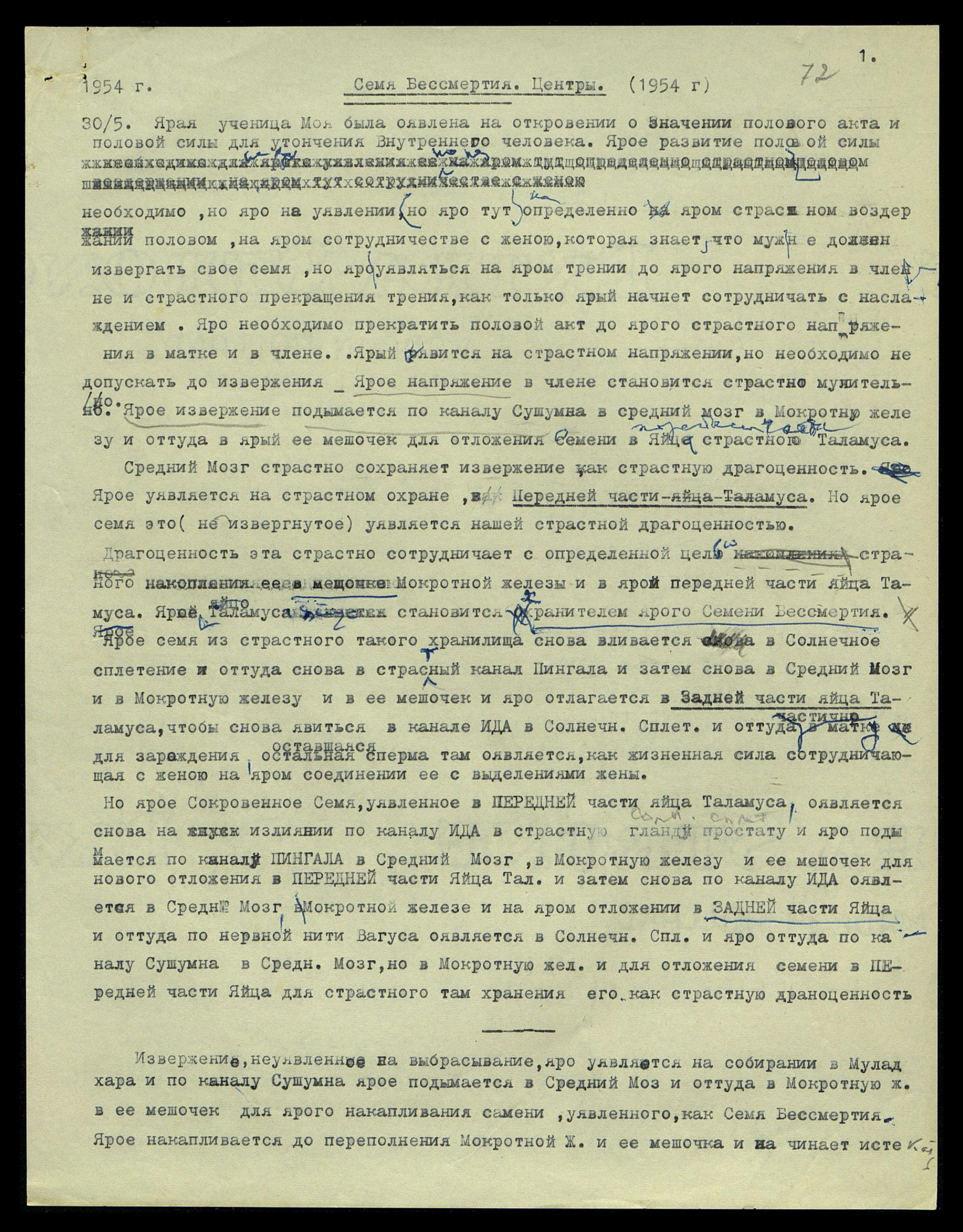 Но ярое новое семя, полученное из Мокротной железы, после её переполнения в мешочке, яро изливается или в переднюю часть отделения яйца Таламуса, или же спускается по каналу Ида в Солнечное Сплетение и яро там не только страстно задерживается, но яро там и происходит отбор семени, которое идёт частично в простату и яро извергается, а другая часть, оставшаяся в Солнечном Спл[етении], подымается по каналу ПИНГАЛА в заднюю часть яйца и яро снова ожидает там накопления для его извержения путём простаты или для нового истечения его в канал ИДА и ярого подъёма из полового аппарата Швадистаны в средний Мозг и в ярую Мокротную жел[езу] по каналу Пингала, но уже в заднюю часть яйца Таламуса, и яро оттуда по каналу Ида в Солнечное Сплетение и яро остаётся до переполнения Солн[ечного] Спл[етения], и яро снова оявляется на подъёме по каналу Сушумна, и яро в случае ярого сдерживания (и сокращения полового нерва) вливается в Средн[ий] Мозг, в мешочек Мокротной железы, где ярое хранится, как страстная драгоценность.