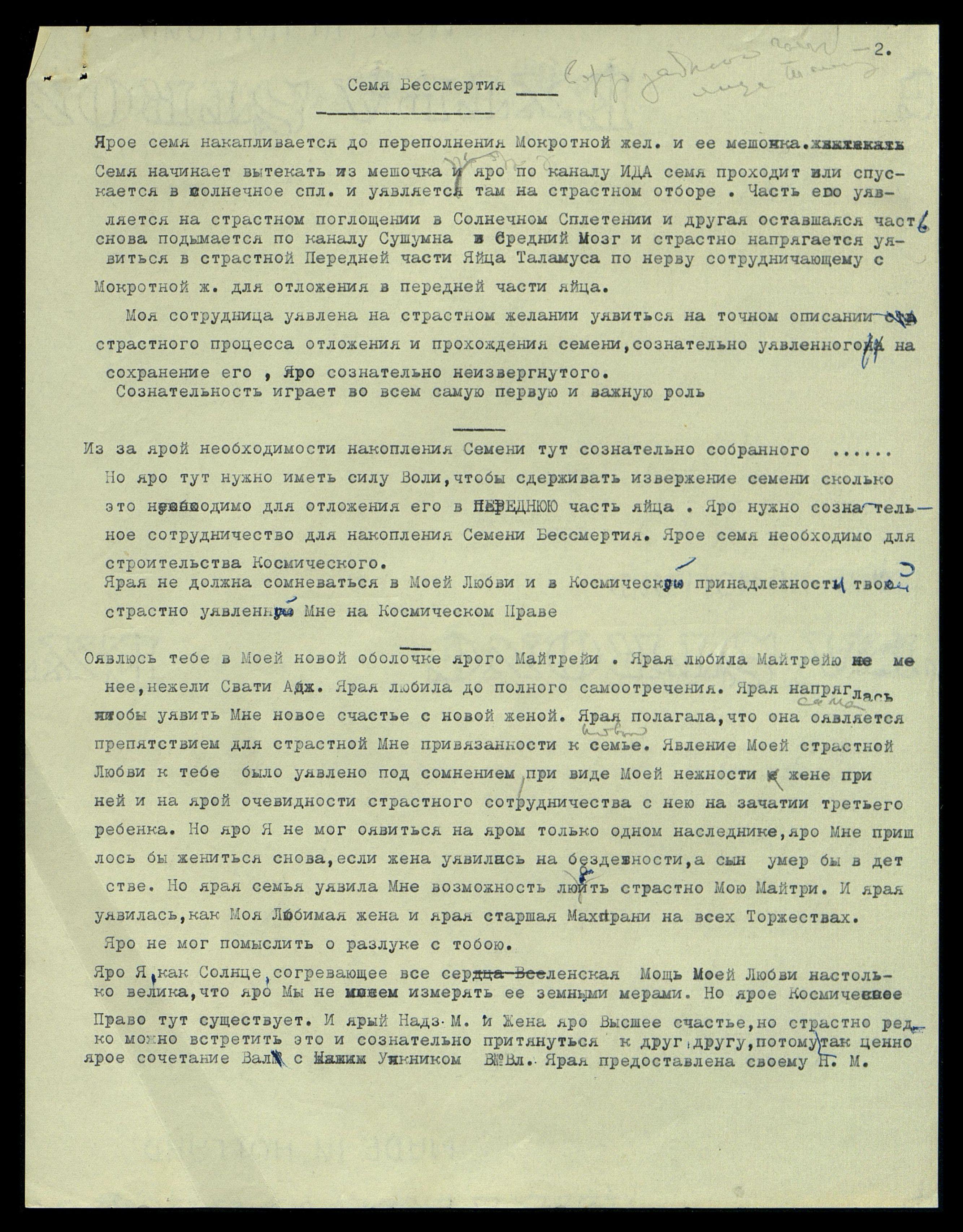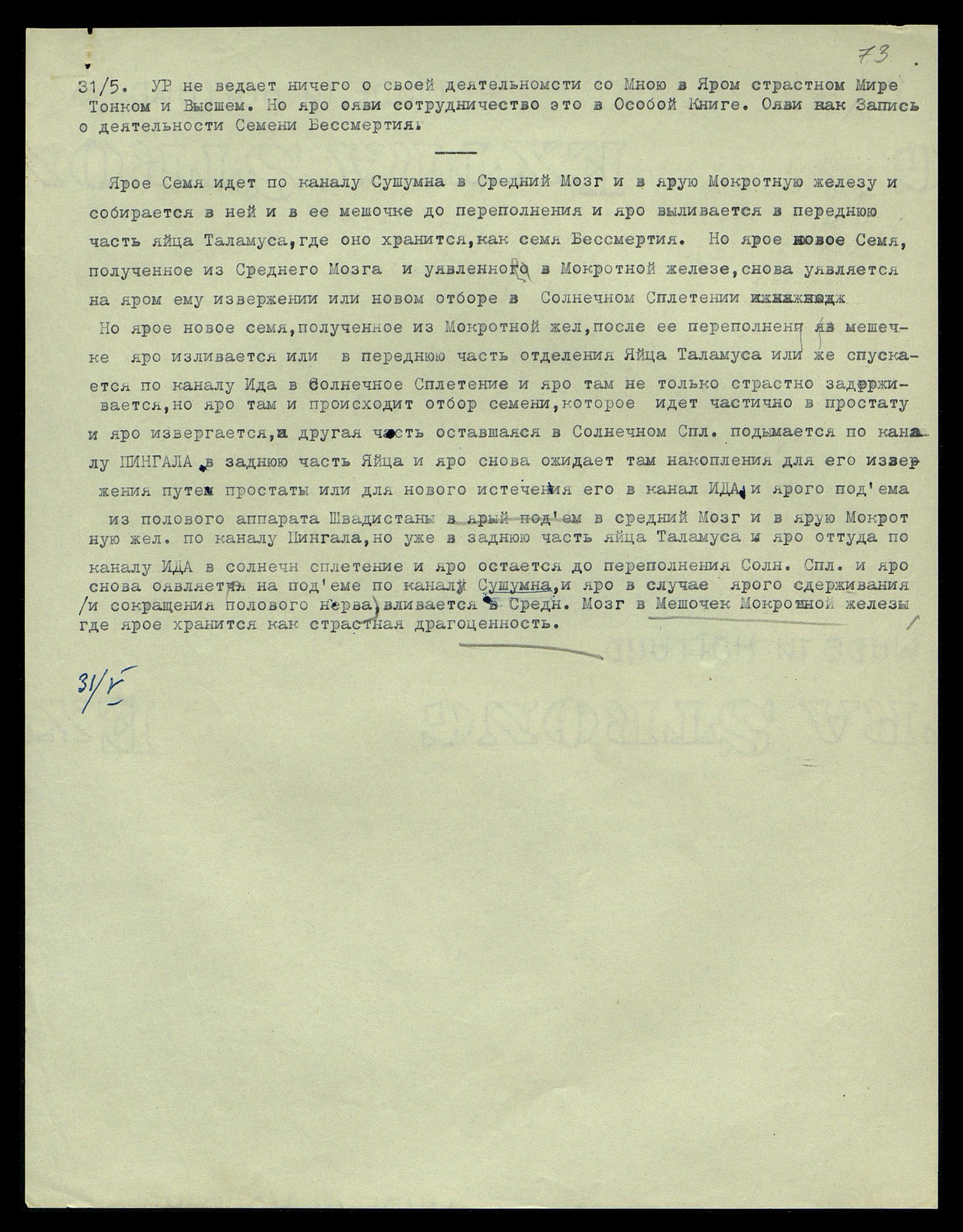 Ярое семя из страстного такого хранилища снова вливается в Солнечное Сплетение и оттуда снова в страстный канал Пингала, и затем снова в Средний Мозг и в Мокротную железу, и в её мешочек, и яро отлагается в задней части яйца Таламуса, чтобы снова явиться в канале ИДА в Солнечн[ом] Сплет[ении] и оттуда частично в матку для зарождения, остальная оставшаяся сперма там оявляется, как жизненная сила, сотрудничающая с женою на яром соединении её с выделениями жены.