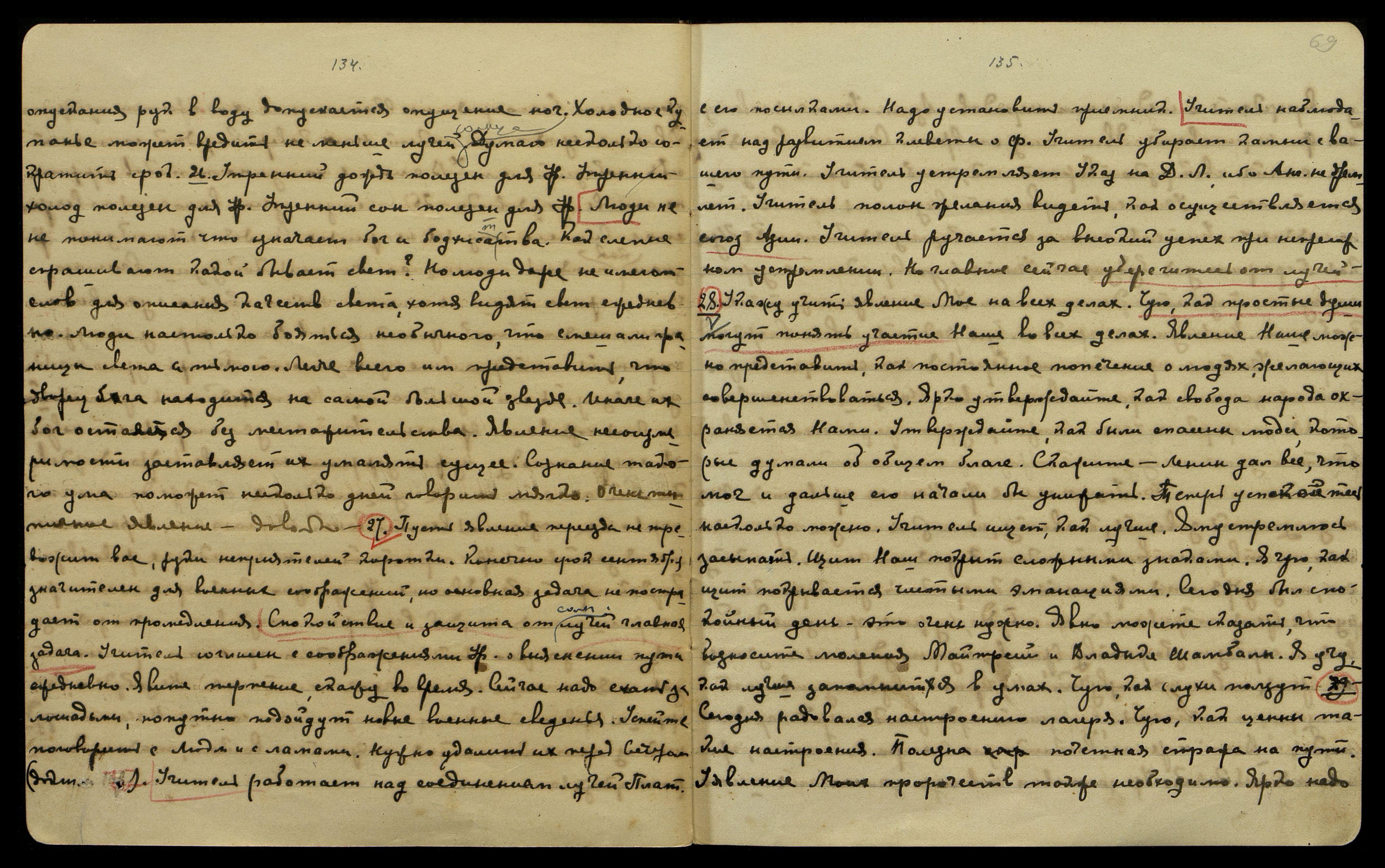 30/V. Ущемление Ф[уямы] Нам не нравится. Можно допустить зависть, клевету, но низкие люди переносят это на творчество. Нет никого поднять голос. Диктуем, но умудряются обратить в клерикальную карикатуру. Не время покрываться Хр[истом] и Будд[ою], нужнее железное действие и сарказм убожеству врагов. Нужно ударить по земле, не время небесных созвучий! Но черные звезды изливают ненужную тягость. Разрушать художника перед народом низко! "Вот горе-то!" − воскликнула Сестра О[риола]. Конечно, присоединяюсь к ней. Уже заставил навсегда замолчать шесть человек, но невозможно устилать путь мертвыми. Устремление низких бывает настолько сильно, что шея легче свернется, нежели ум прояснится. Ярость озлобления до сих пор сильнее, нежели конфузливость друзей. Мирное настроение лагеря помогает Нашей борьбе.