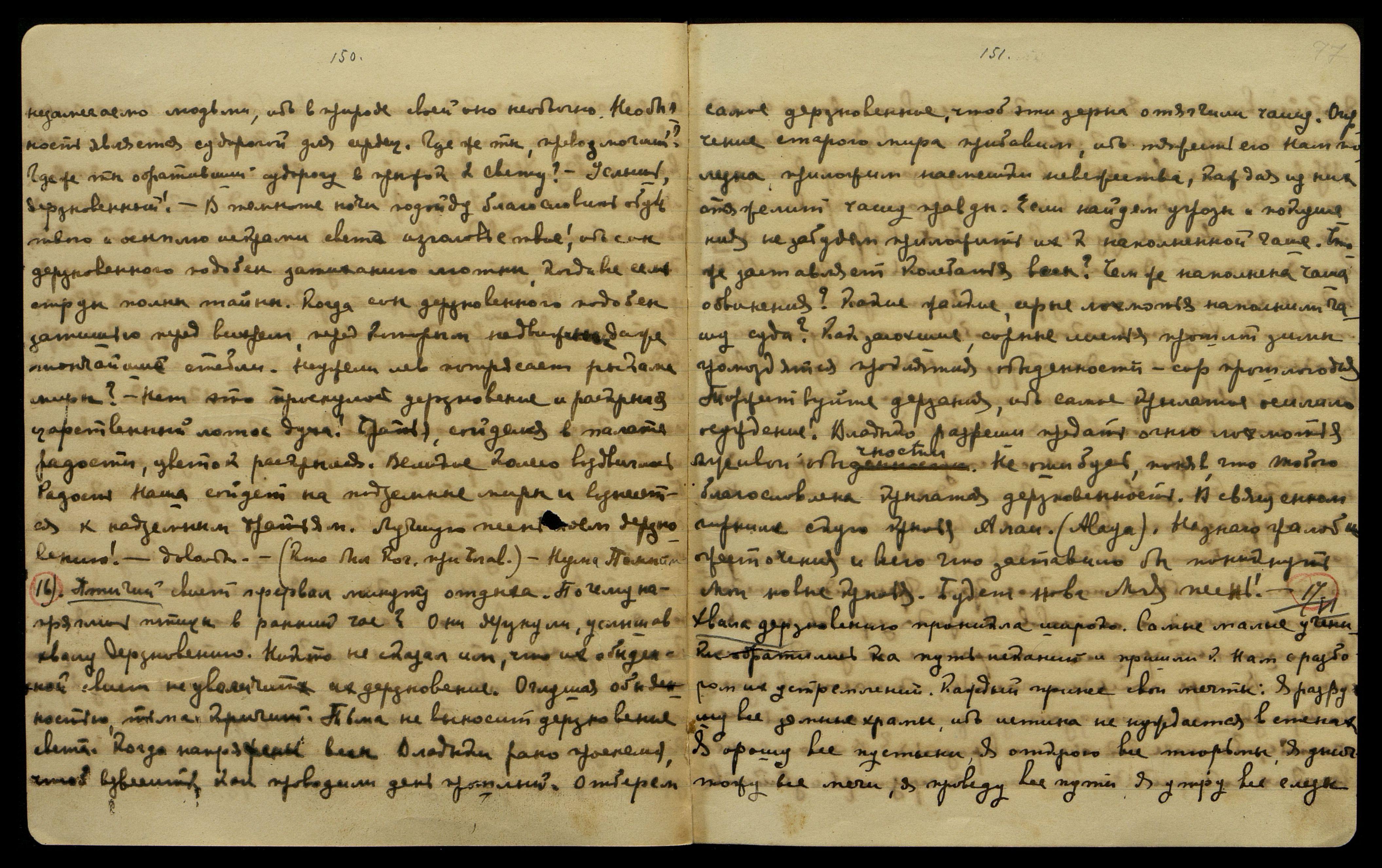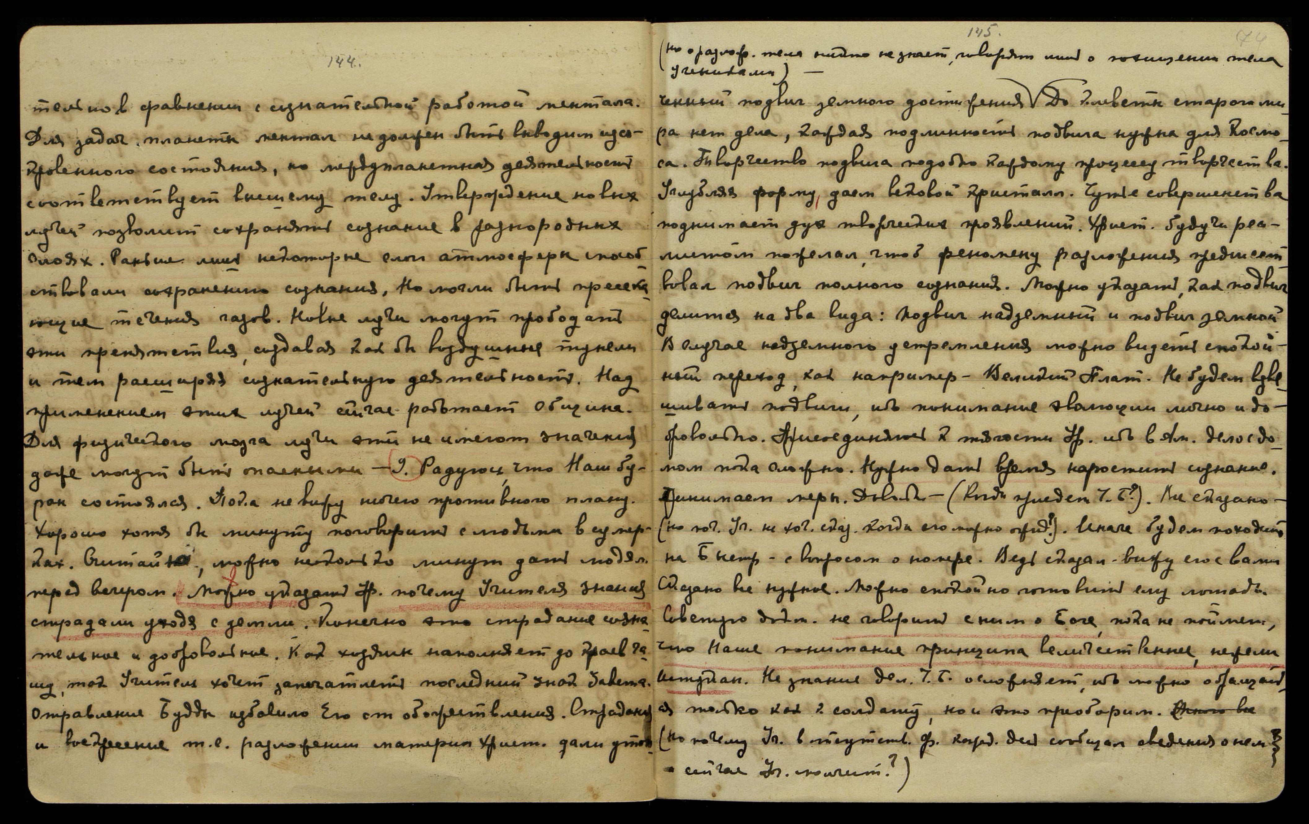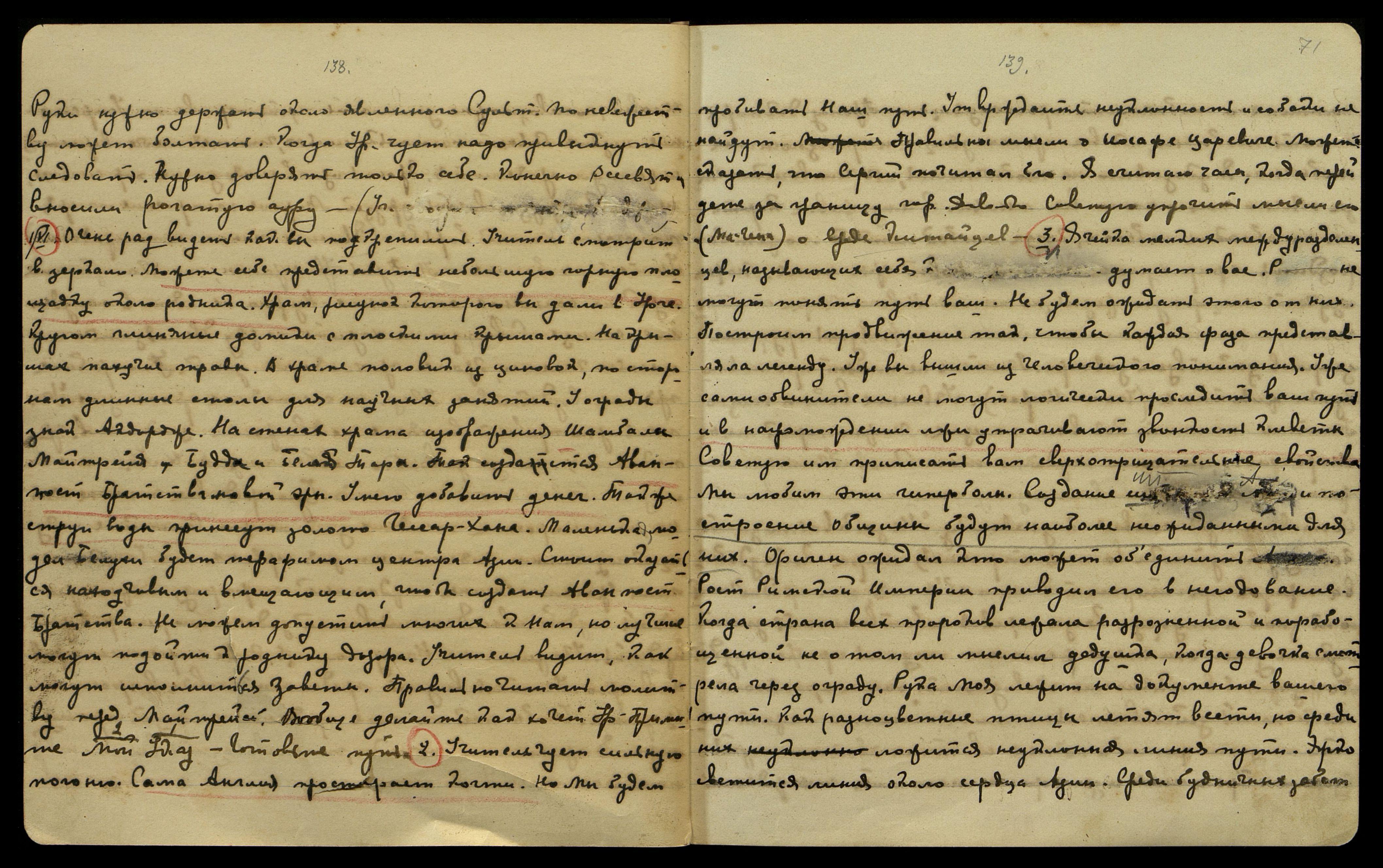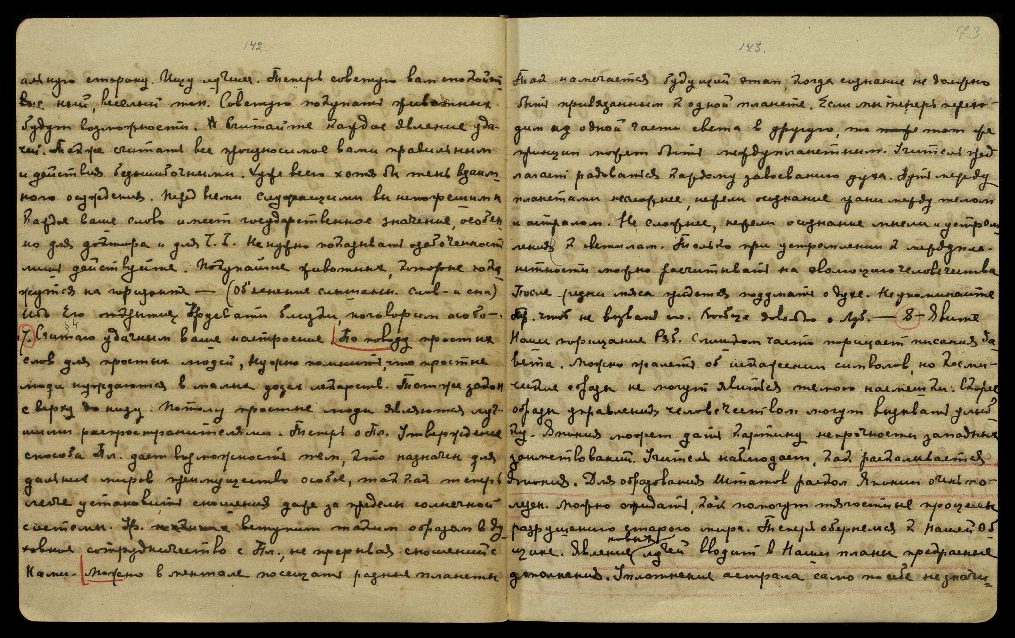 — До клеветы старого мира нет дела, каждая подлинность подвига нужна для Космоса. Творчество подвига подобно каждому процессу творчества. Углубляя форму, даем вековой кристалл. Чутье совершенства поднимает дух творческих проявлений. Христ[ос], будучи реалистом, пожелал, чтоб феномену разложения [тела на атомы] предшествовал подвиг полного сознания. Можно указать, как подвиг делится на два вида: подвиг надземный и подвиг земной. В случае надземного устремления можно видеть спокойный переход, как, например, Великий Плат[он]. Не будем взвешивать подвиги, ибо понимание эволюции лично и добровольно.