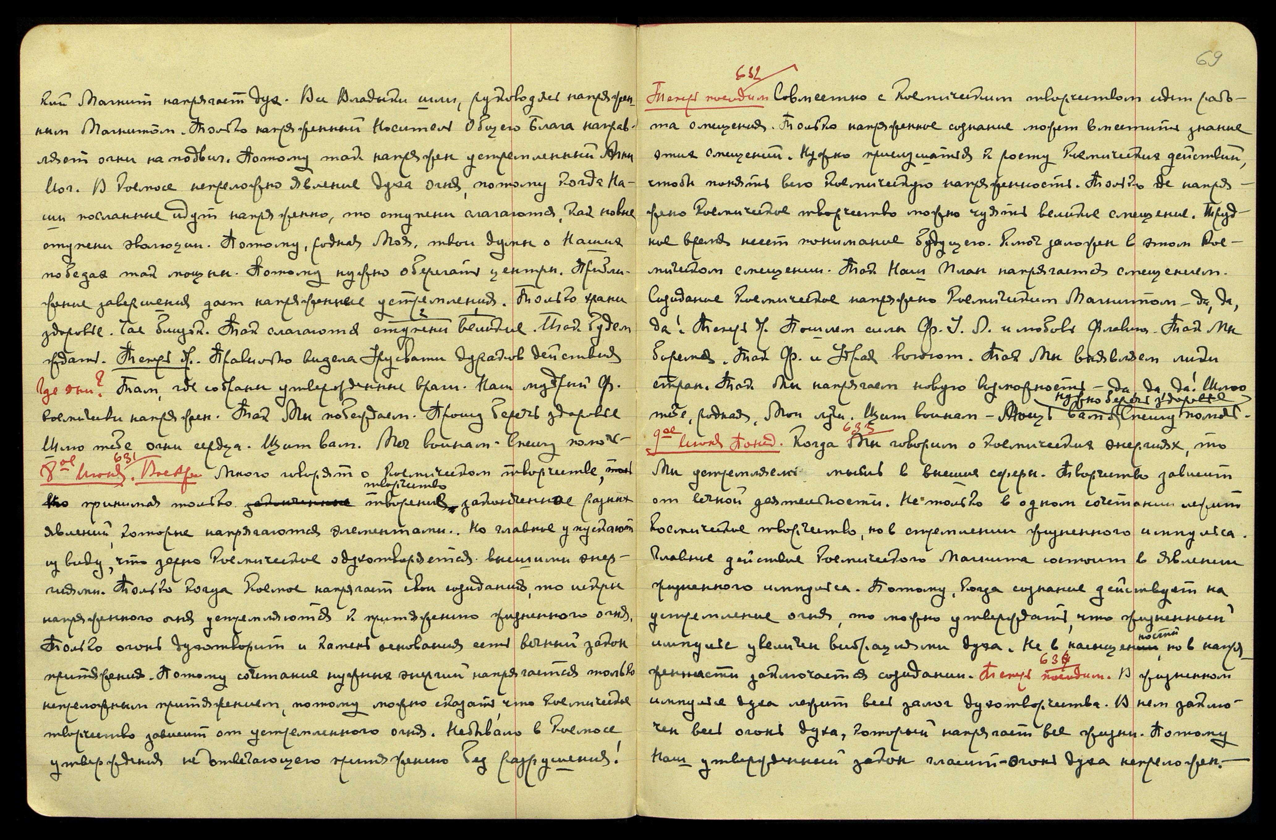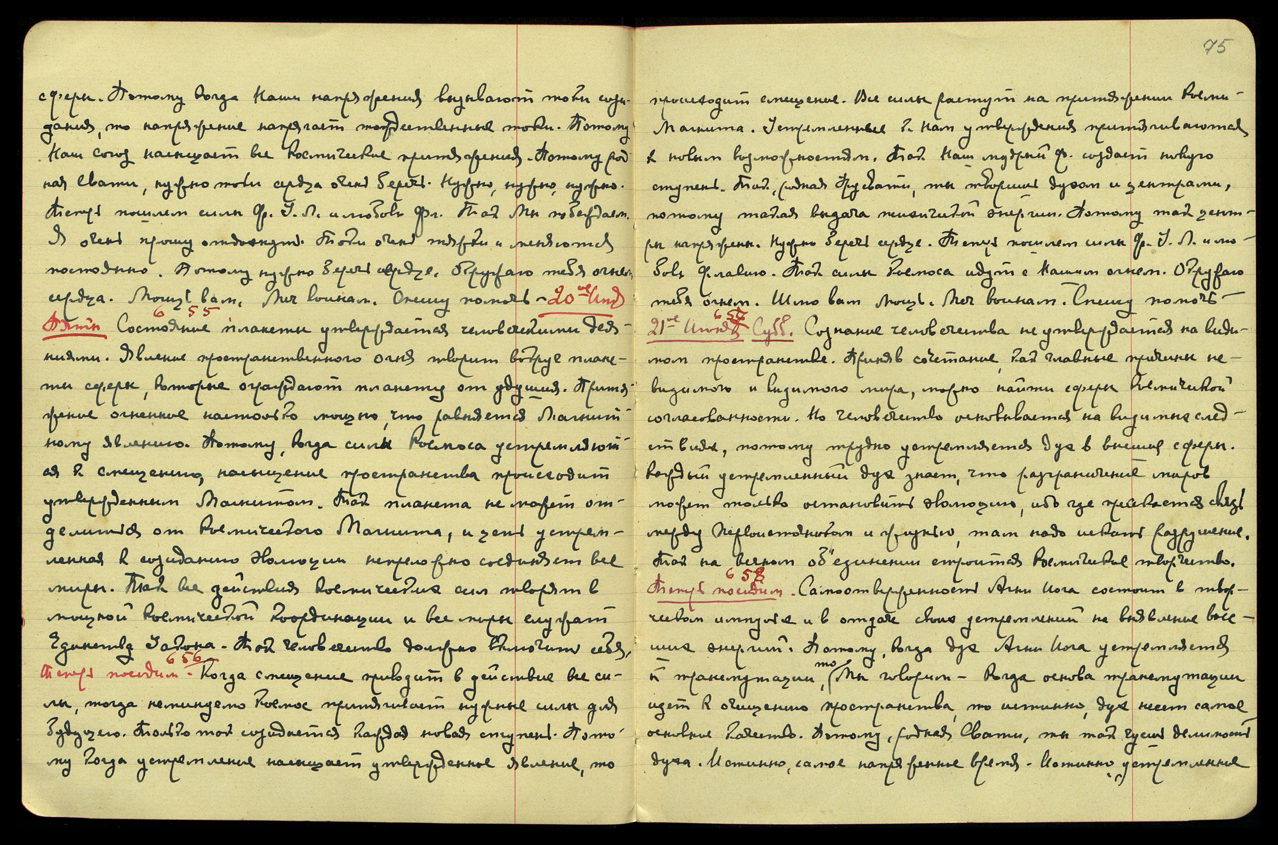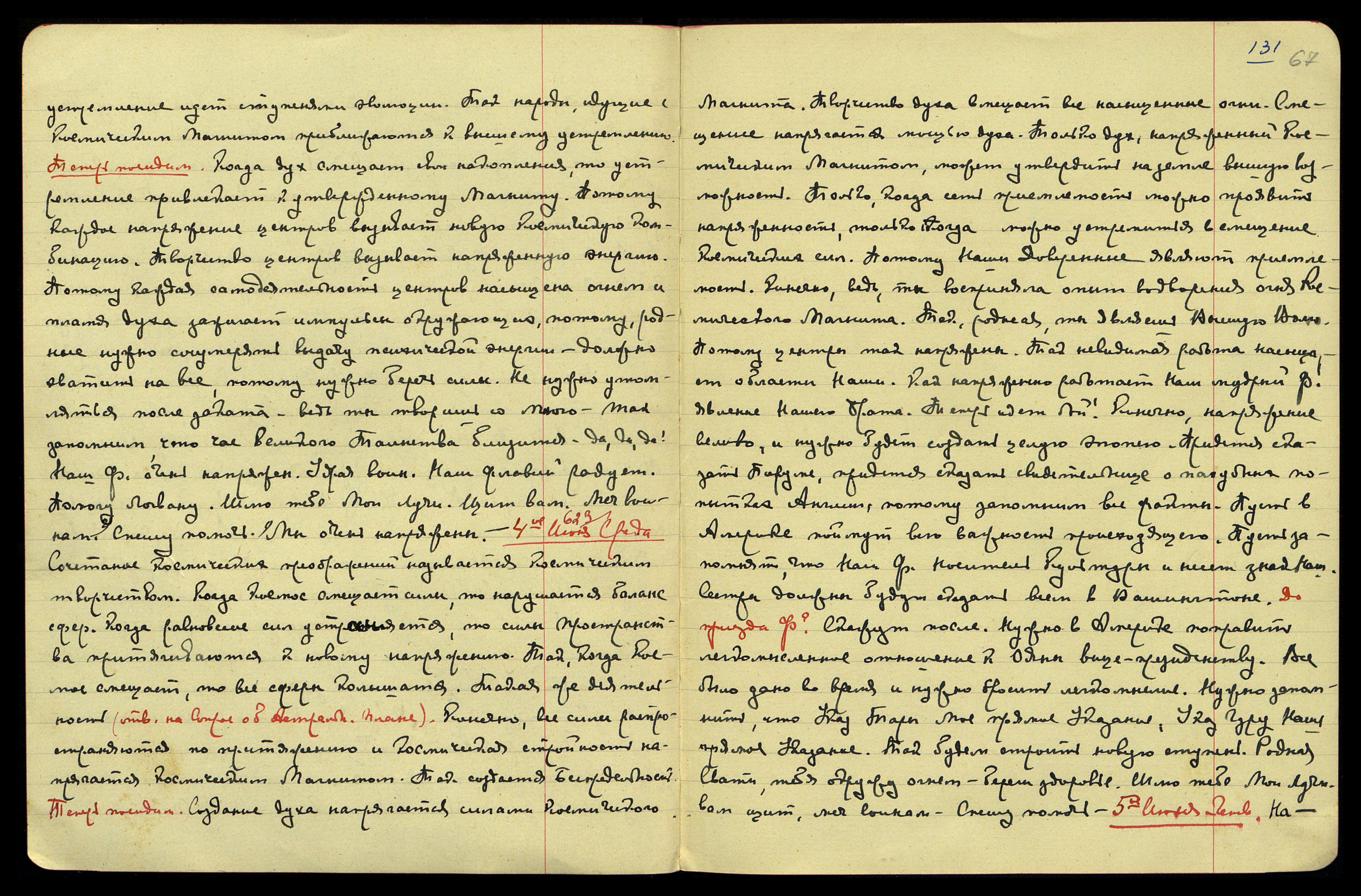 6 июня. Пятн[ица]. [Беспредельность] § 627. Собирая космические энергии, Магнит напрягает создания огня. Каждая энергия притягивает свои токи. Так несоответствие между духом и материей напрягает устремление к преображению, в этом преображении заключается вся космическая действительность. Потому, когда дух напрягается в истинном искании, он притягивает новые возможности. Так беспредельно творчество Космоса! Теперь посидим. [Беспредельность] § 628. Дух, преображающий сознания, называется творцом людей. Когда Наш Носитель огня утверждает эти напряжения, тогда явление вместе с Нами притягивает новые возможности. Так, родная Моя, ты творишь со Мною, так ты несёшь полную Чашу. Но нужно беречь центры. Токи очень тяжки и лучше не работать днем совместно. Нужно переждать несколько дней. Центр Чаши очень напряжён. Прошу беречь здоровье. Сон очень полезен. Лучше раньше ложиться. Блюду тебя. Мощь с вами. Щит воинам. Окружаю тебя лучами Сердца. Наш мудрый Ф[уяма] космически напряжен. Спешу помочь.