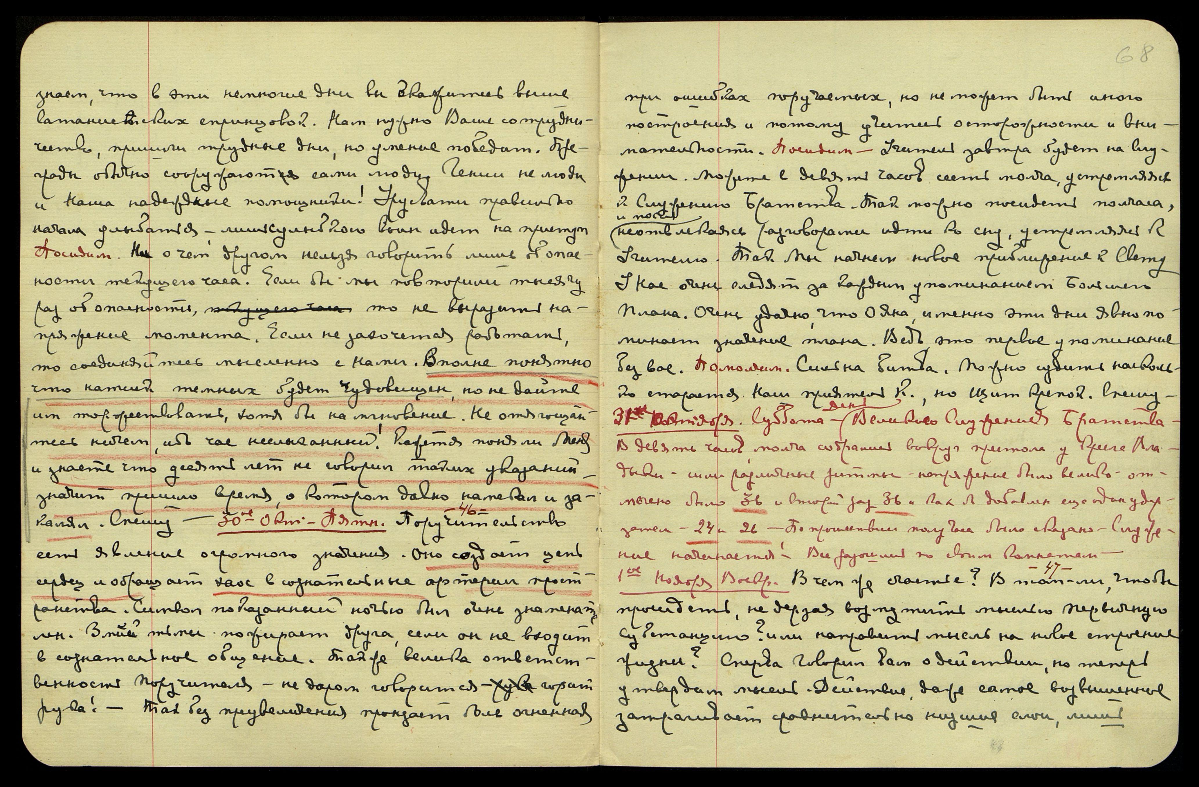 1-ое ноября. Воскр[есенье]. [Сердце] § 47. В чём же счастье? В том ли, чтобы просидеть, не дерзая возмутить мыслью Первичную Субстанцию? Или направить мысль на новое строение жизни? Сперва говорил вам о действии, но теперь утвердим мысль. Действие, даже самое возвышенное, затрагивает сравнительно низшие слои; лишь