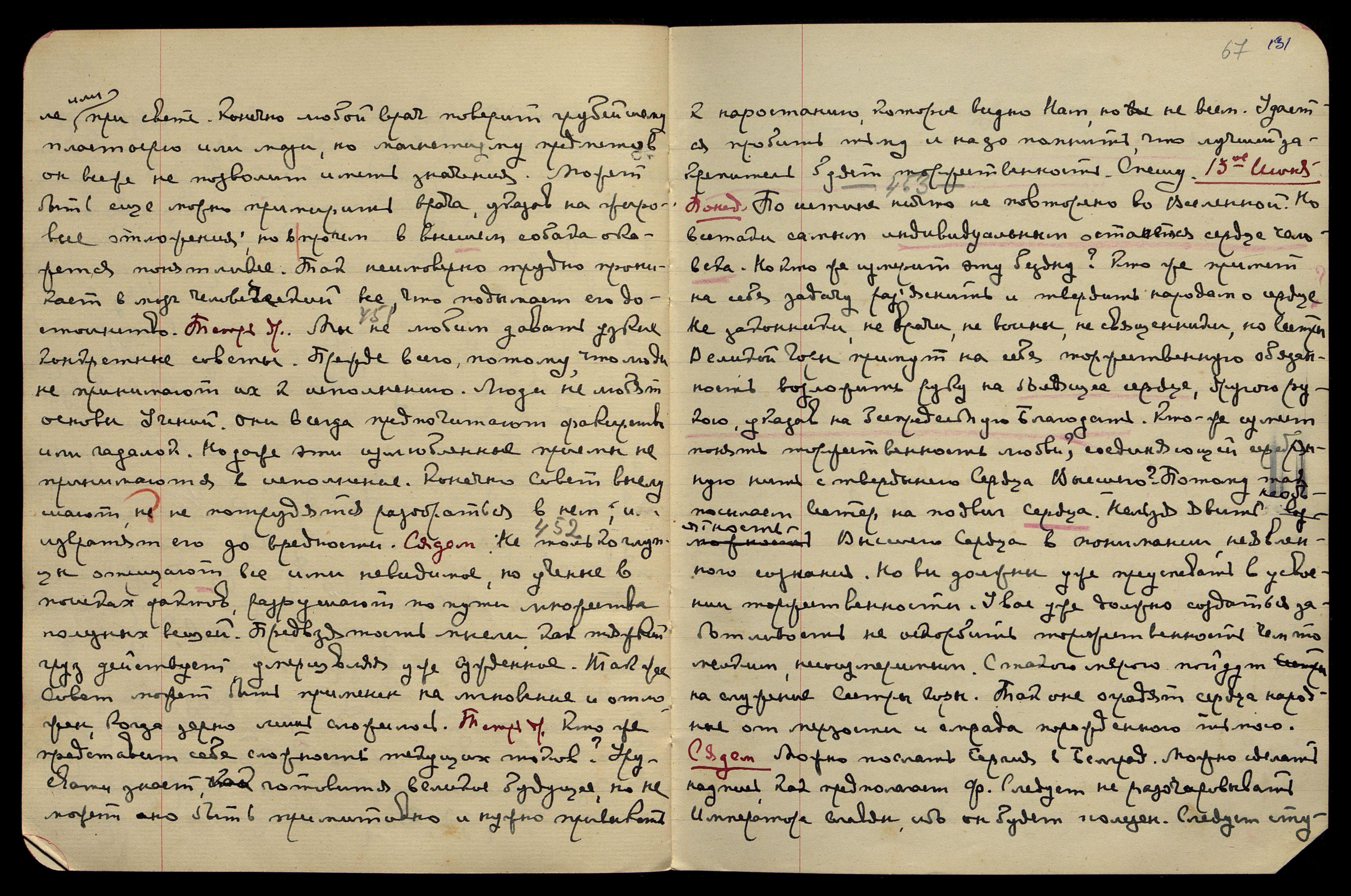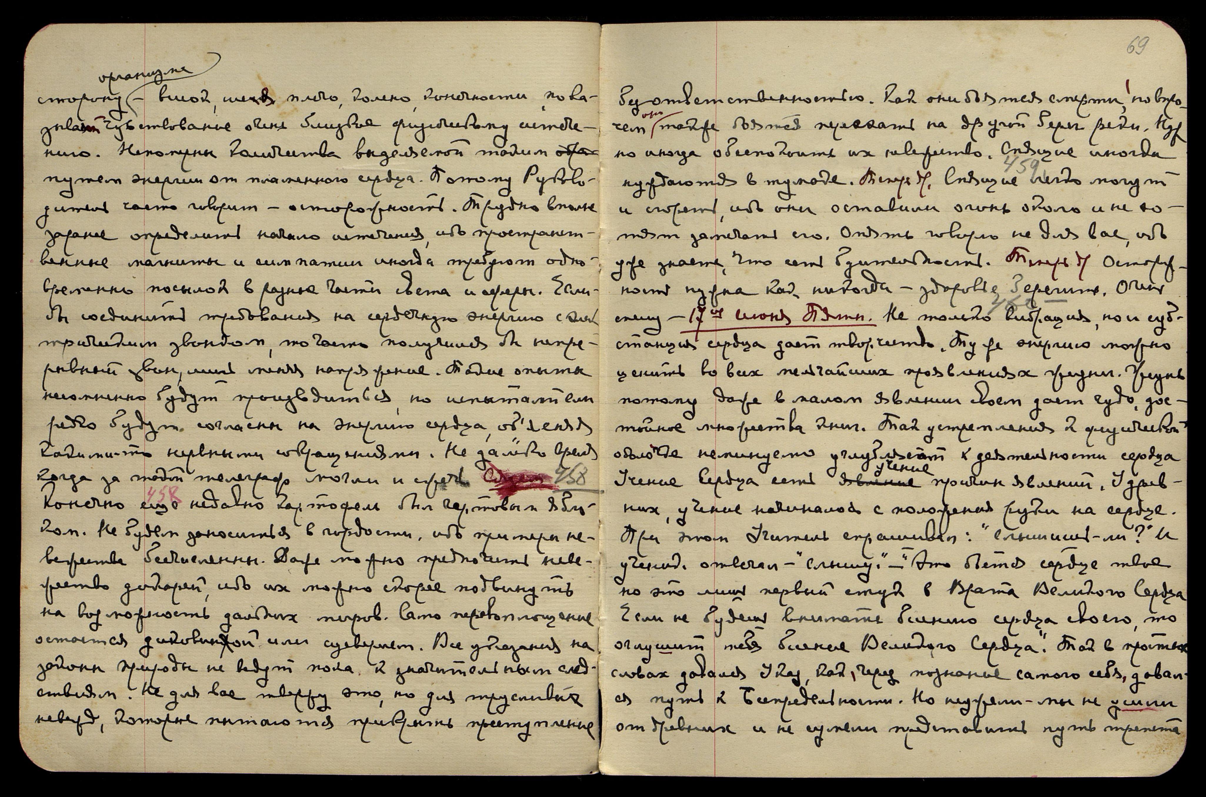 13-ое июня. Понед[ельник]. [Сердце] § 453. Поистине, ничто не повторено во Вселенной, но всё-таки самым индивидуальным останется сердце человека. Но кто же измерит эту бездну? Кто же примет на себя задачу разъяснить и твердить народам о сердце? Не законники, не врачи, не воины, не священники, но Сёстры Великой Горы примут на себя торжественную обязанность возложить руку на болящее сердце, другою рукою указав на беспредельную Благодать. Кто же сумеет понять торжественность любви, соединяющей серебряную нить с твердынею Сердца Высшего? Потому так посылаем Сестёр на подвиг Сердца. Нельзя явить необъятность Высшего Сердца в понимании не явленного сознания. Но вы должны уже преуспевать в усвоении торжественности. У вас уже должна создаться заботливость не оскорбить торжественность чем-то мелким, несоизмеримым. С такою мерою пойдут на служение Сёстры Горы. Так они оградят сердца народные от мерзости и смрада, порождённого тьмою. Сядем. Можно послать "Сергия" в Белград. Можно сделать надпись, как предполагает Ф[уяма]. Следует не разочаровывать Императора славян, ибо он будет полезен. Следует сту-